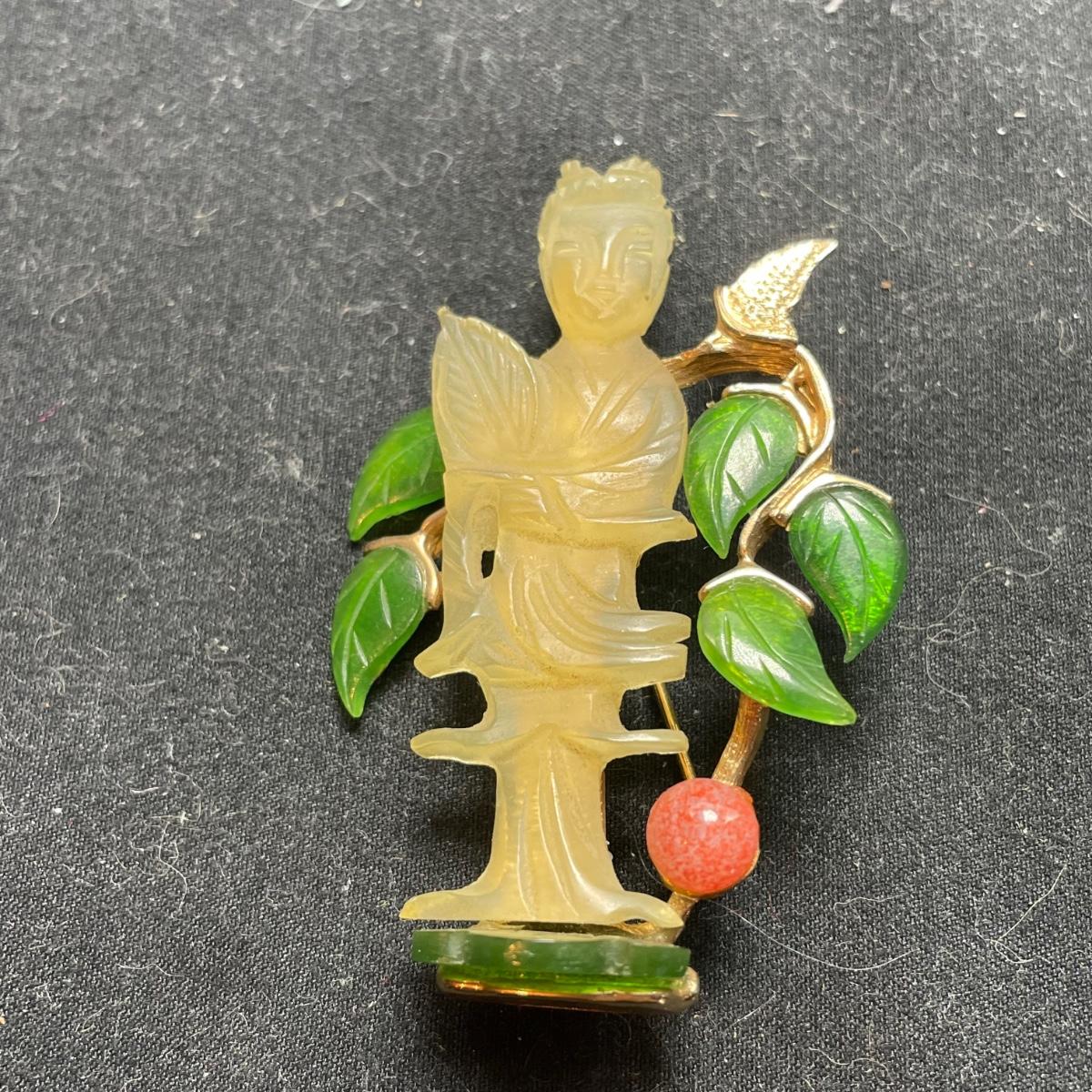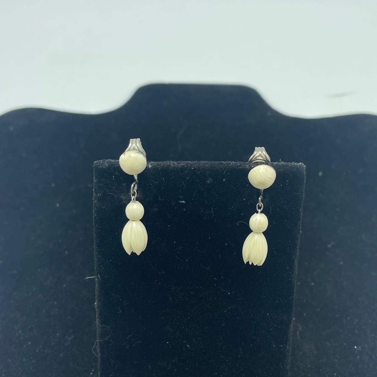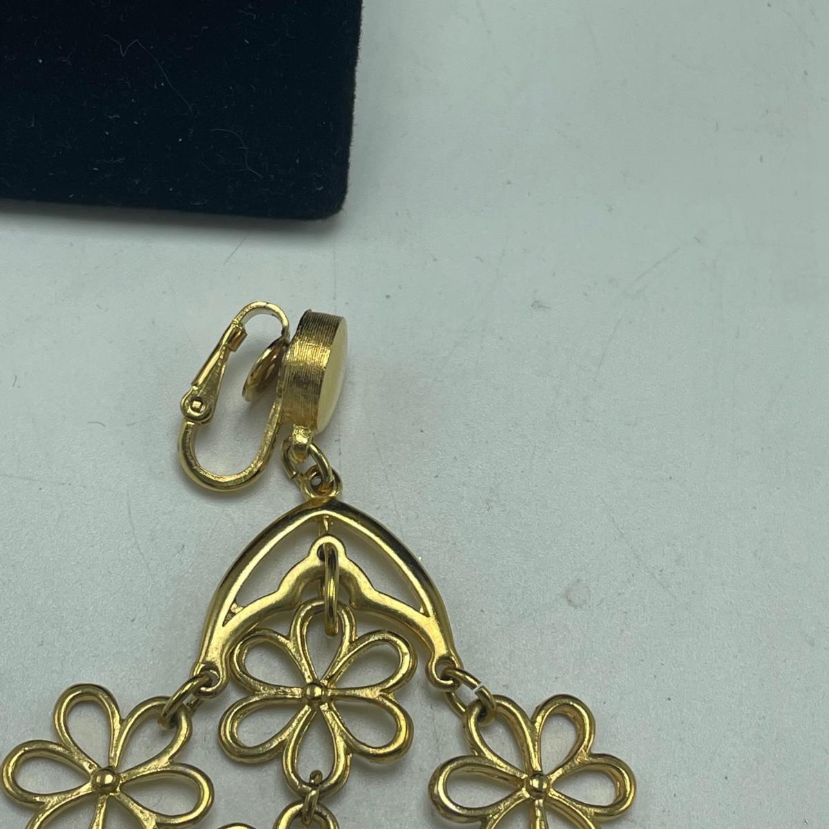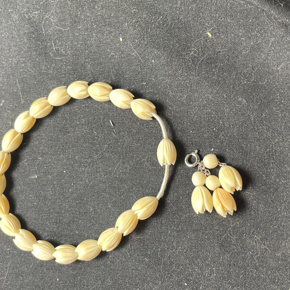 Three gorgeous jewelry sets for you here. The ivory-like set has clip on earrings that are marked sterling as does the piece that has three flowers; the bracelet is on an elastic band and no mark was found on the pendant. The jade colored set includes a brooch and clip on earrings and there is also a copper/jade colored stone bracelet and a cross pendant that are very similar to each other, but not part of the set. Lastly there is a gold colored necklace with floral design that comes with matching clip on earrings. Necklace chain measures 18” long.