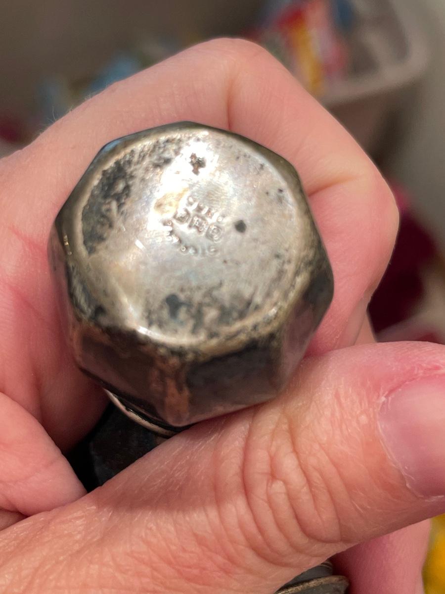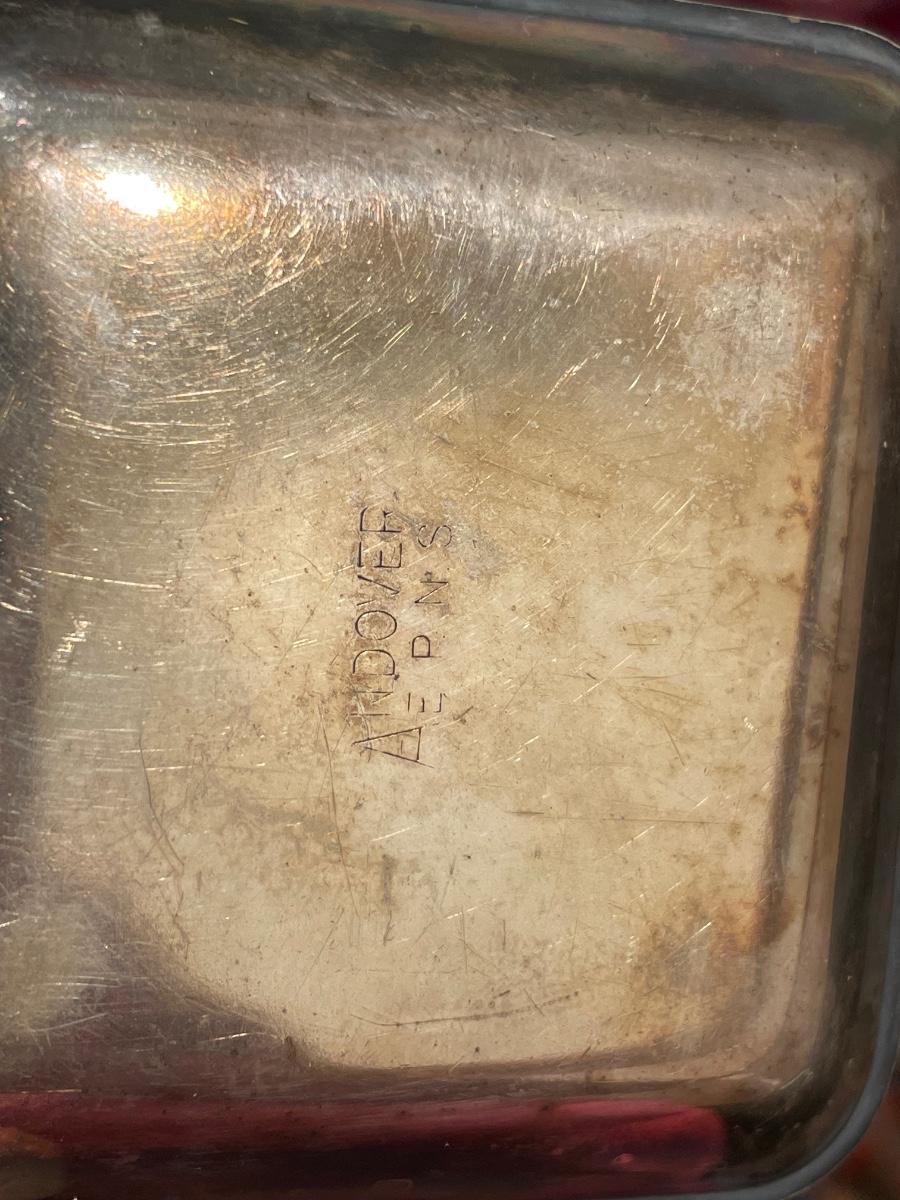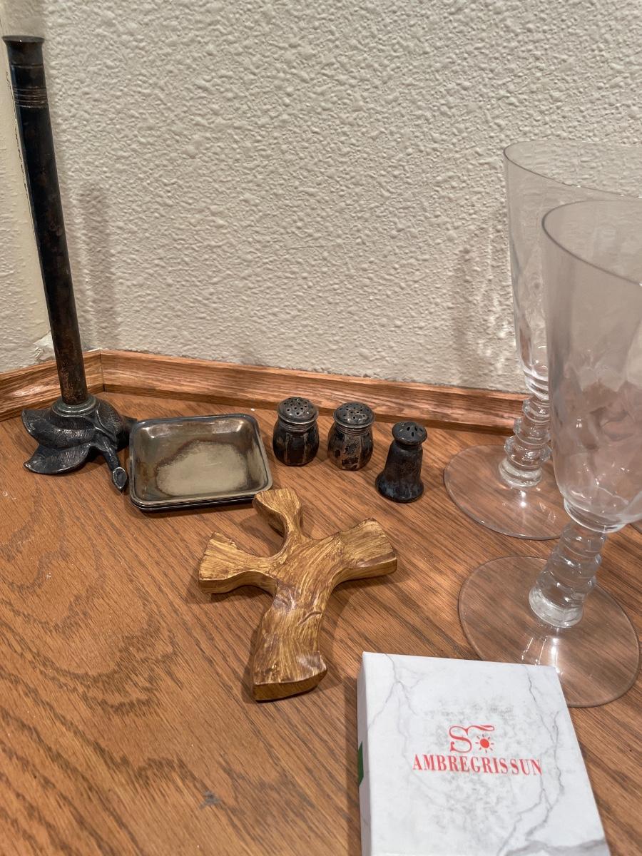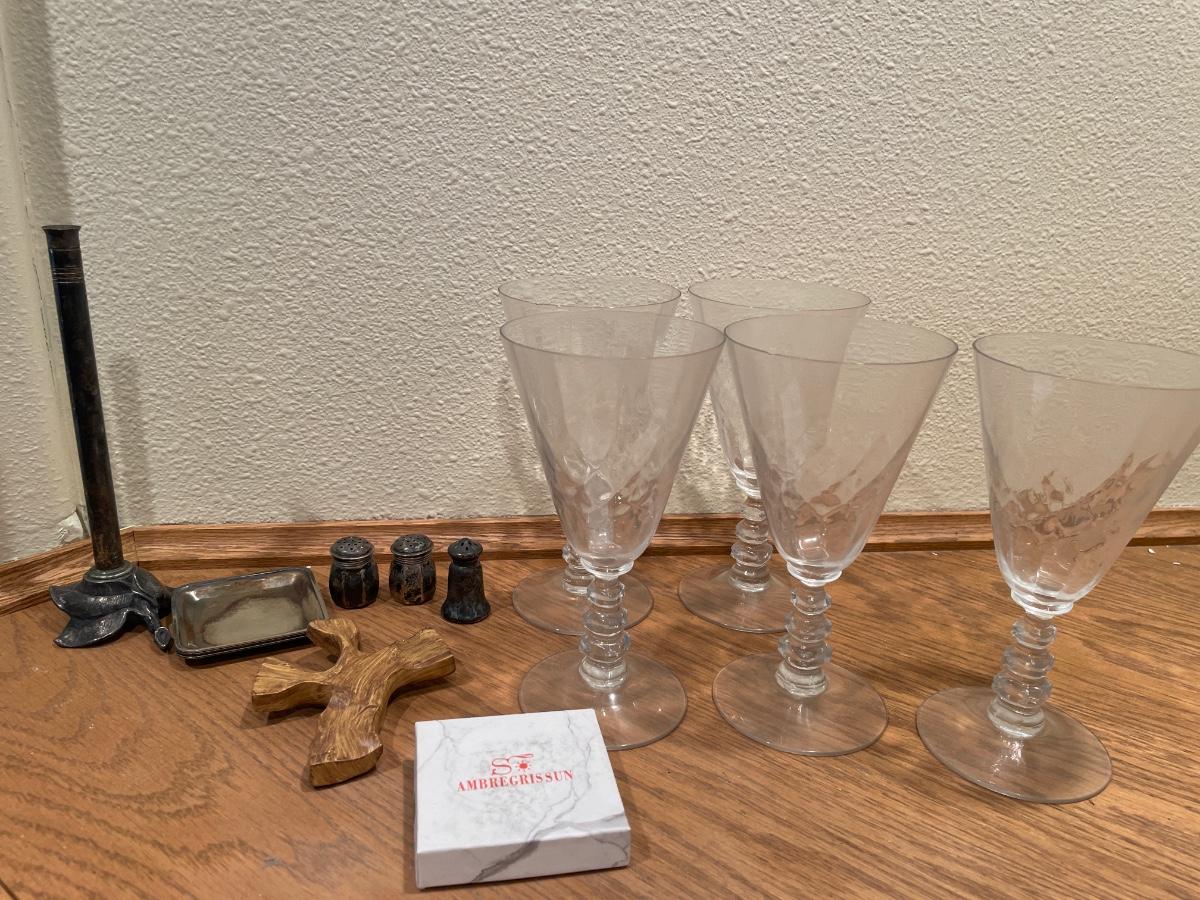 Sterling shakers, small square dishes and tall leaf vase with glassware