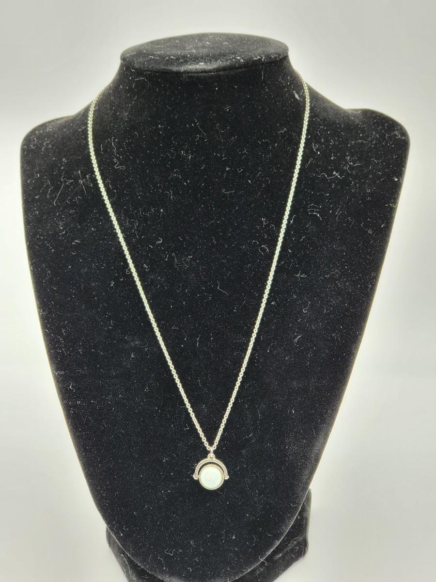 This is a beautiful necklace that is two sided and swivels. One side is opal and the other I believe is rhinestone.