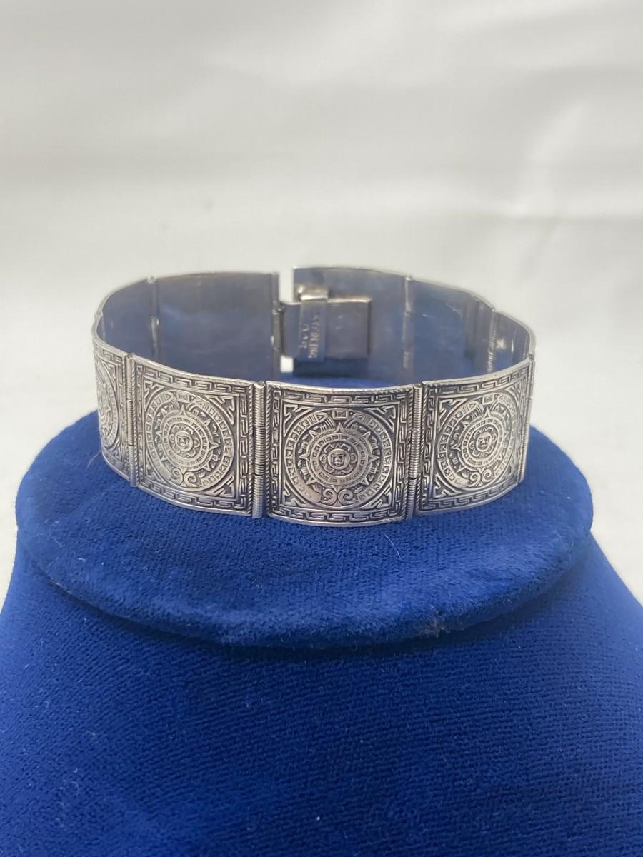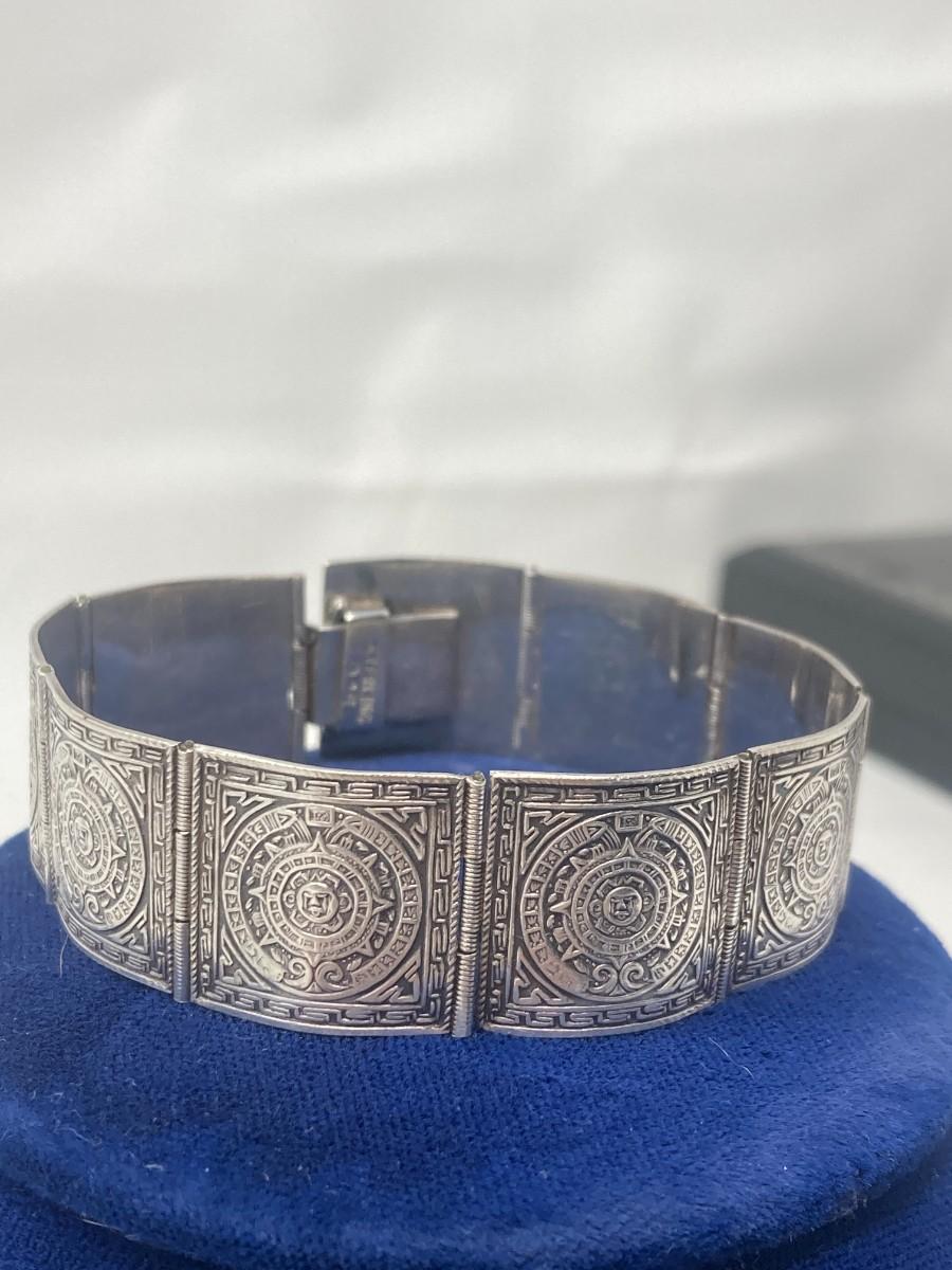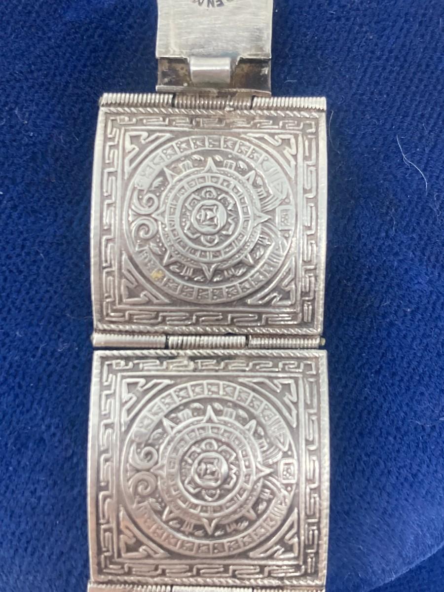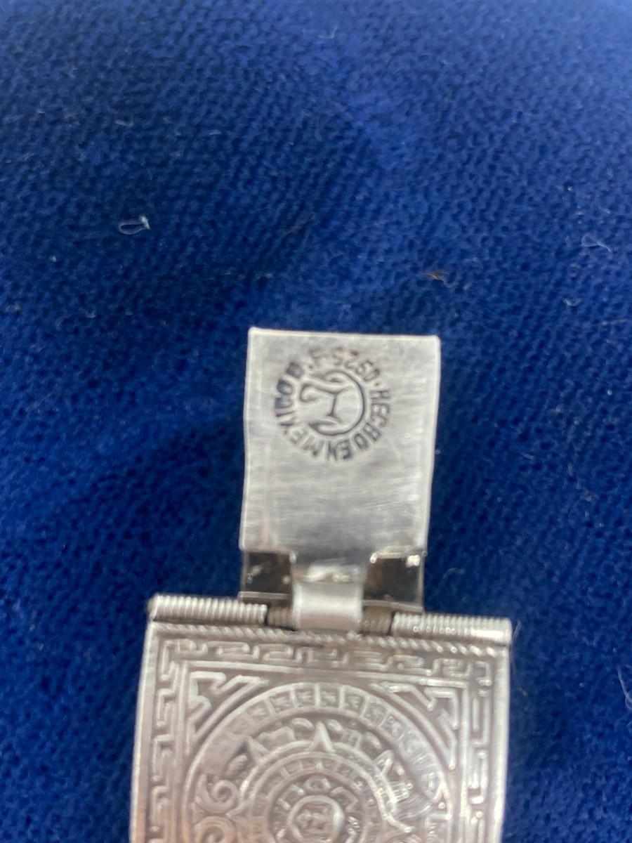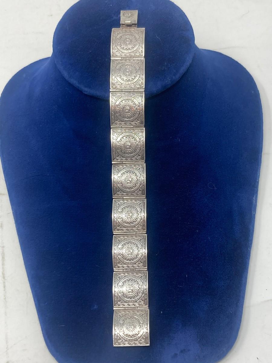Sterling Silver Aztec Calendar, hinged bracelet. 26.78 grams.