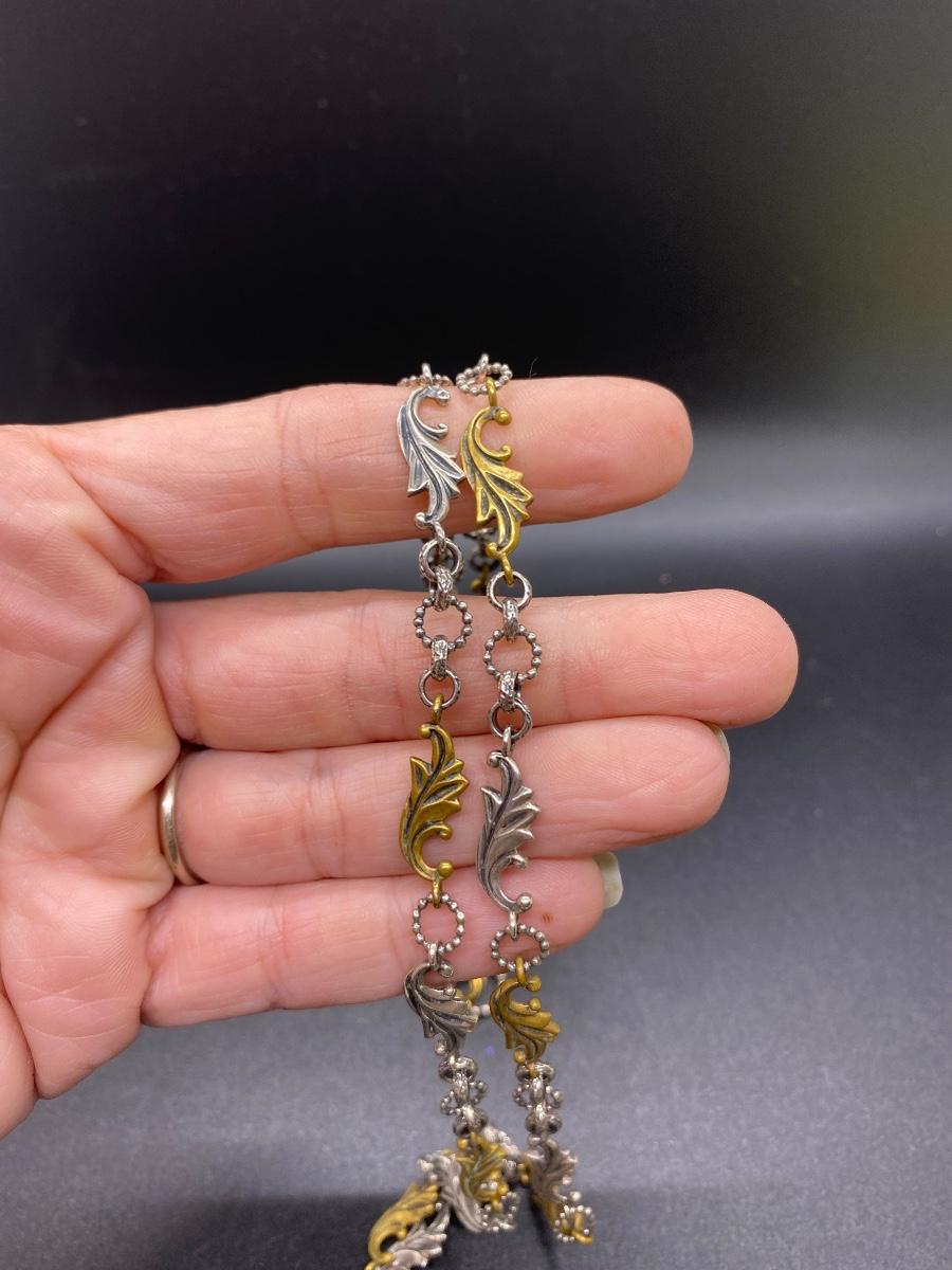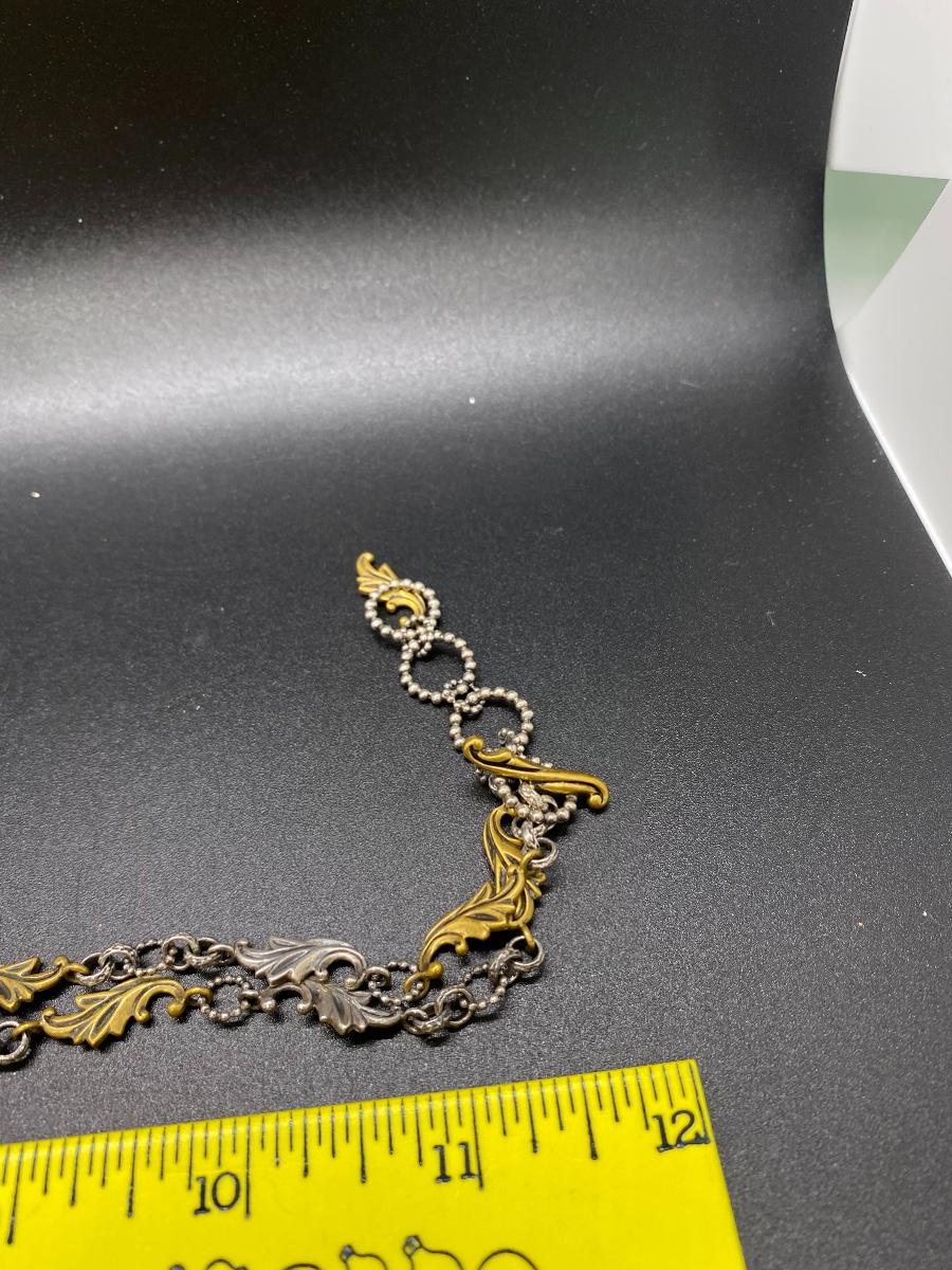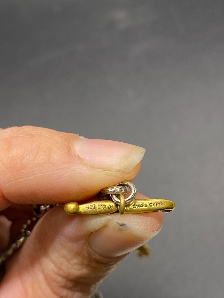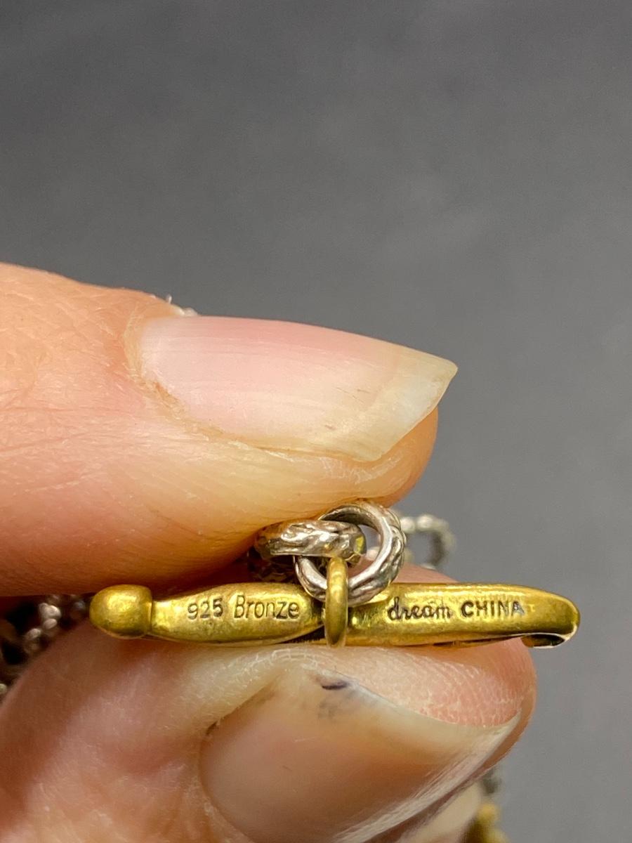 Long 12"+ drop length sterling silver and bronze necklace. Toggle latch gives a couple inches of adjustable length. Marked on the end. Made in China.