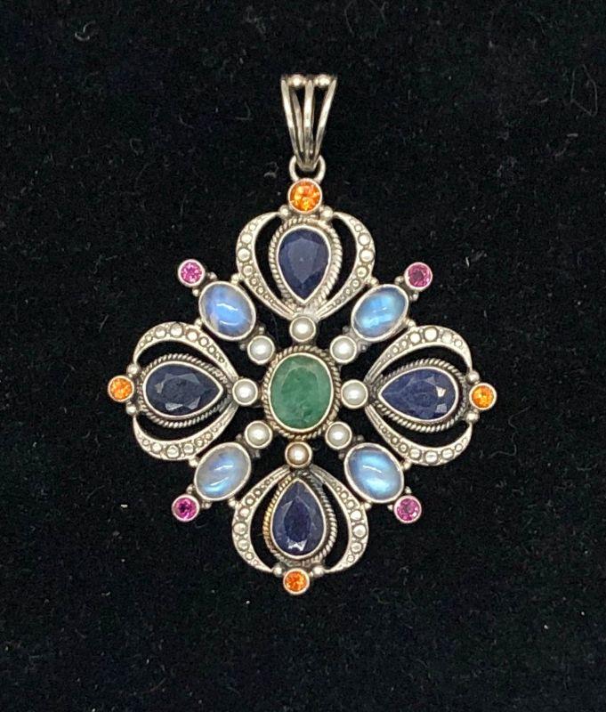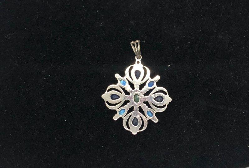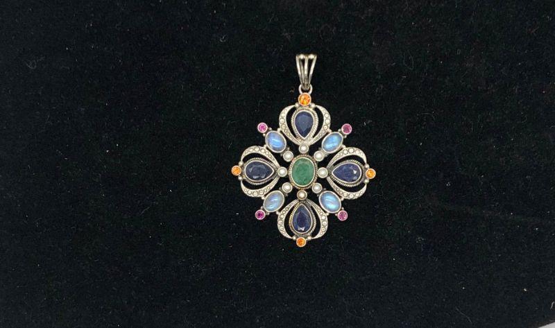 Clover shaped sterling silver pendant. 925 set with various colorful gem stones. Almost 3" length and 2" wide. Stamped 925 and India on the back.