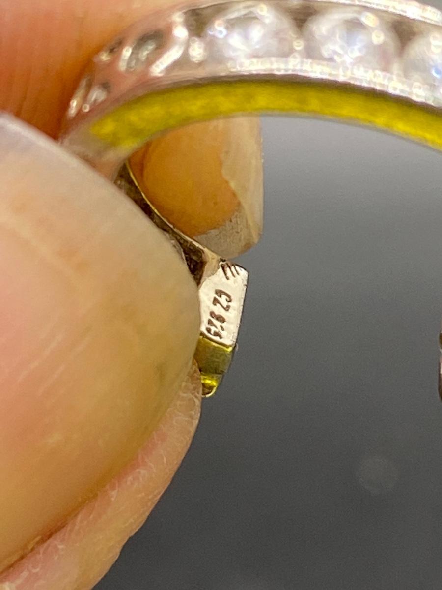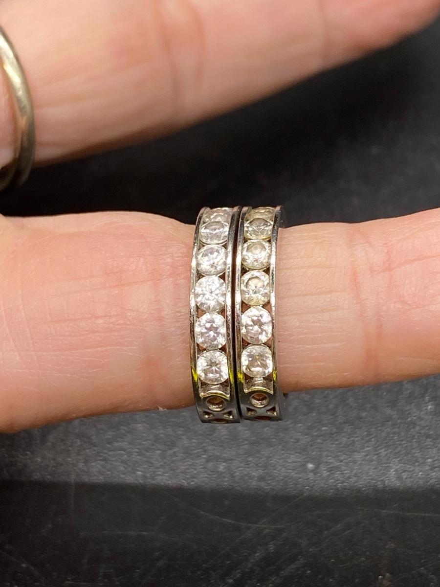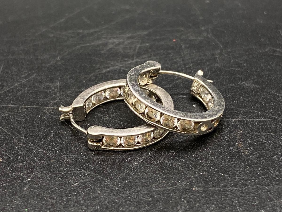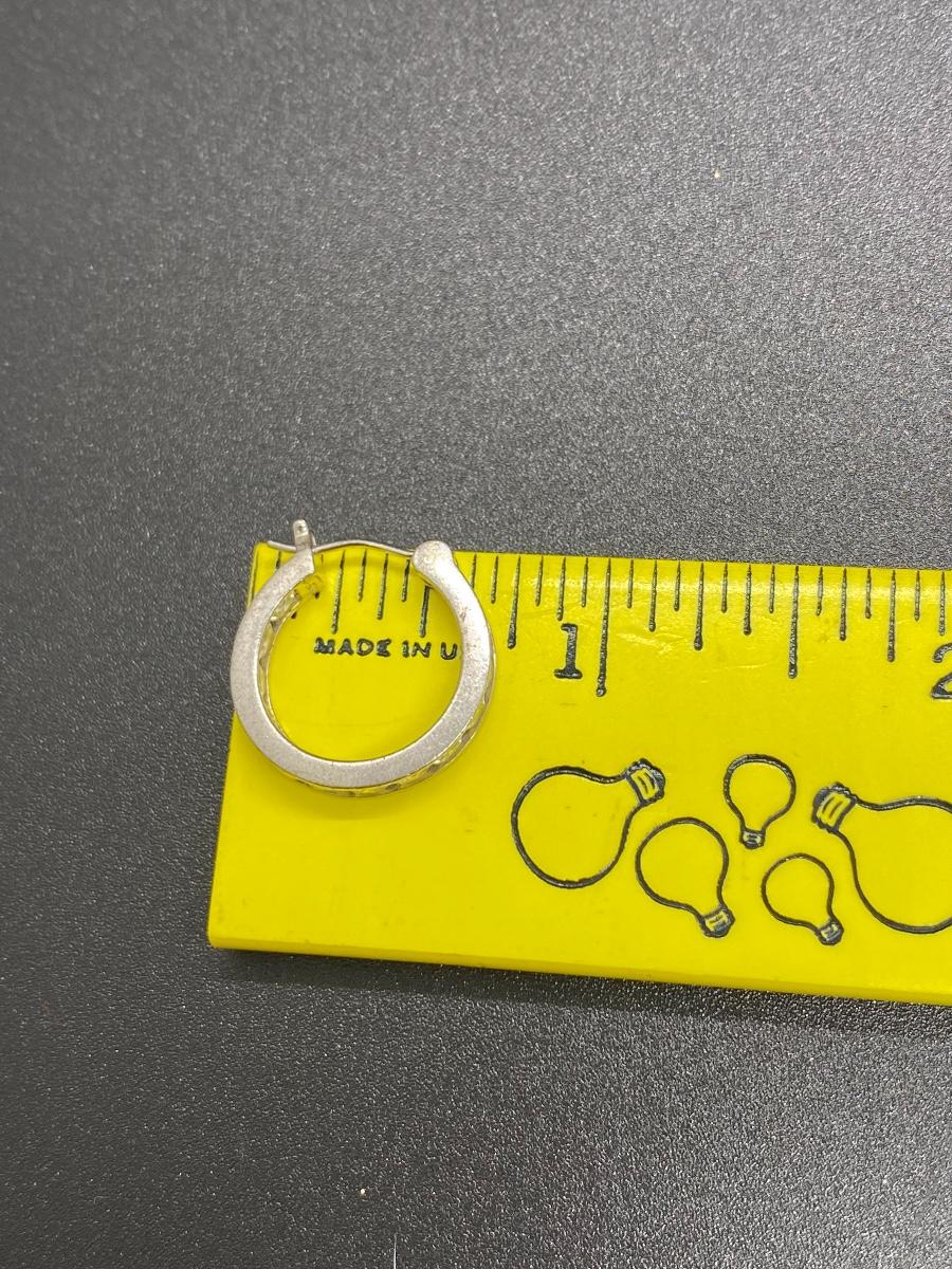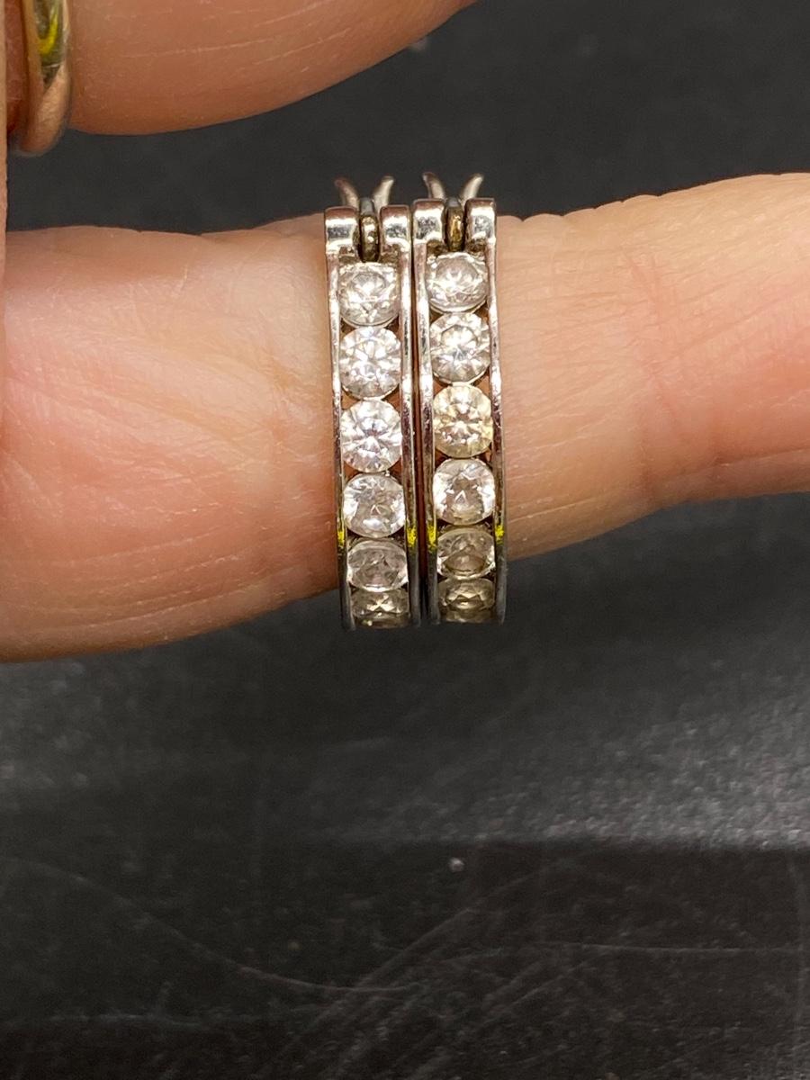 3/4" sterling silver and CZ hoop earrings. No maker mark. Good condition.