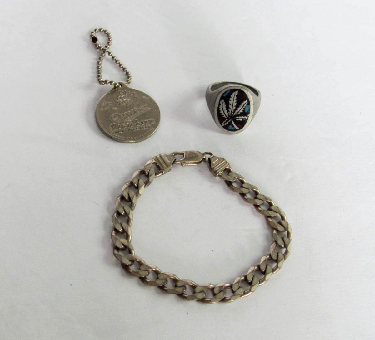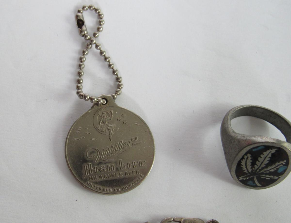 The sterling bracelet is .07 ounce, I don't have a gram scale. It is about 3/8" wide, good shape but tarnished and needs cleaning. The Miller key ring is in good used shape with minor wear. The ring is not marked, unsure what metal it is. The inside diameter is just under 1". Shipping is available at actual shipping cost plus $5.00 handling fee per box for supplies/labor. See our terms for details. All sales are final. Condition notes may not be all inclusive, we may miss some issues as most vintage items are not in mint condition and have some degree of wear, paint loss, etc, but we always try to note obvious damage.