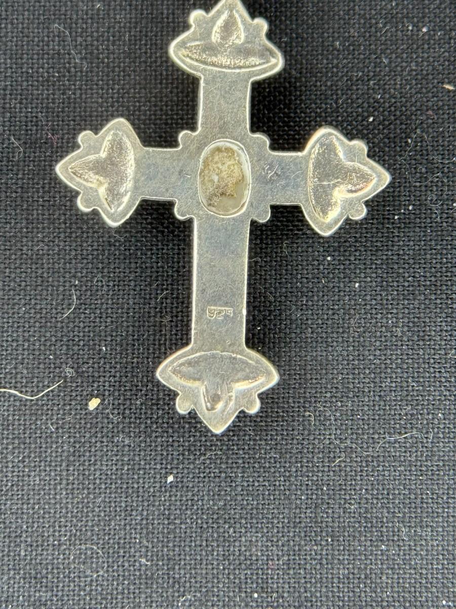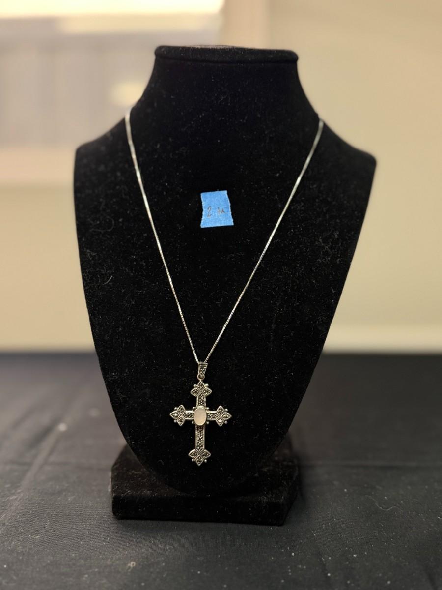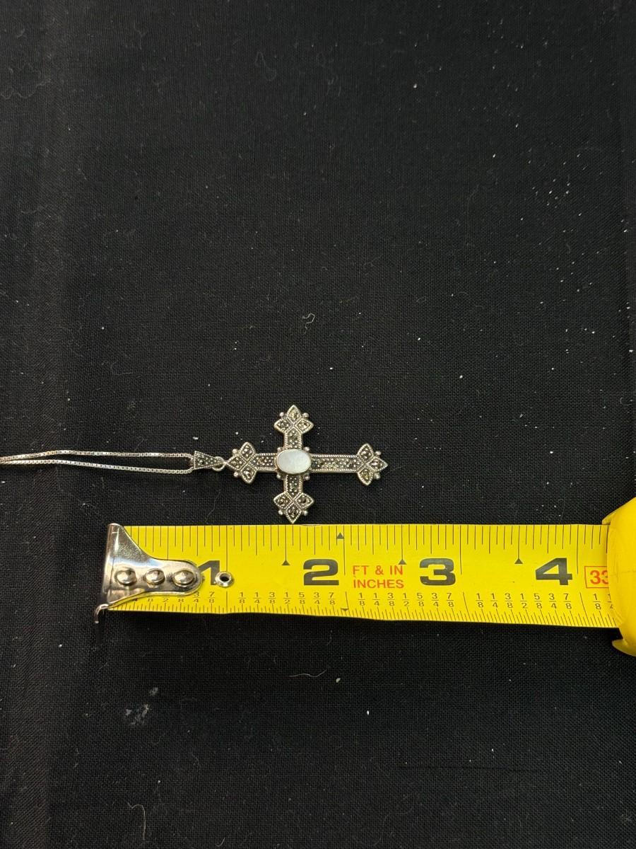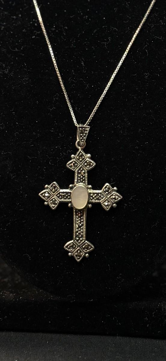 Sterling Silver 925 Marcasite + Mother-of-pearl Cross Pendant necklace