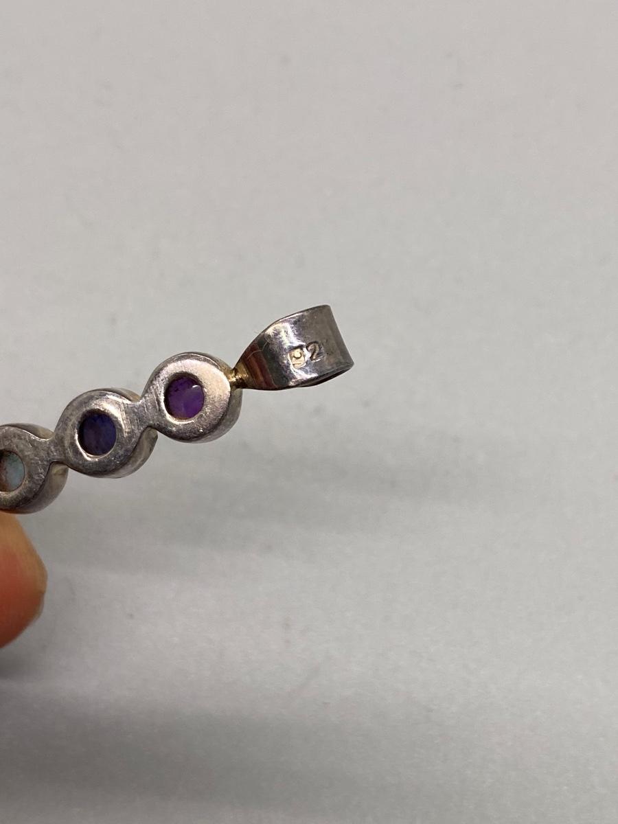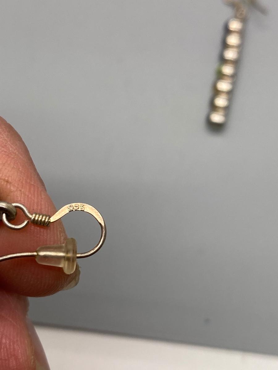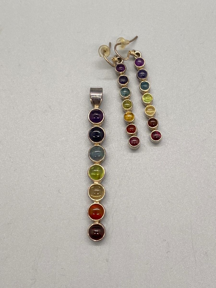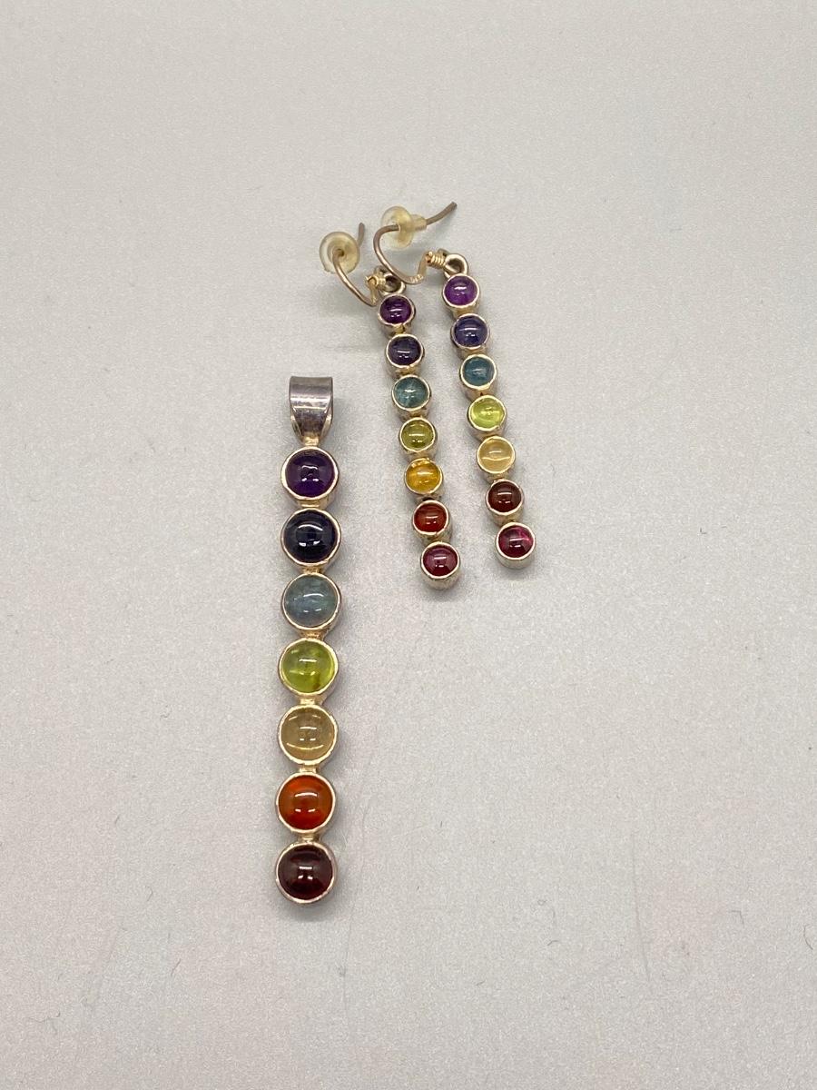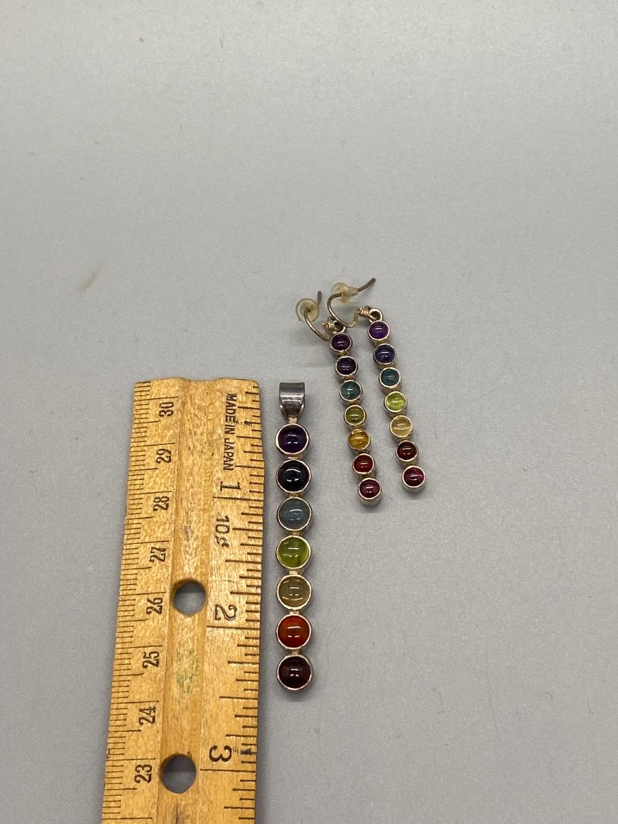 Matching sterling silver pendant and dangling earrings. Rainbow of colored stones set in a straight line. Markes 925. Pendant is about 2.5" length, earrings a little shorter. Good condition.