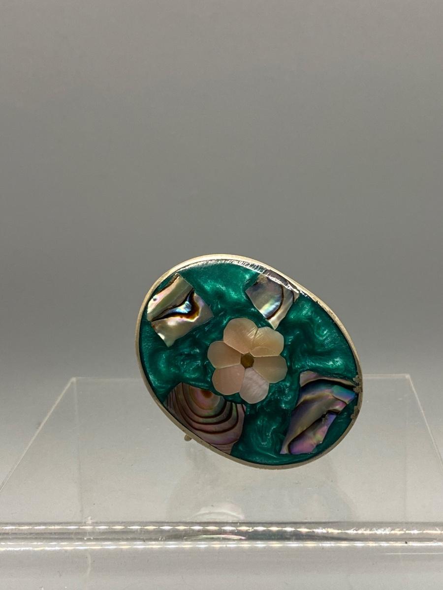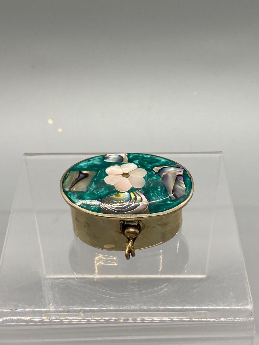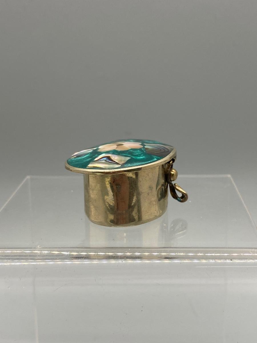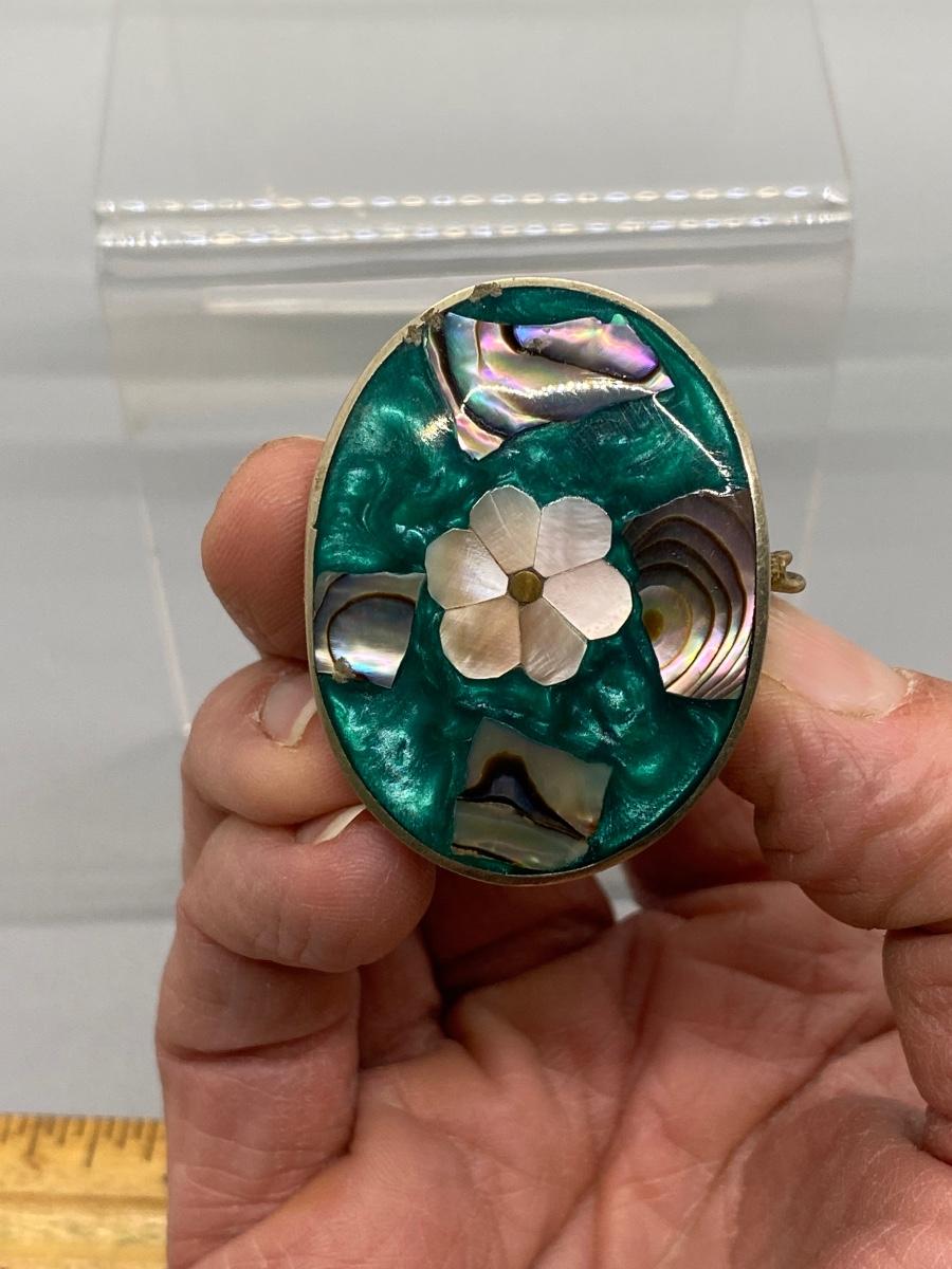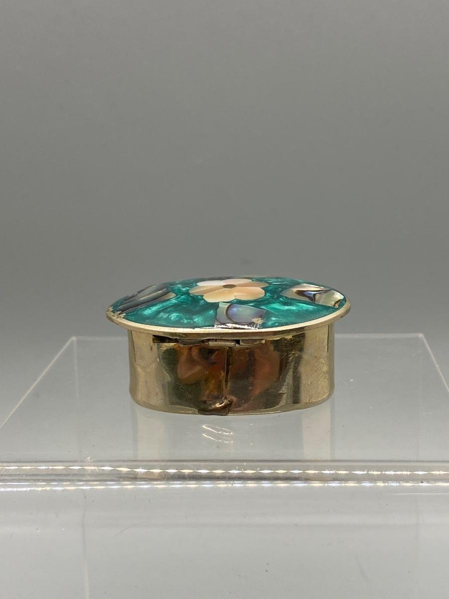 Oval sterling silver and mother of pearl trinket snuff box. Hinged lid with flip latch close. Top has a pearlized green enamel with mother of pearl flower and abalone inlaid. Stamped on the bottom, hard to read. Believe it is made in Mexico. Under 2" size.