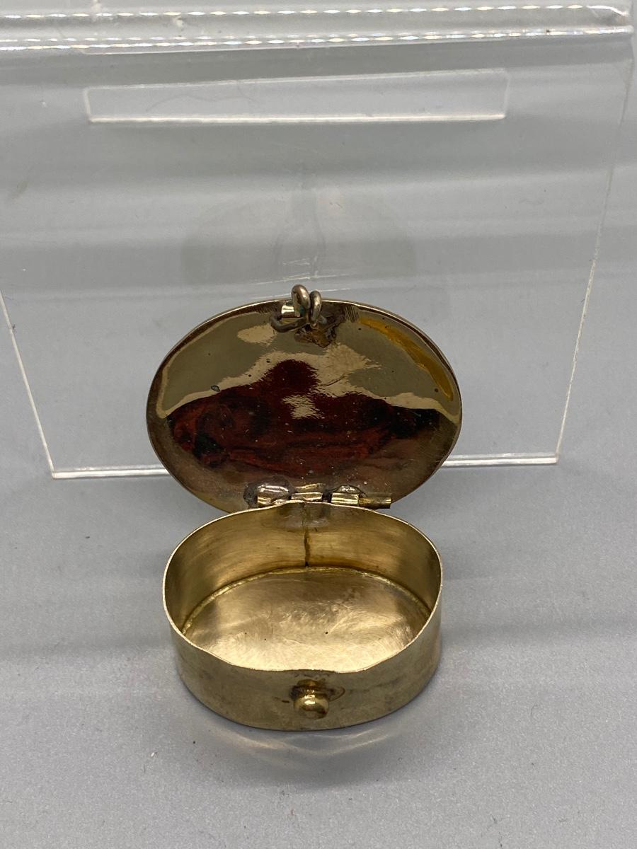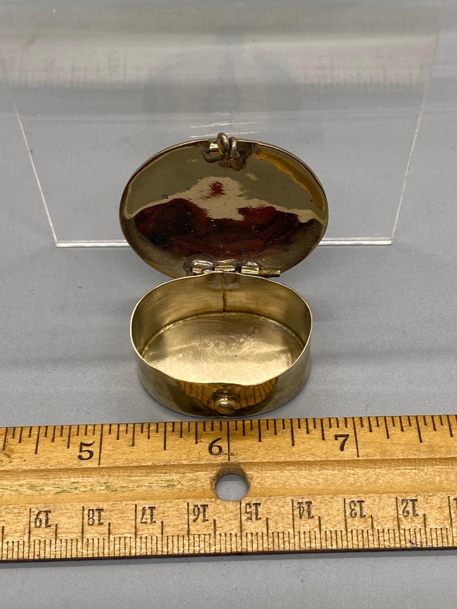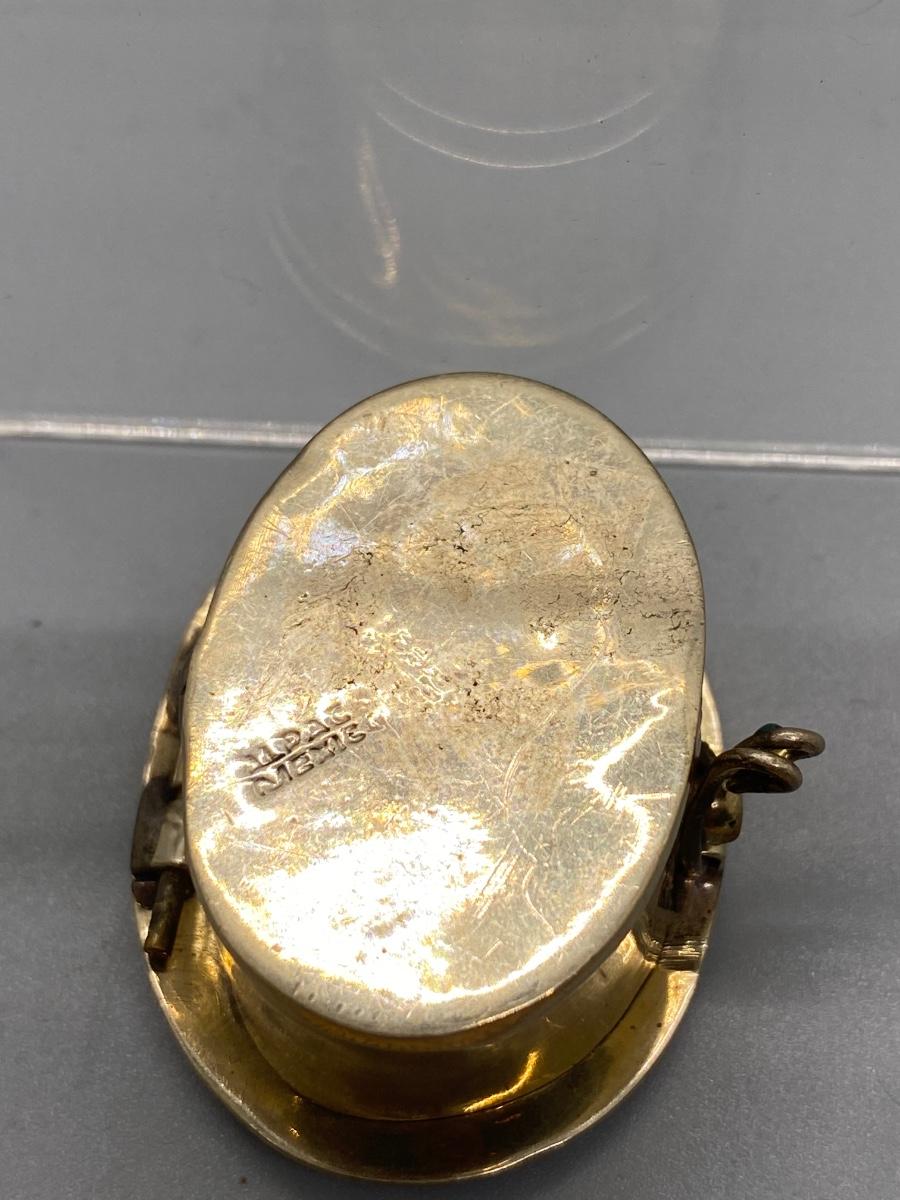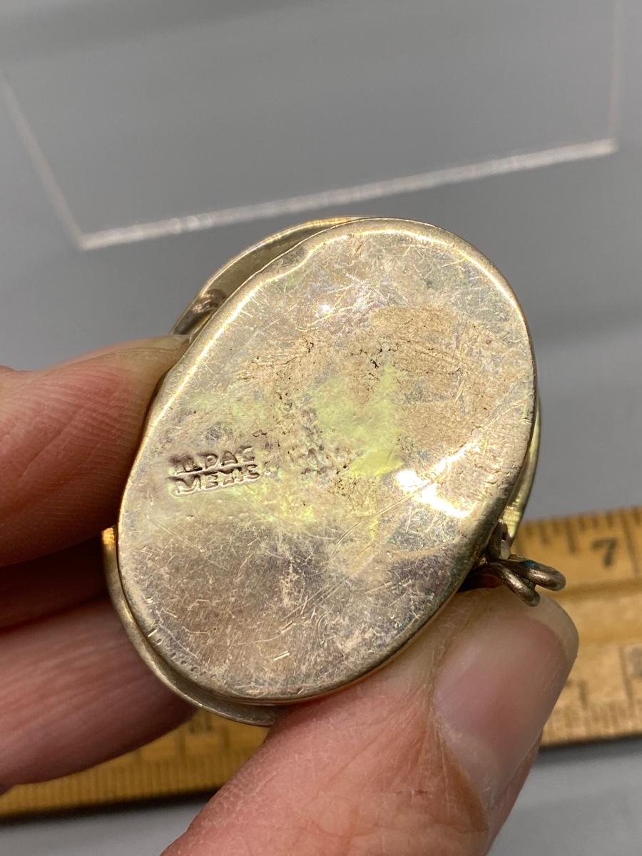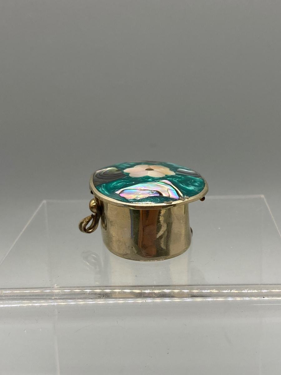 Oval sterling silver and mother of pearl trinket snuff box. Hinged lid with flip latch close. Top has a pearlized green enamel with mother of pearl flower and abalone inlaid. Stamped on the bottom, hard to read. Believe it is made in Mexico. Under 2" size.