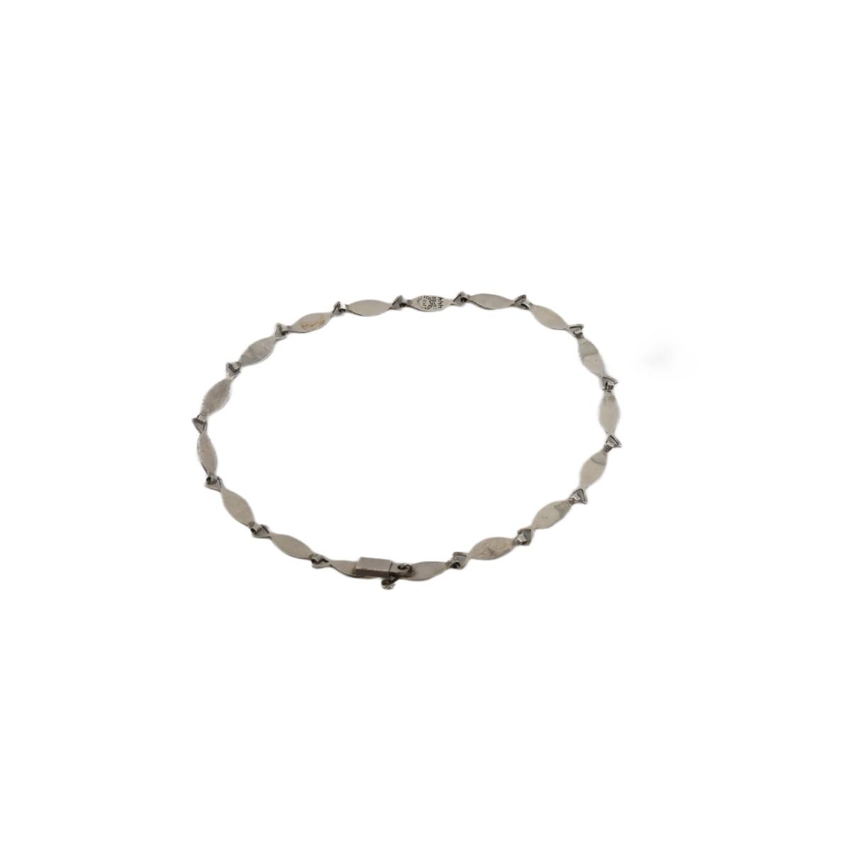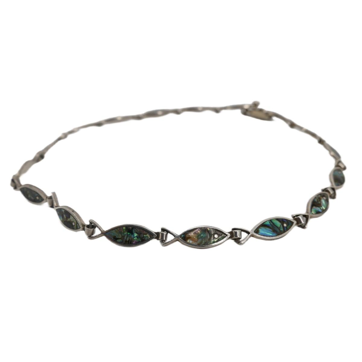 Gorgeous .925 sterling silver and abalone fish designed necklace. Made in Taxco, Mexico and signed TS-02 444. Measures approximately 15" and weighs 22g.