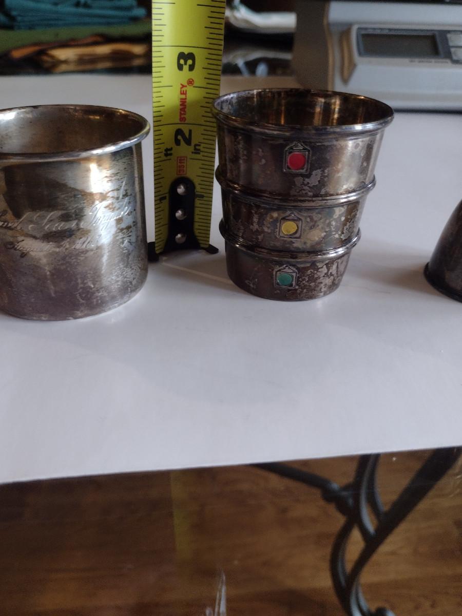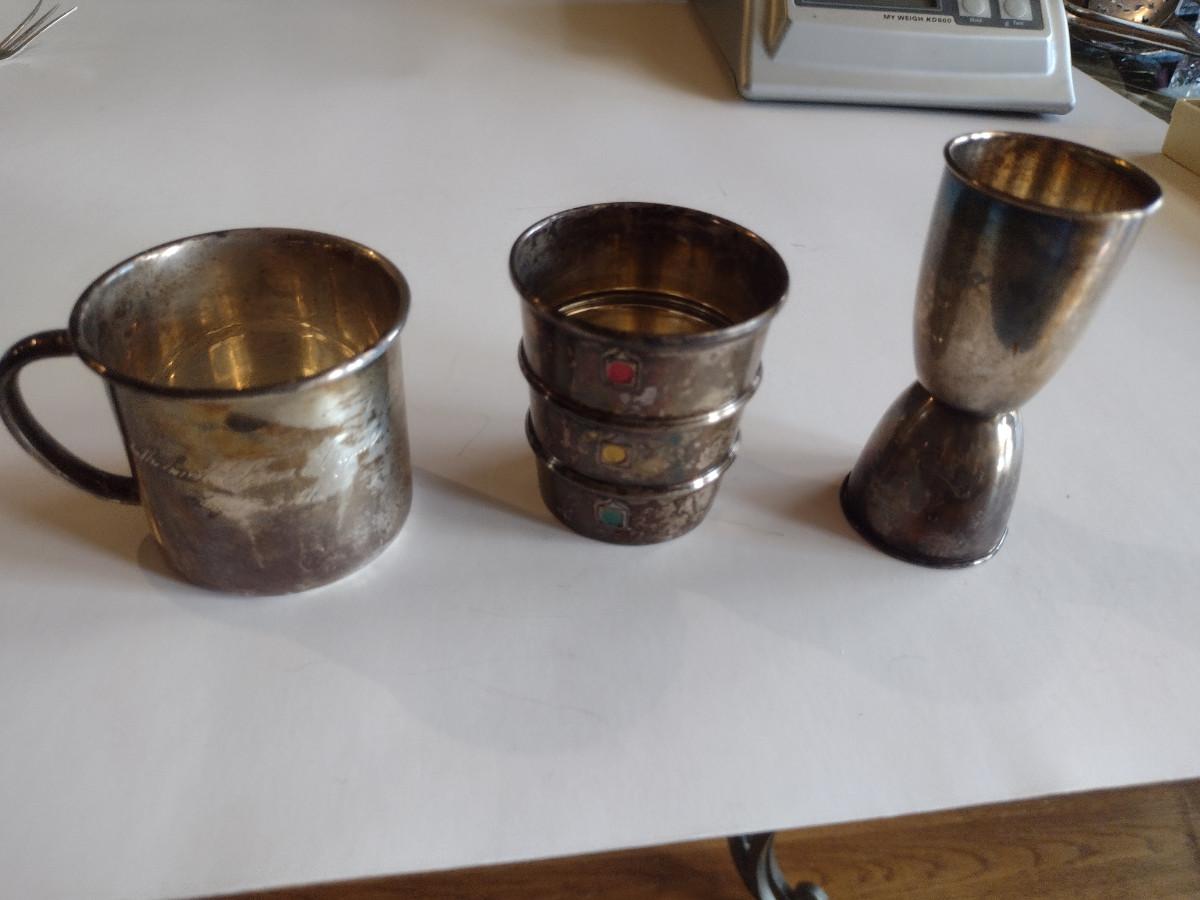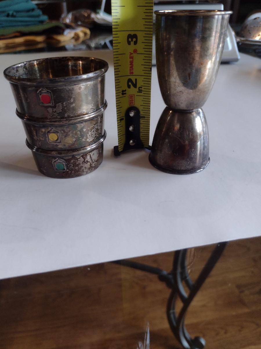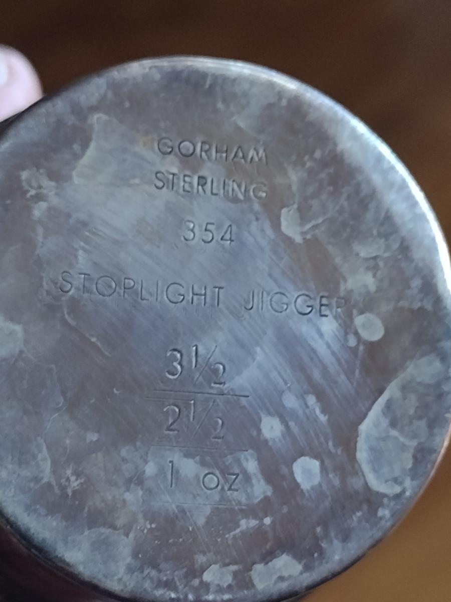 Sterling Silver Accessories- Cup, Jigger, and Measuring Cup- Approx Weight: 137 Grams. Cup with handle is engraved. Stoplight jigger is made by Gorham.