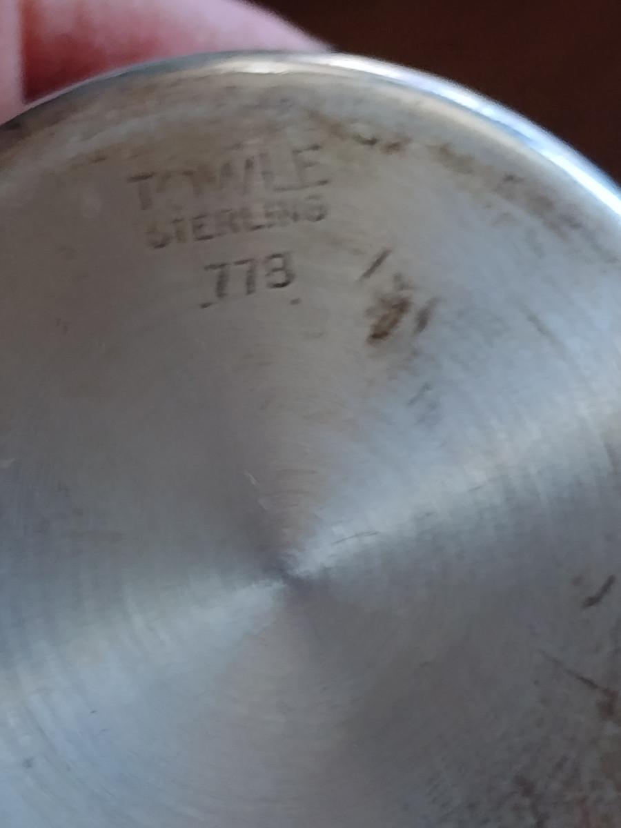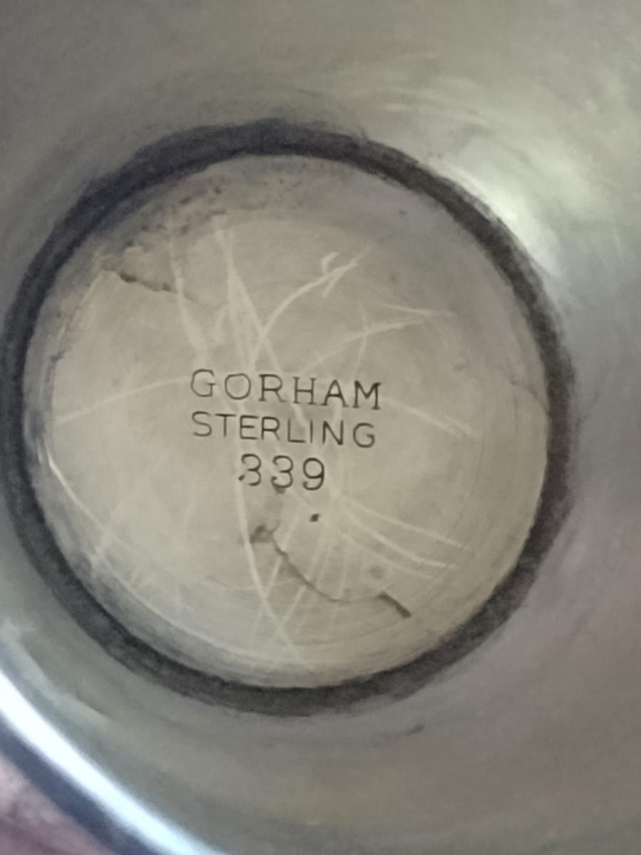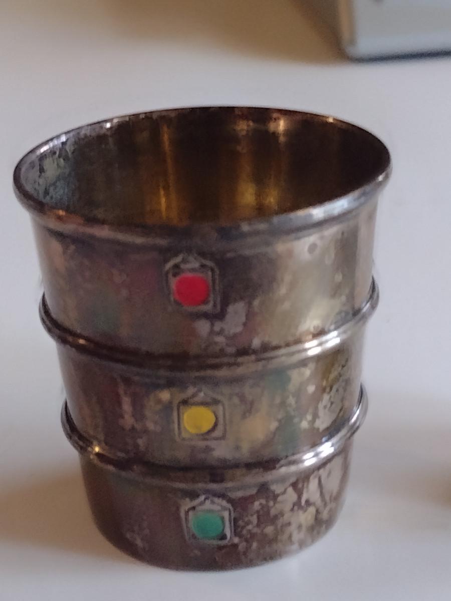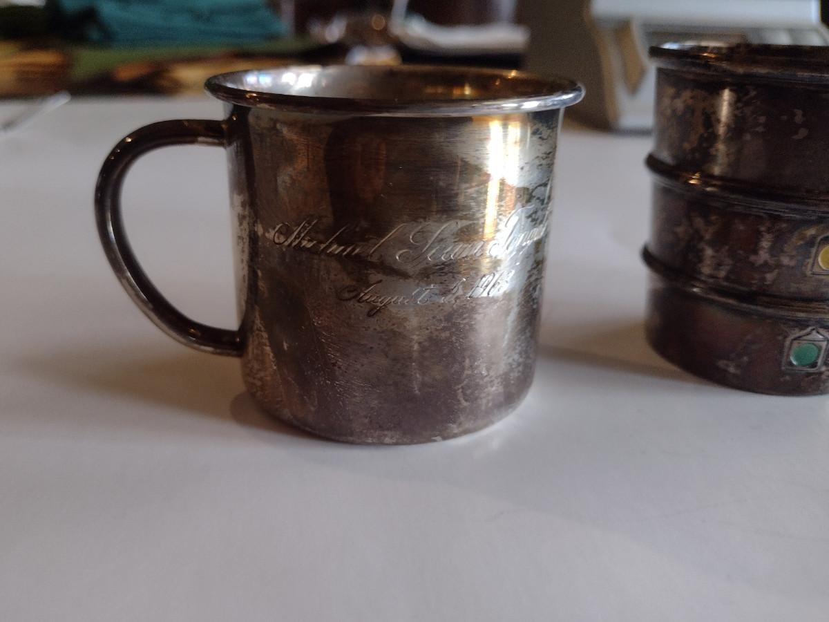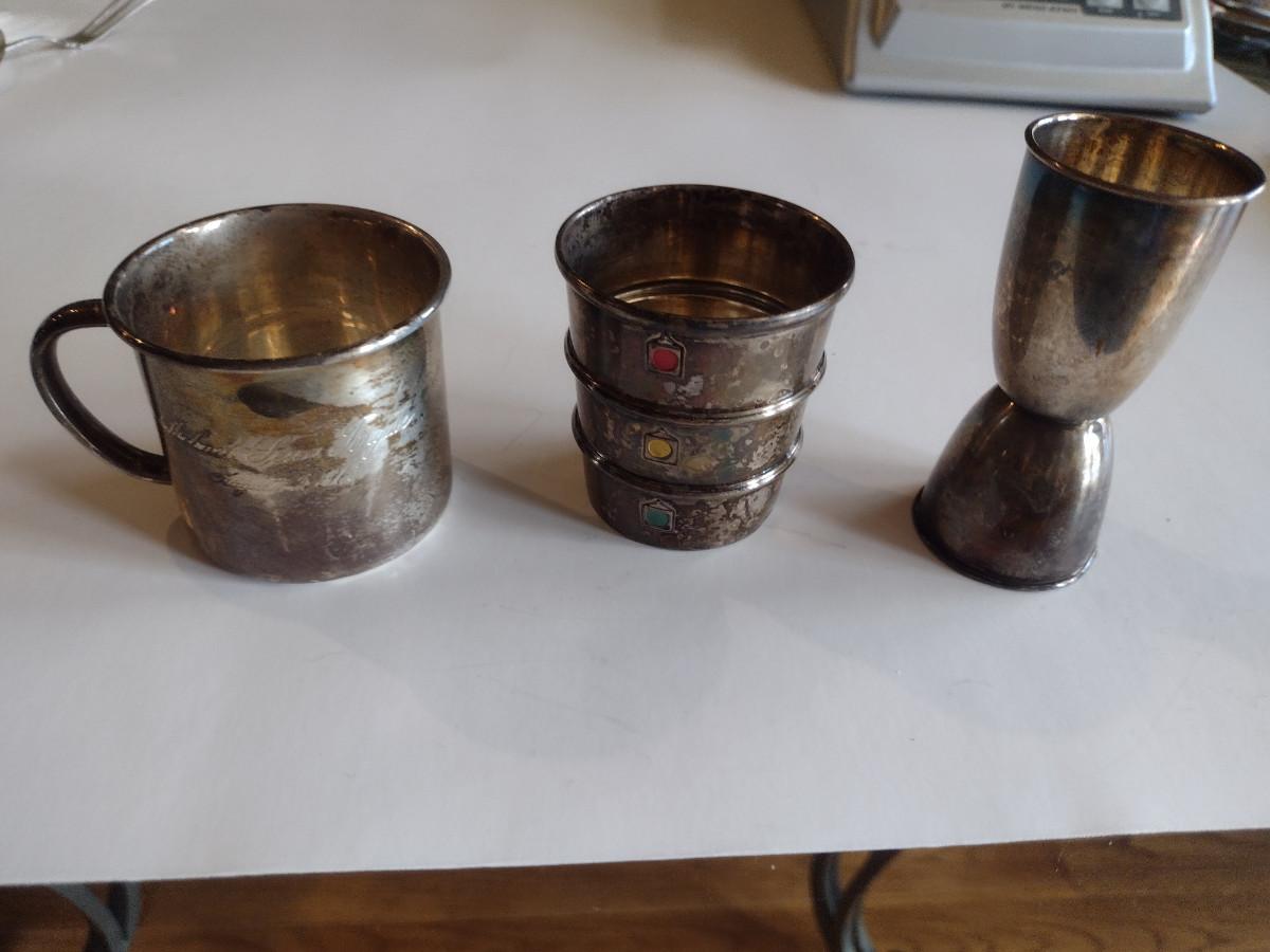 Sterling Silver Accessories- Cup, Jigger, and Measuring Cup- Approx Weight: 137 Grams. Cup with handle is engraved. Stoplight jigger is made by Gorham.