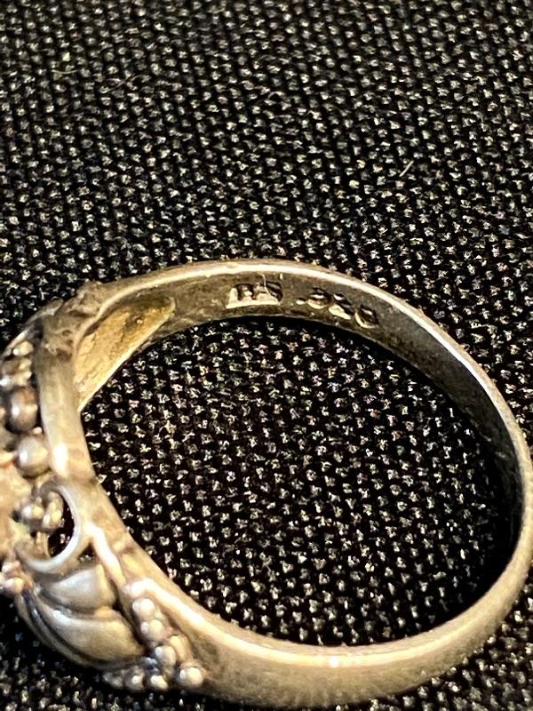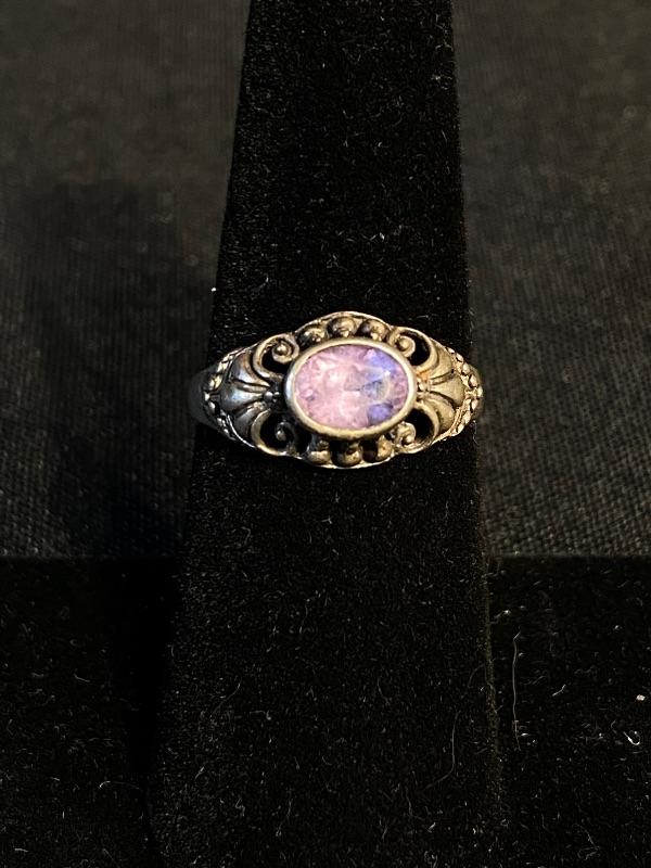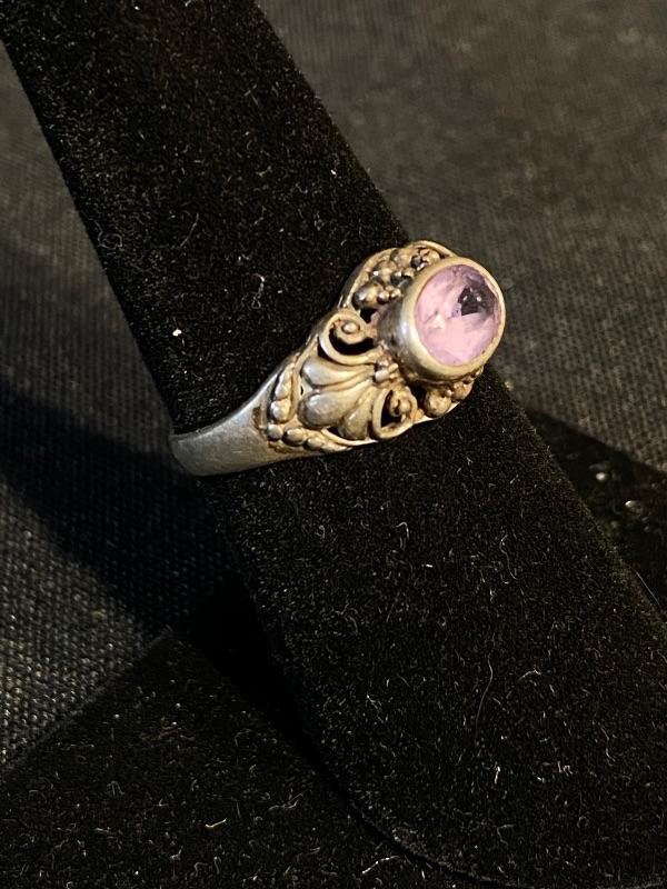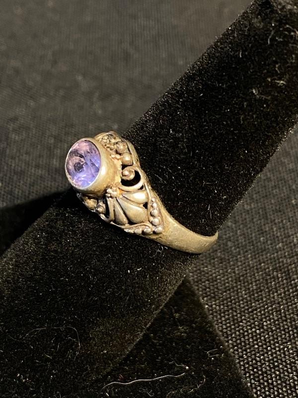 Sterling silver and Amethyst ring. Oval cut stone. Antique style band. Age unknown. Size 7