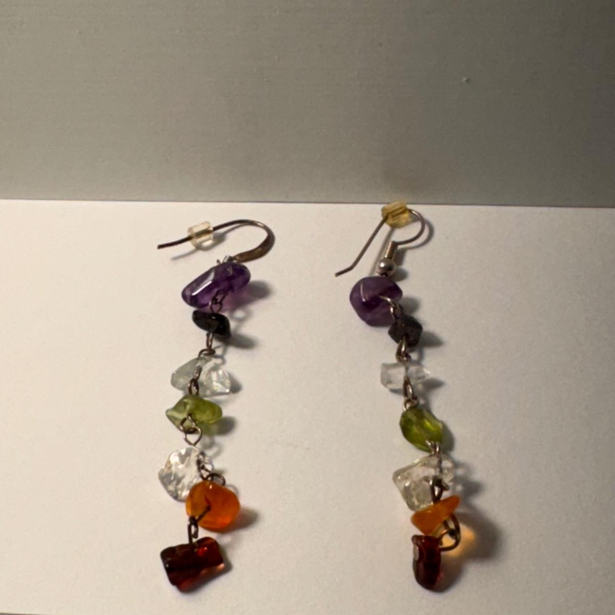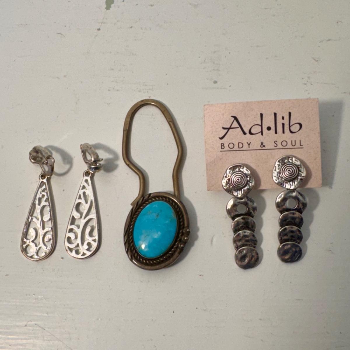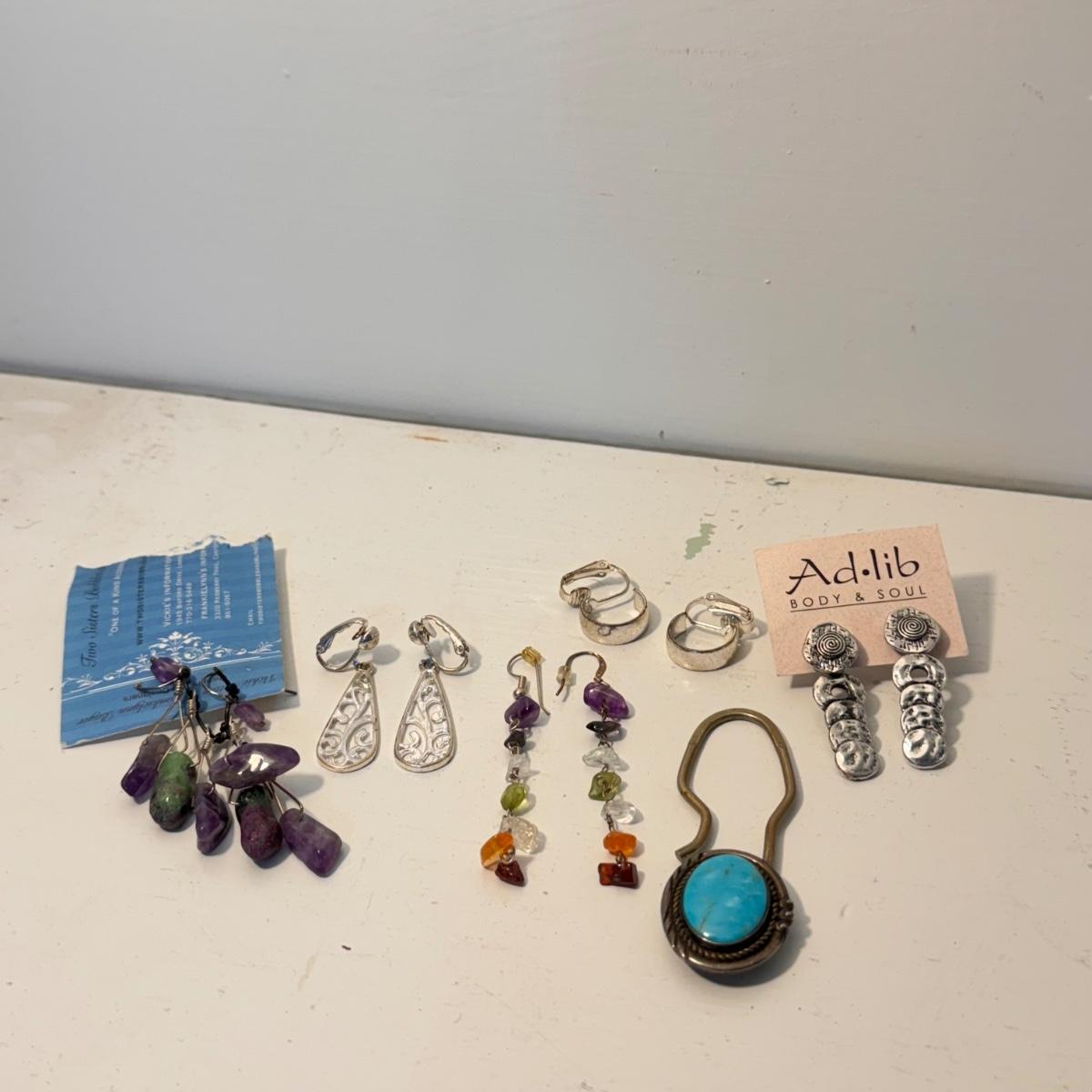 This lot includes one pair of sterling silver earrings with ameythest and zoisite w/ ruby stones and black leather accents, one pair of earrings from Ad.lib Body & Soul, one pair of multi-colored stone earrings, two clip on silver colored earrings, and one silver key ring with a turquoise stone. The key ring measures 3” x 1”H. All sales are final. No returns or refunds. Please bid accordingly. Shipping available.