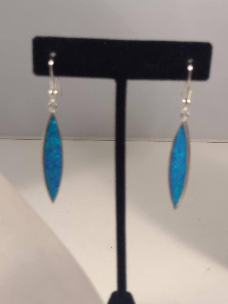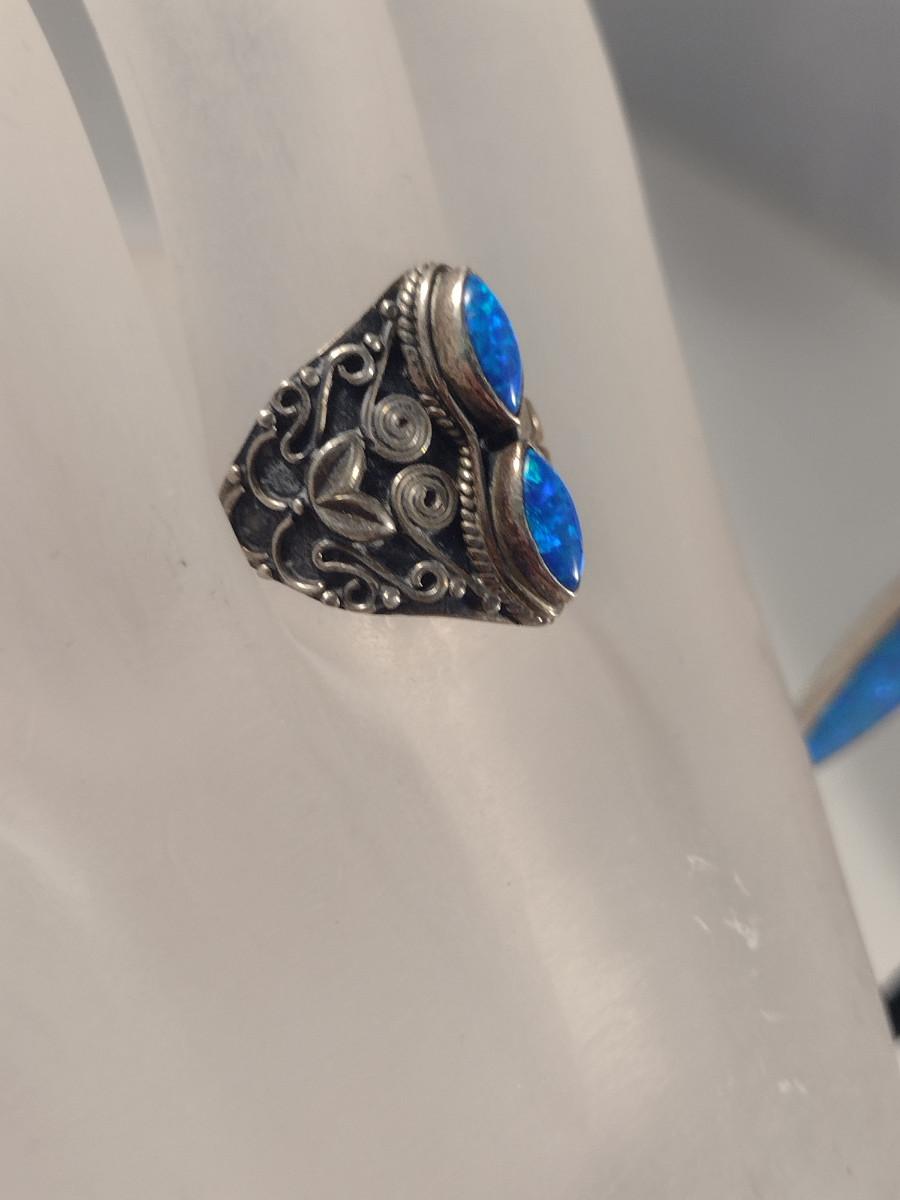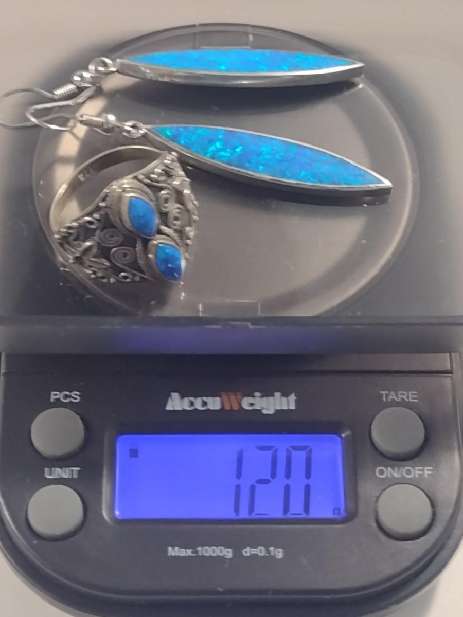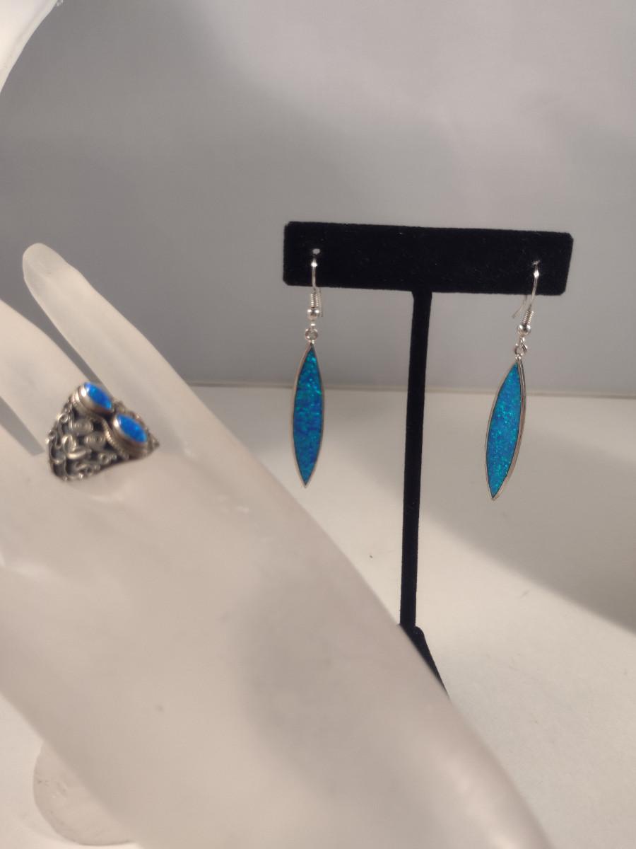 Sterling Silver and Blue Stone Ring and Earrings (#39). Stone is possibly blue opal. Approx total weight 12.0 grams.