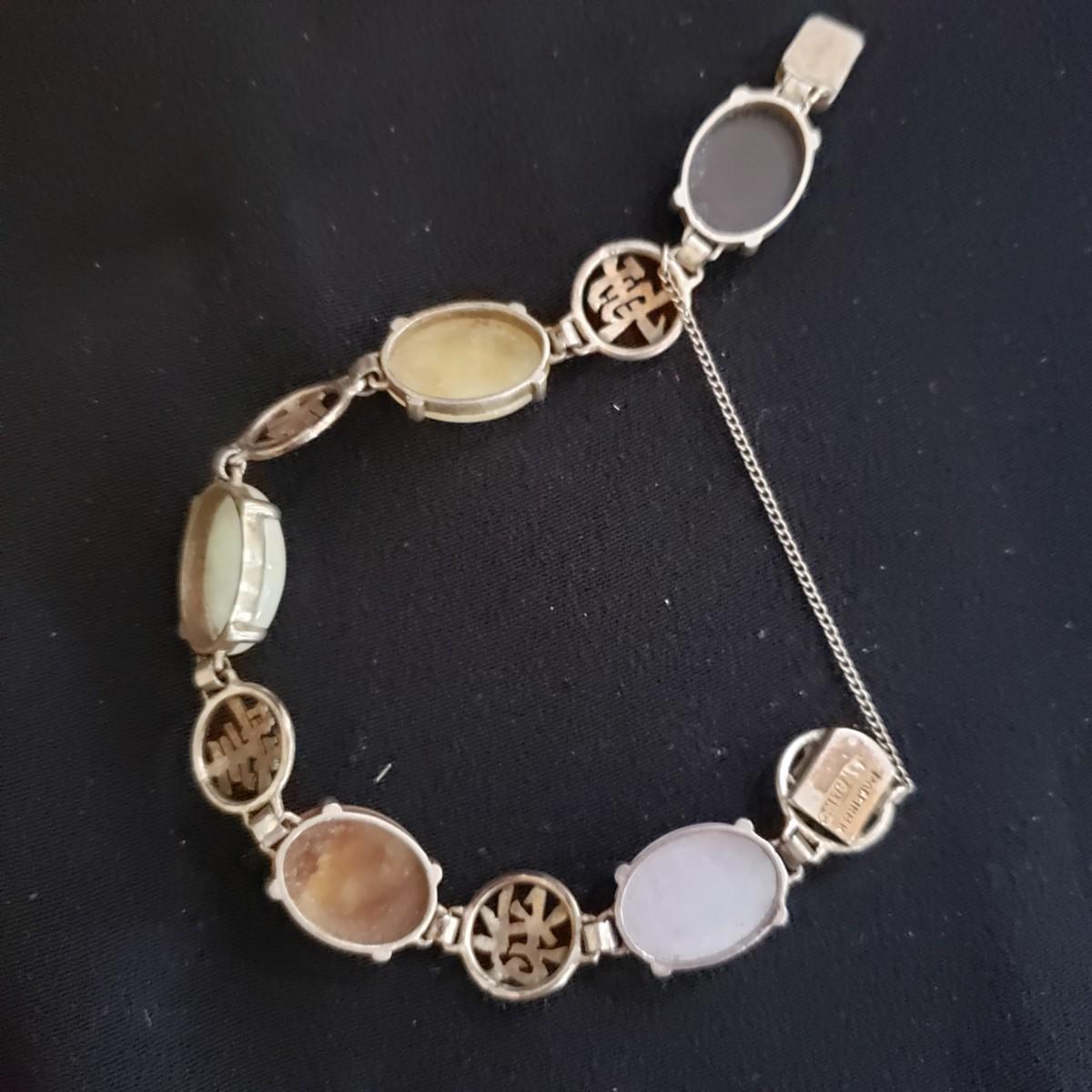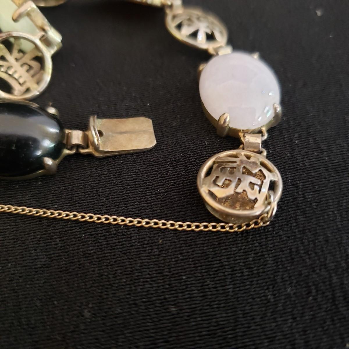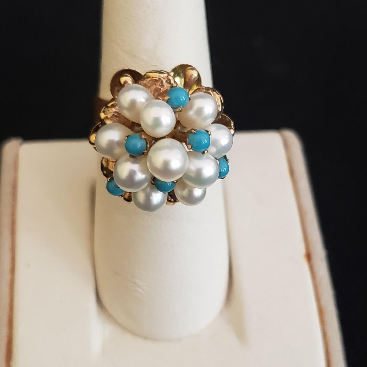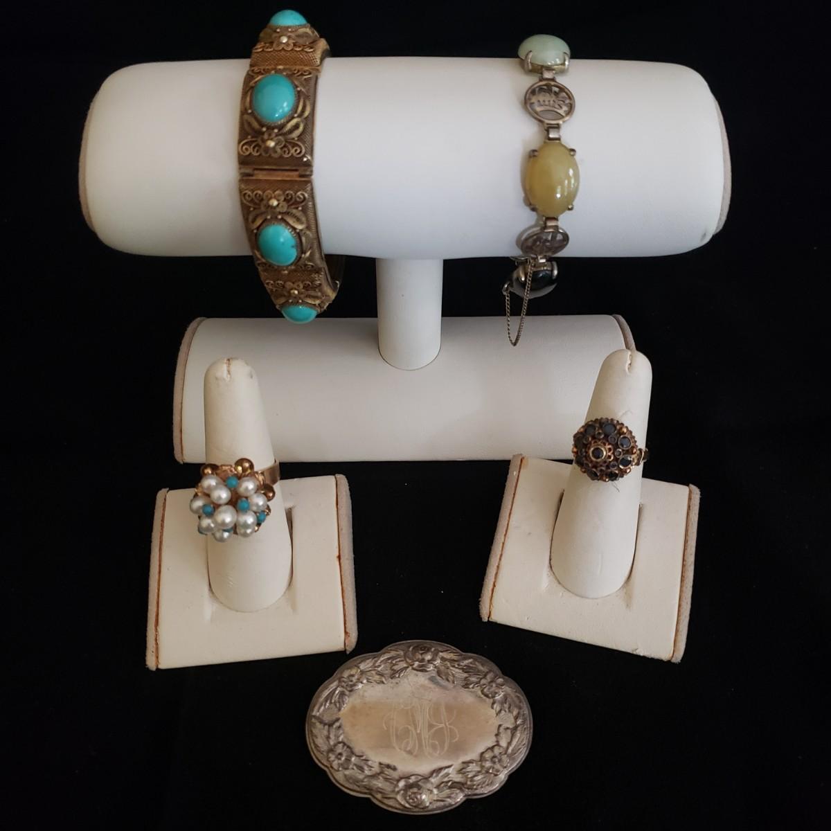 This lot features 5 pieces of vintage jewelry. The S. Kirk & Son sterling pin is stamped 14 F. The monogram on the front is CMJ. The gold 14 K stamped pearl like ring with turquoise like stones raises almost 1" off the ring. It is a size 4. The gold ring with blue stones has stamps on the inside, which are hard to decipher, see pictures; mark possibly reads 10K, but we cannot say that is for sure due to the blurring in the mark. The gold like filigree bracelet with turquoise like stones has delicate filigree designs. It measures approximately 8" around. The Asian styled bracelet measures approximately 8" around and has five different stones with Asian circles in between.