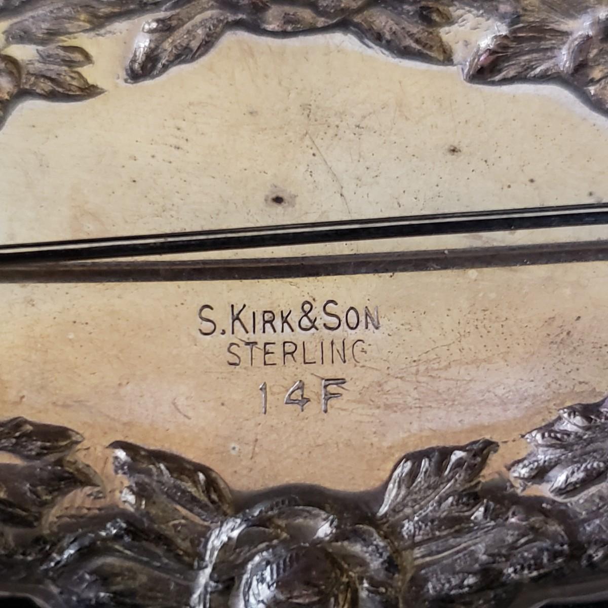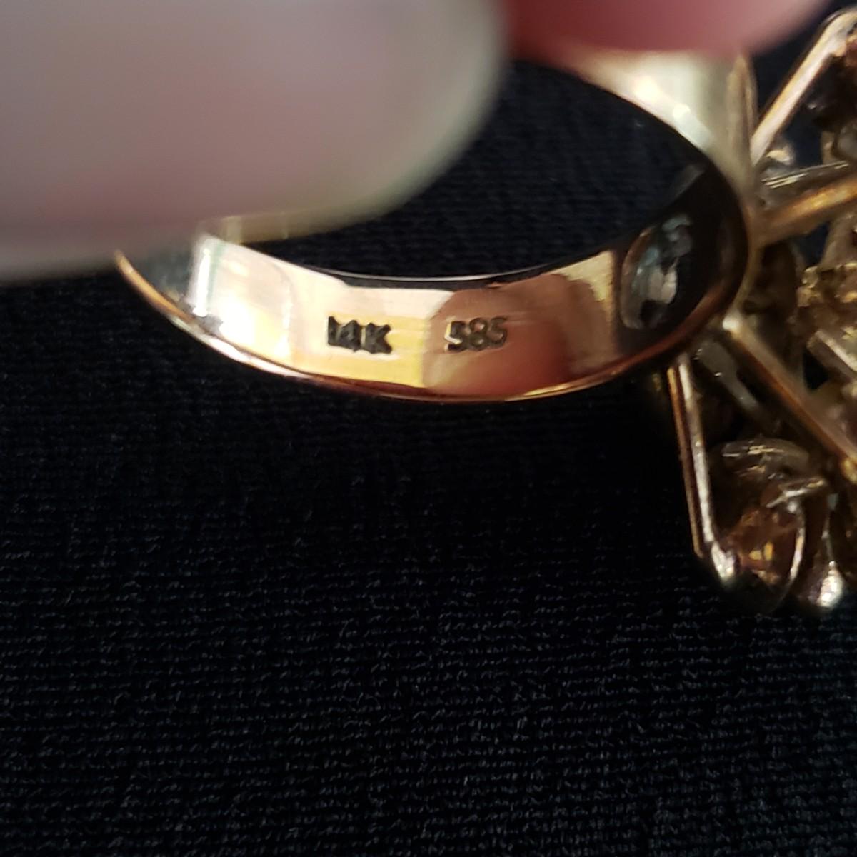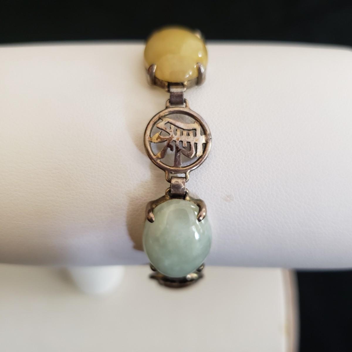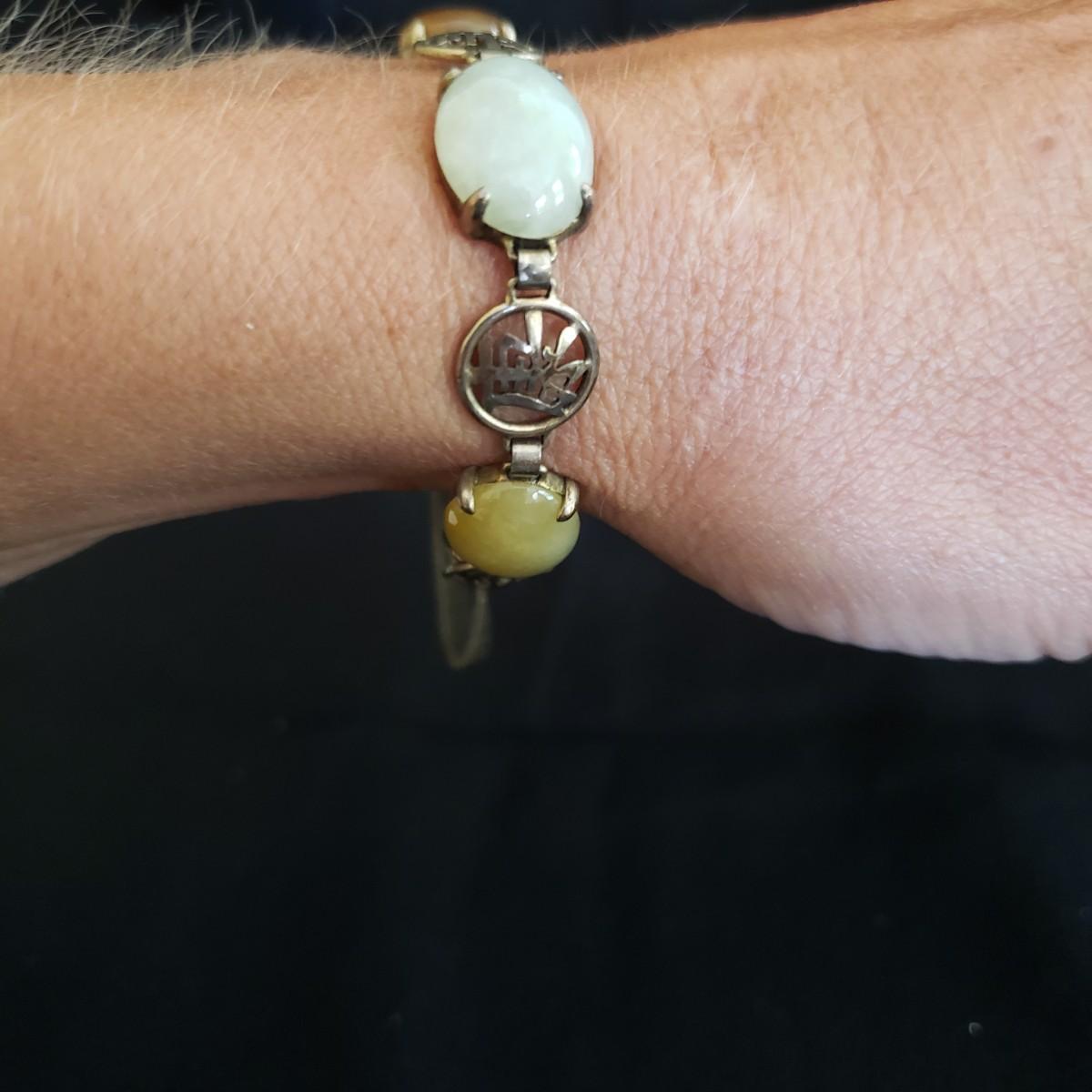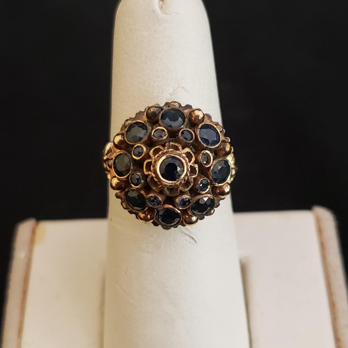 This lot features 5 pieces of vintage jewelry. The S. Kirk & Son sterling pin is stamped 14 F. The monogram on the front is CMJ. The gold 14 K stamped pearl like ring with turquoise like stones raises almost 1" off the ring. It is a size 4. The gold ring with blue stones has stamps on the inside, which are hard to decipher, see pictures; mark possibly reads 10K, but we cannot say that is for sure due to the blurring in the mark. The gold like filigree bracelet with turquoise like stones has delicate filigree designs. It measures approximately 8" around. The Asian styled bracelet measures approximately 8" around and has five different stones with Asian circles in between.