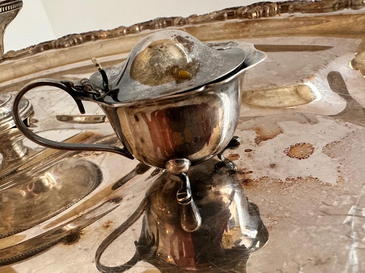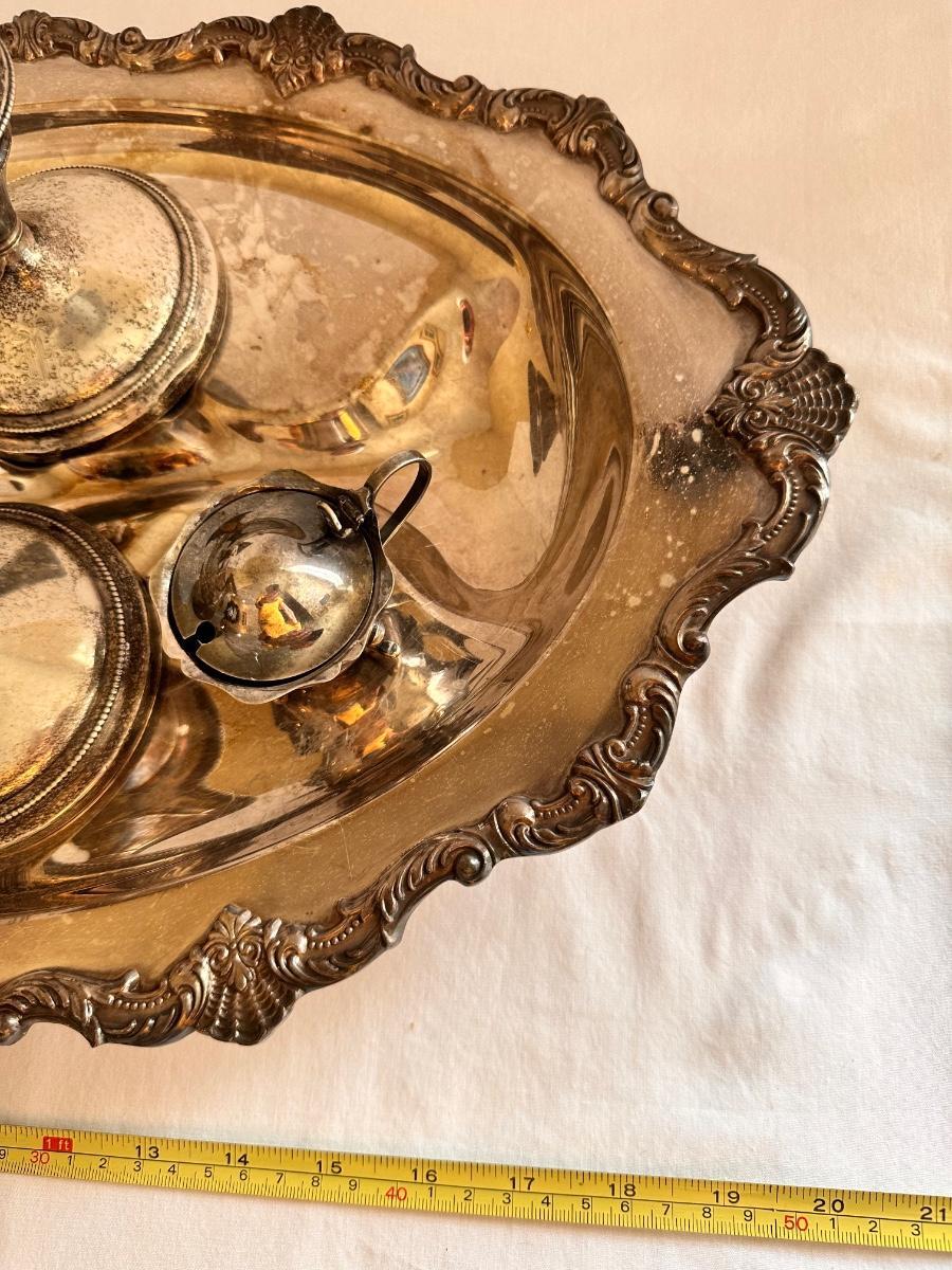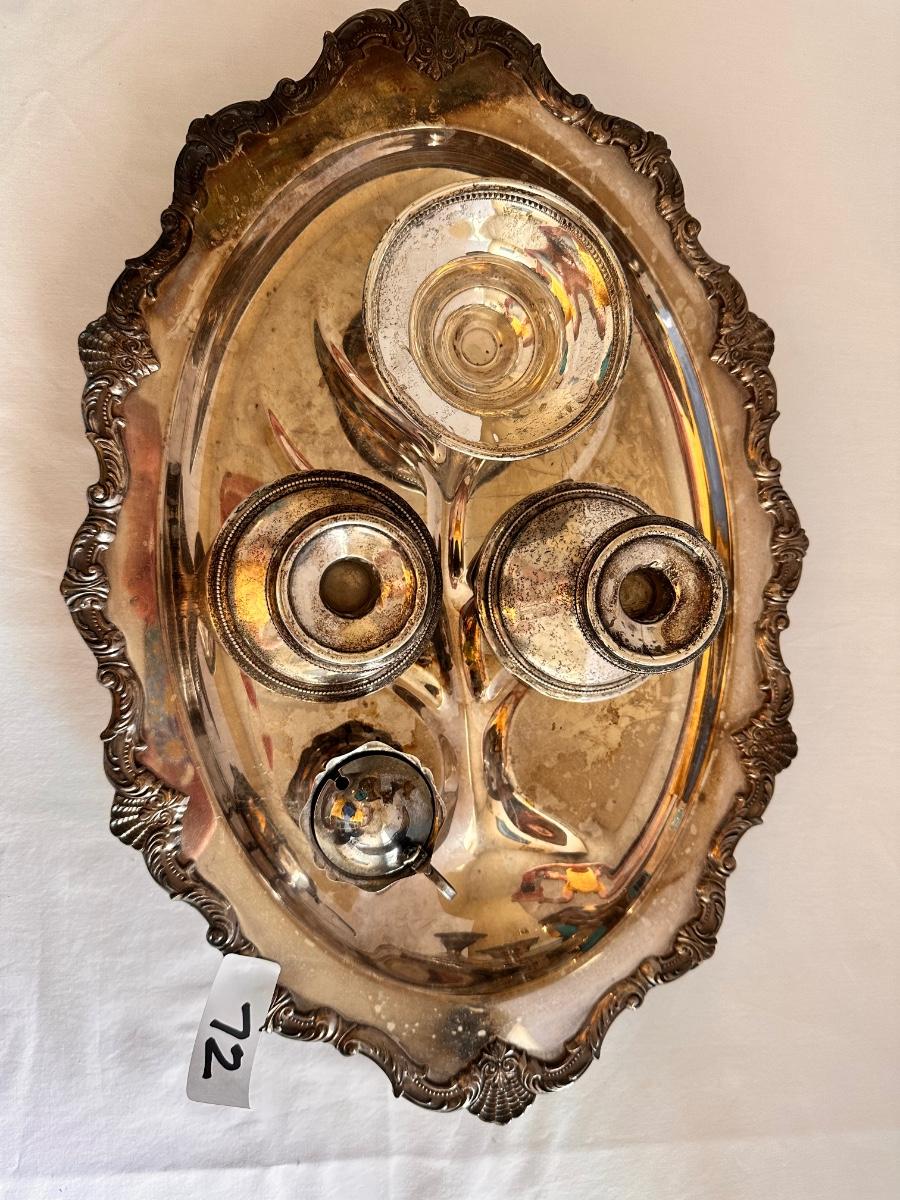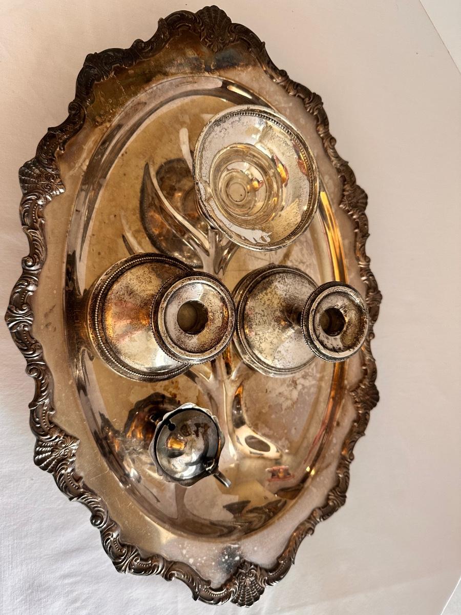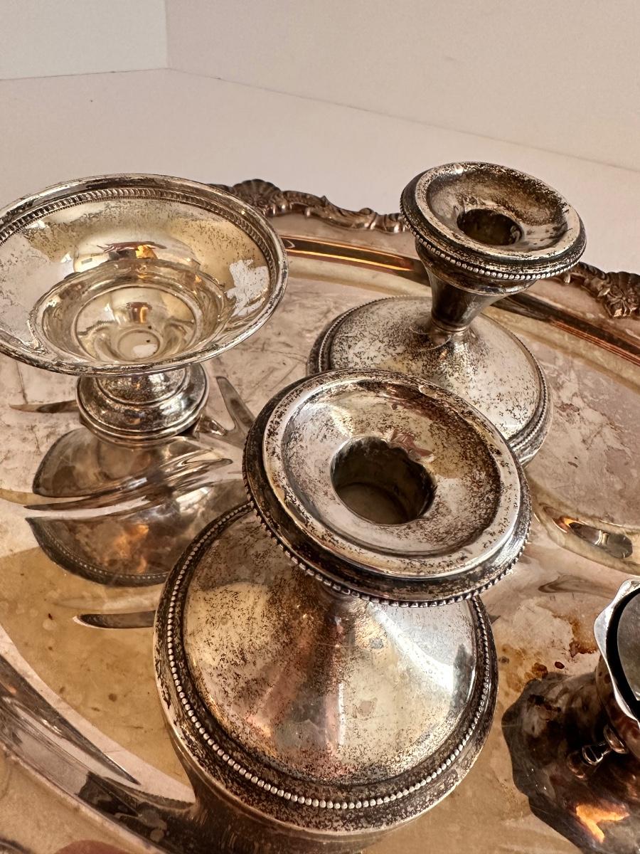 Sterling Silver Candle Sticks, Bowl, Silver Plate Tray, and Cream Pitcher As Pictured