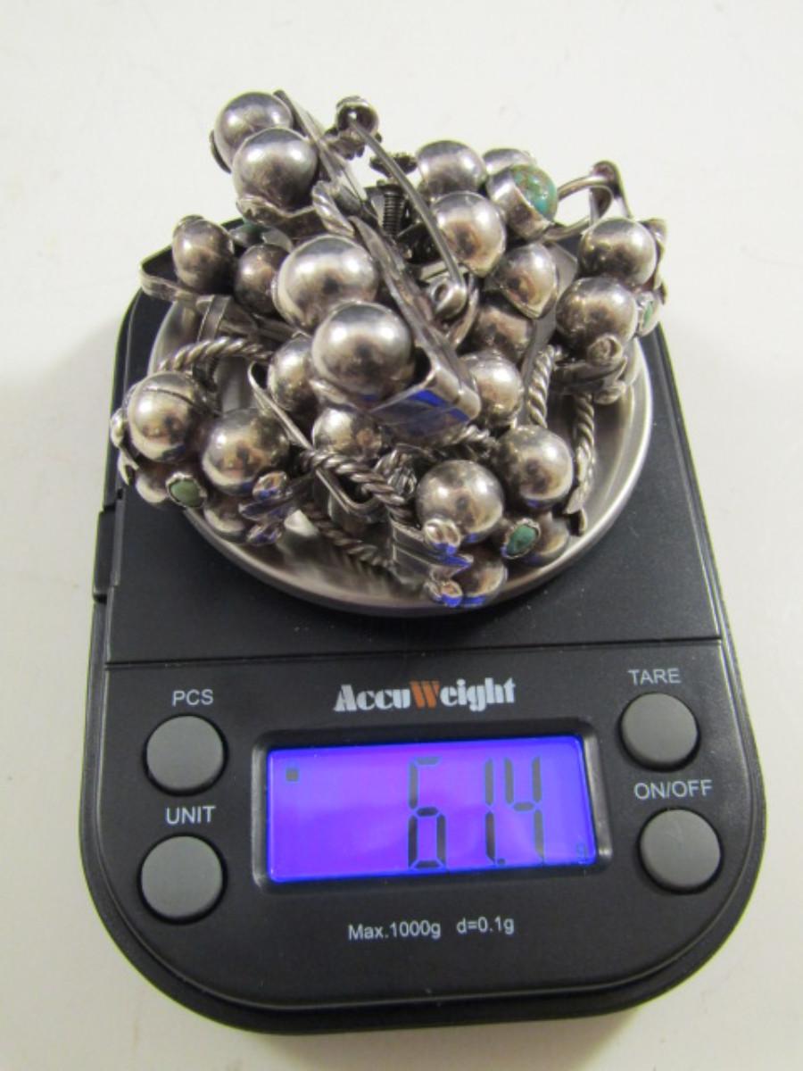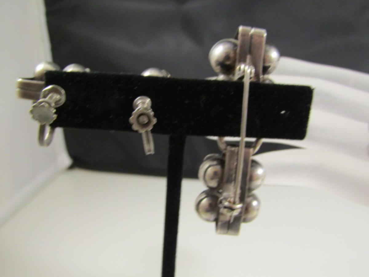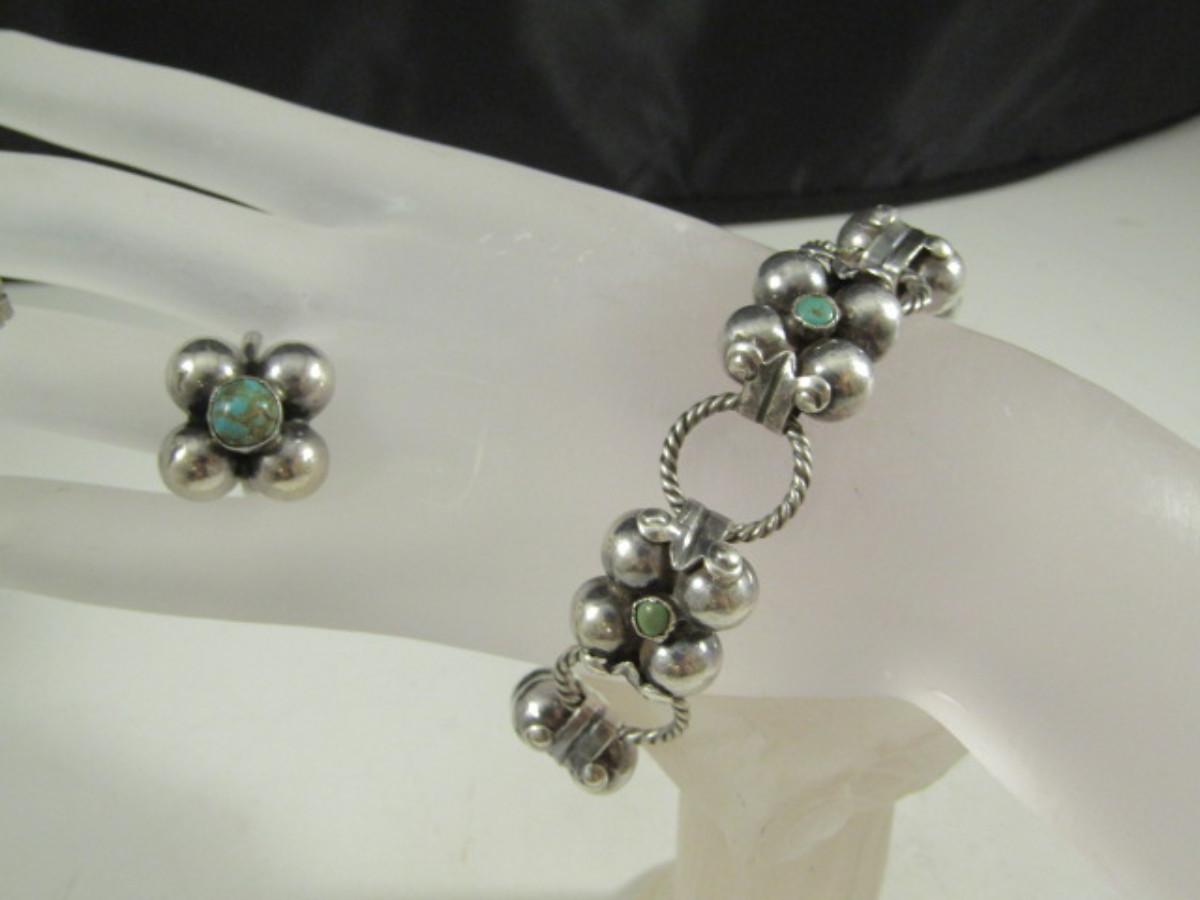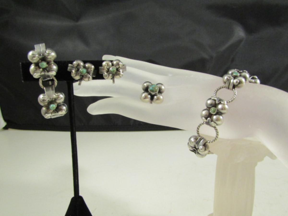 Sterling Silver and Turquoise Floral Design Jewelry Set- Approx 61.4 Grams (#21). Set includes brooch, ring (approx size 7 1/2), bracelet (7 1/2" long), and screw back earrings. Bracelet has one turquoise bead missing- shown in pics.