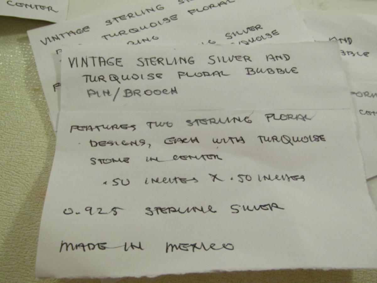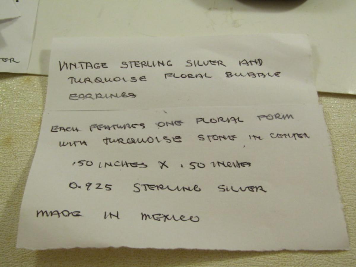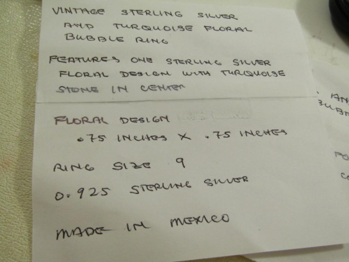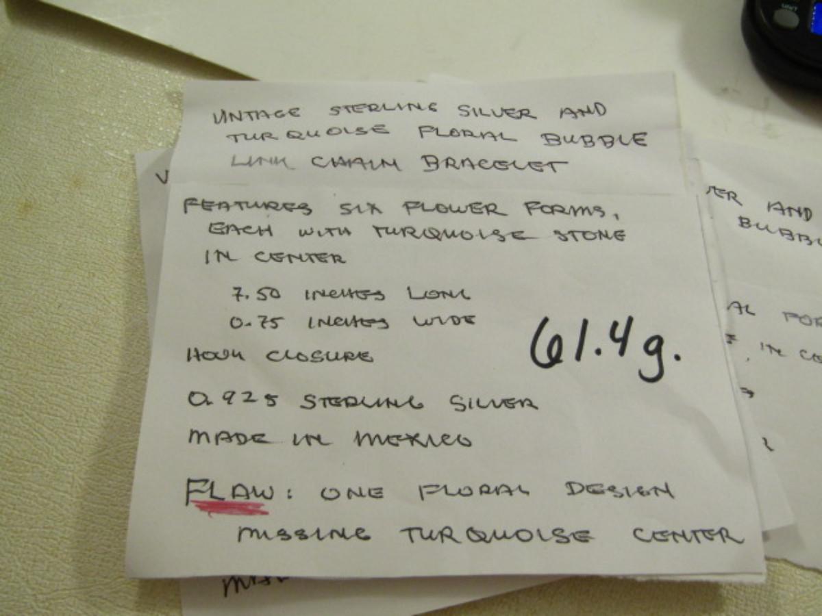 Sterling Silver and Turquoise Floral Design Jewelry Set- Approx 61.4 Grams (#21). Set includes brooch, ring (approx size 7 1/2), bracelet (7 1/2" long), and screw back earrings. Bracelet has one turquoise bead missing- shown in pics.