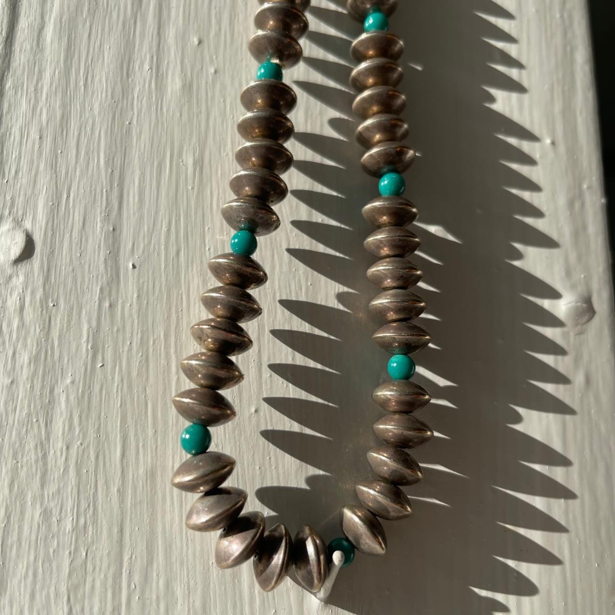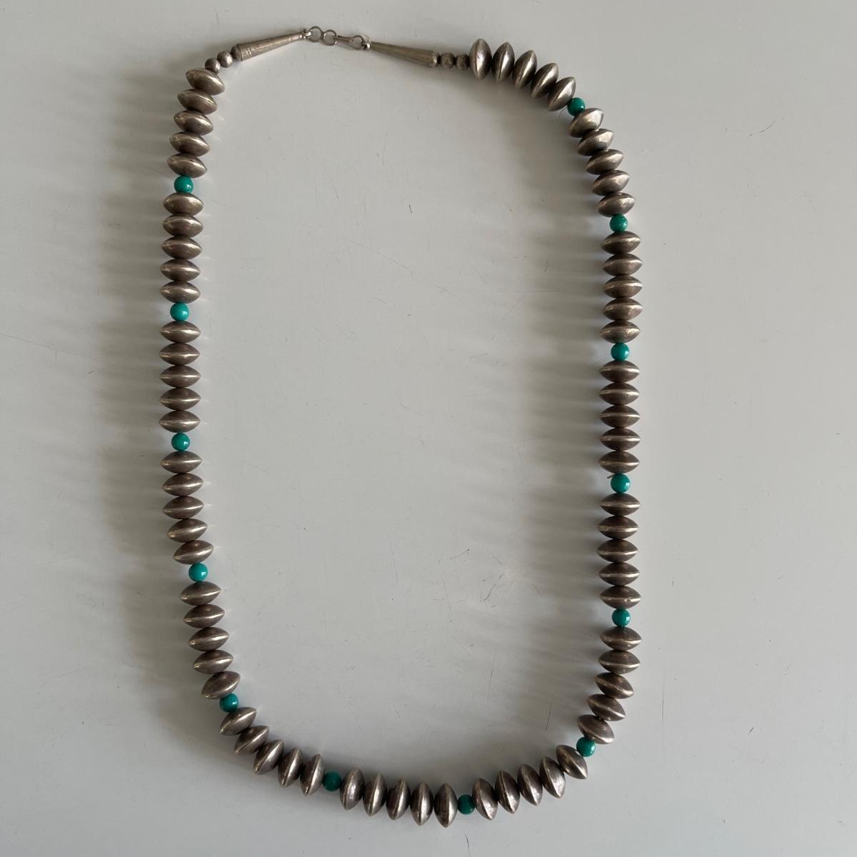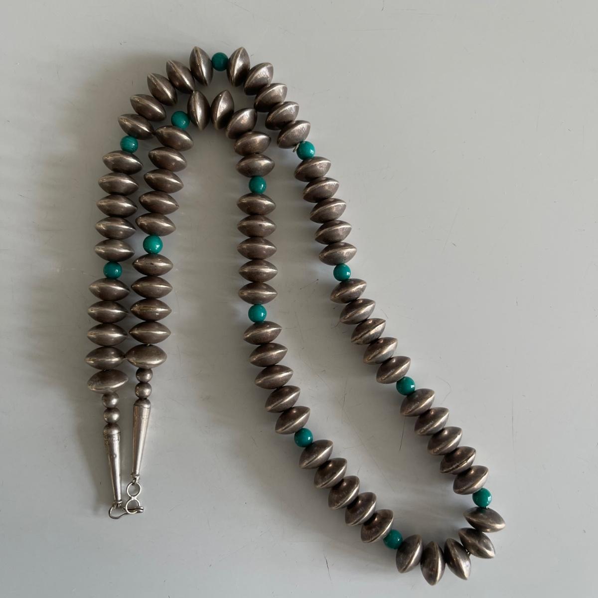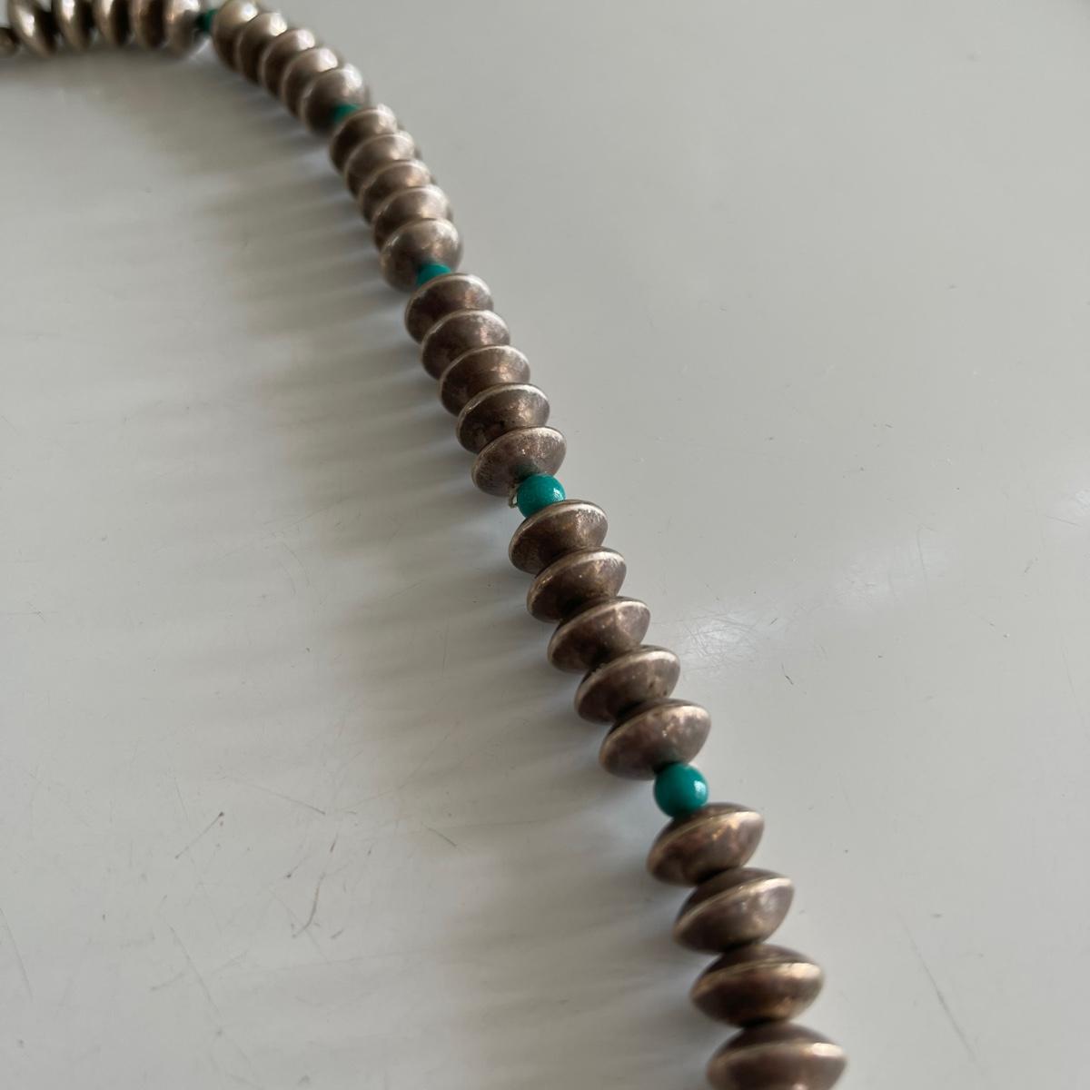This sterling silver and turquoise beaded necklace is made with saucer shaped silver beads and round turquoise beads. Tear dropped cones on either side of the clasp have “sterling” stamped on them. The beads are strung on a fabric string that shows signs of age and should be restrung. From end to end, it measures 24" long.