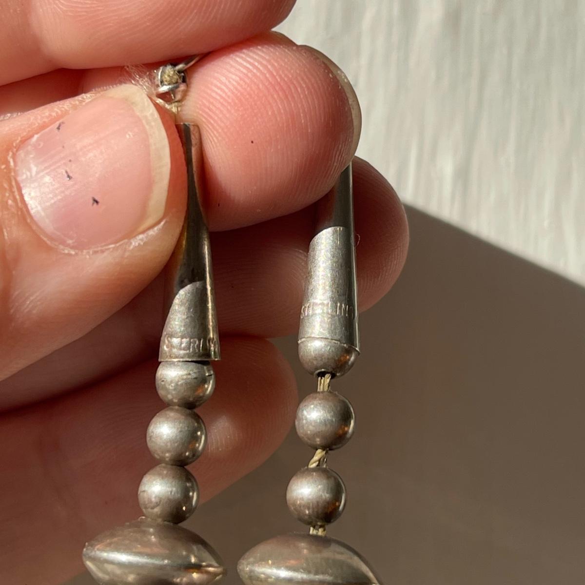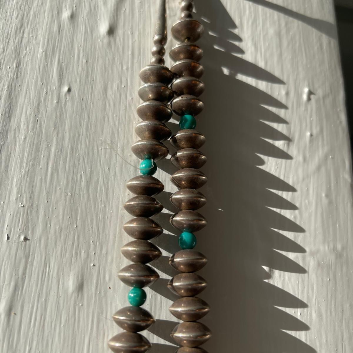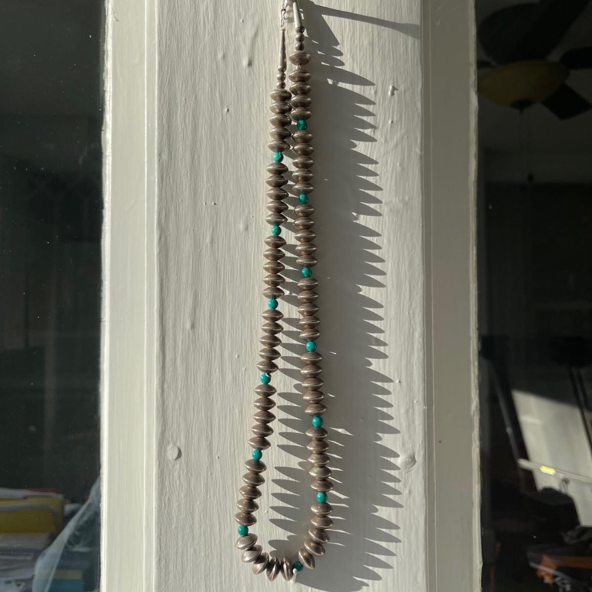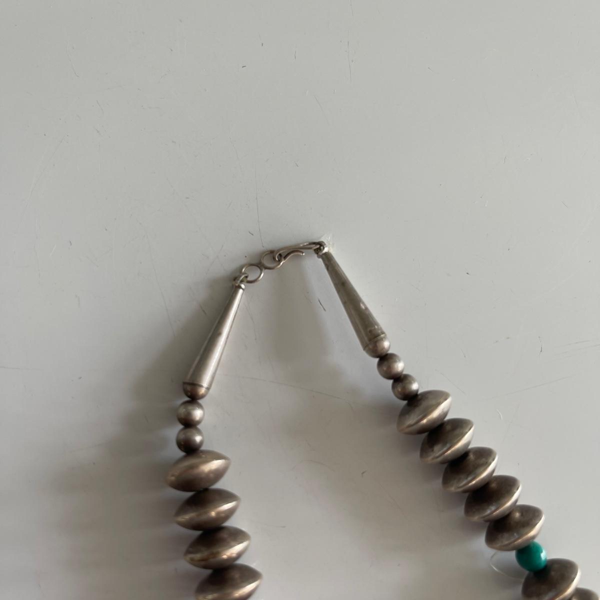 This sterling silver and turquoise beaded necklace is made with saucer shaped silver beads and round turquoise beads. Tear dropped cones on either side of the clasp have “sterling” stamped on them. The beads are strung on a fabric string that shows signs of age and should be restrung. From end to end, it measures 24" long.