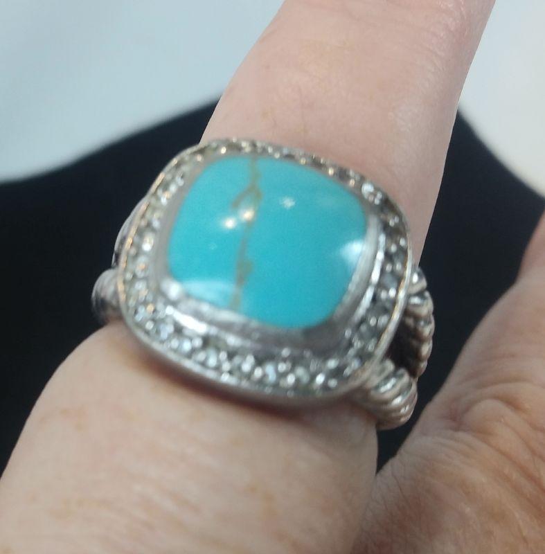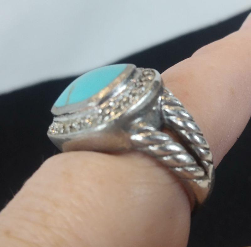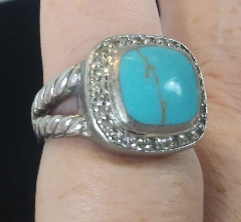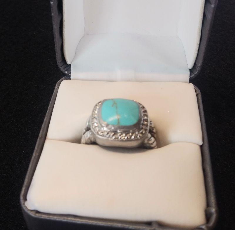 This lot is a Vintage Sterling Silver &Turquoise Ring. Marked Sterling. The band has minor scratching due to age and use. It measures size 6 3/4. The lot includes the ring box. Very smart Reserve/starting bid is $10.