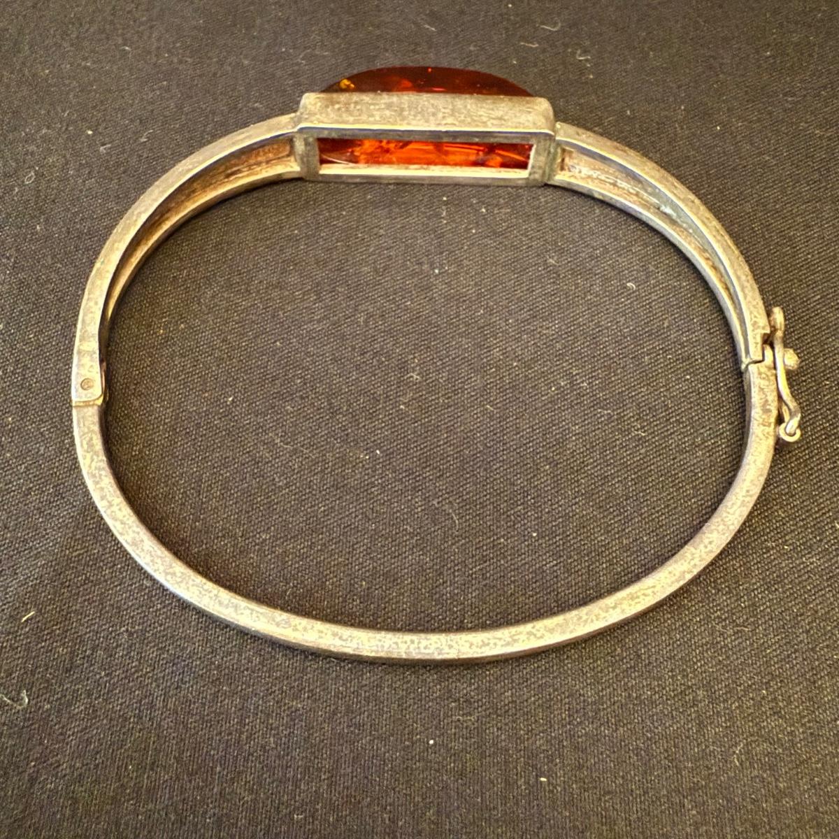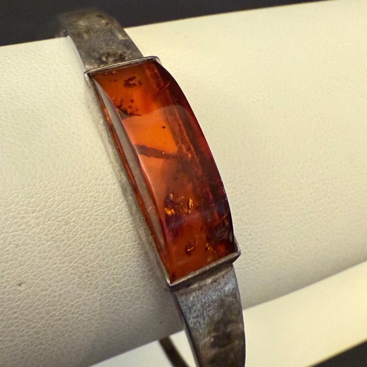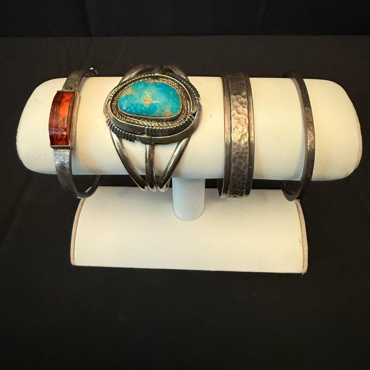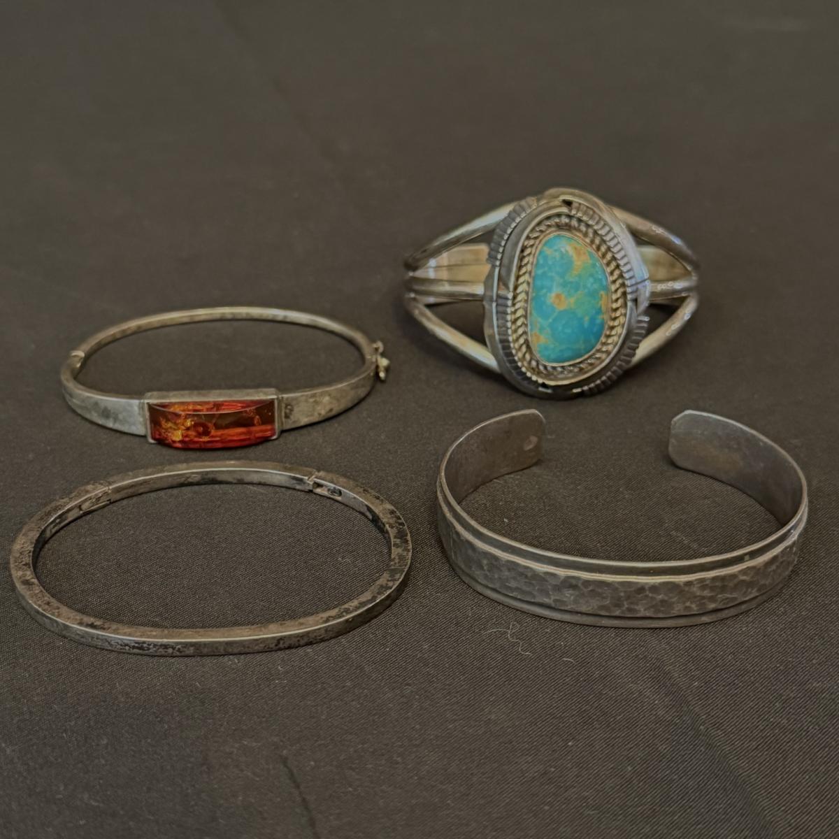 Four bracelets, three are stamped with Sterling hallmarks. One features a gorgeous turquoise stone and is quite a hefty bracket. One has amber; this one doesn’t have any visible hallmarks. Items are tarnished and could use a good polishing.