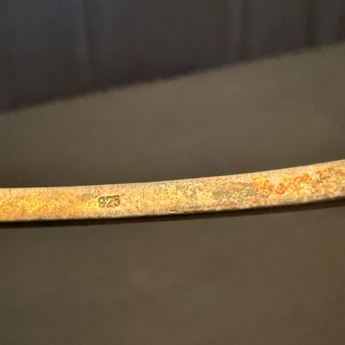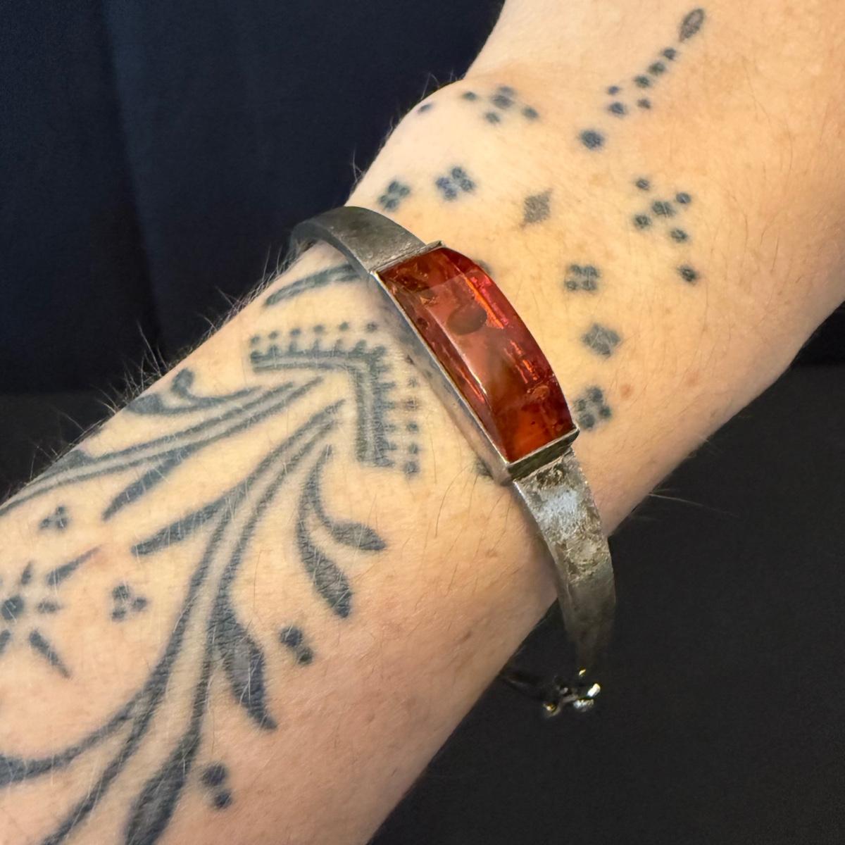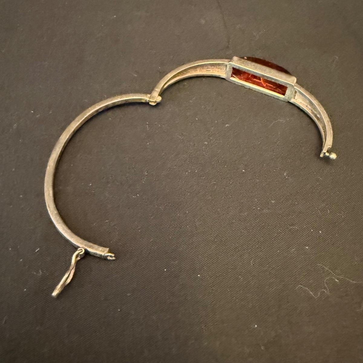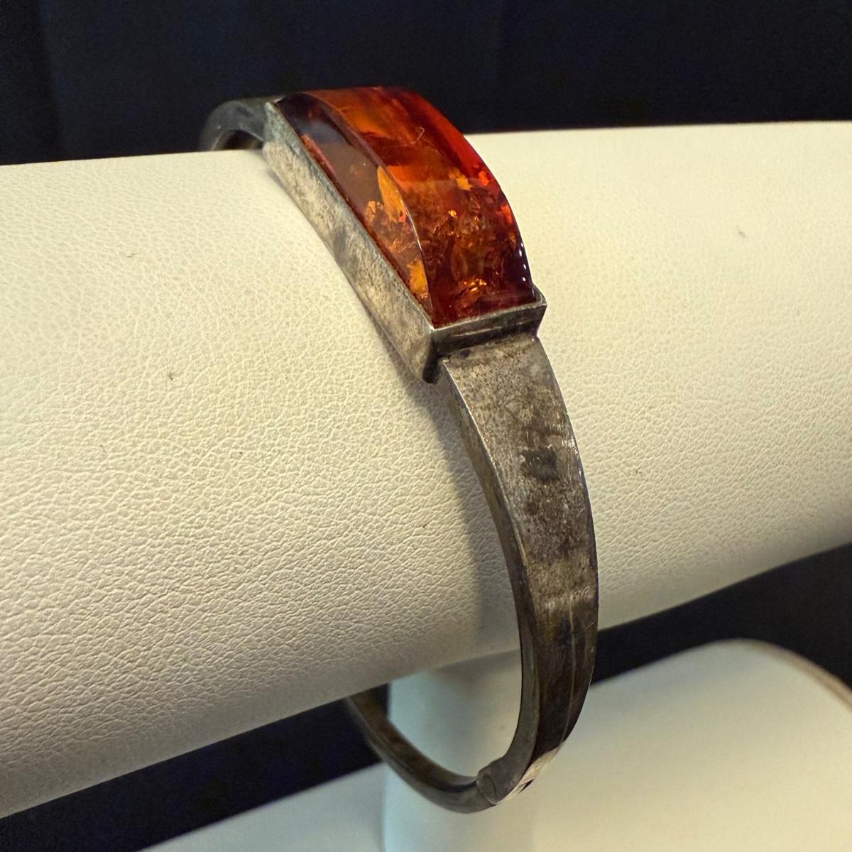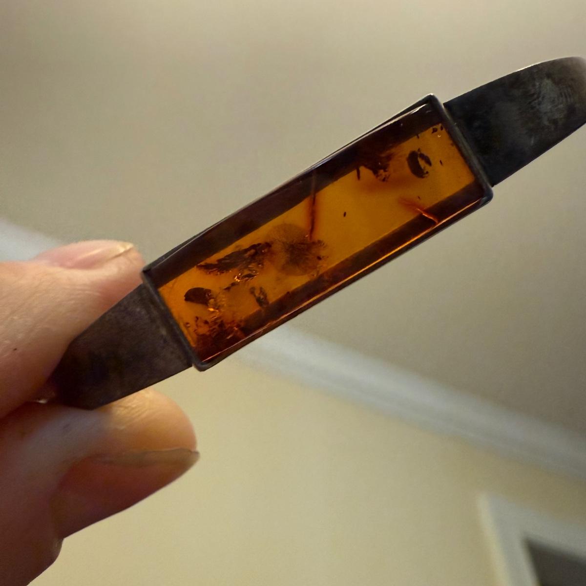 Four bracelets, three are stamped with Sterling hallmarks. One features a gorgeous turquoise stone and is quite a hefty bracket. One has amber; this one doesn’t have any visible hallmarks. Items are tarnished and could use a good polishing.