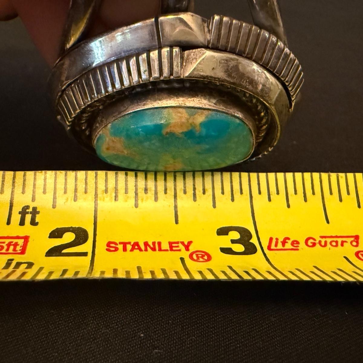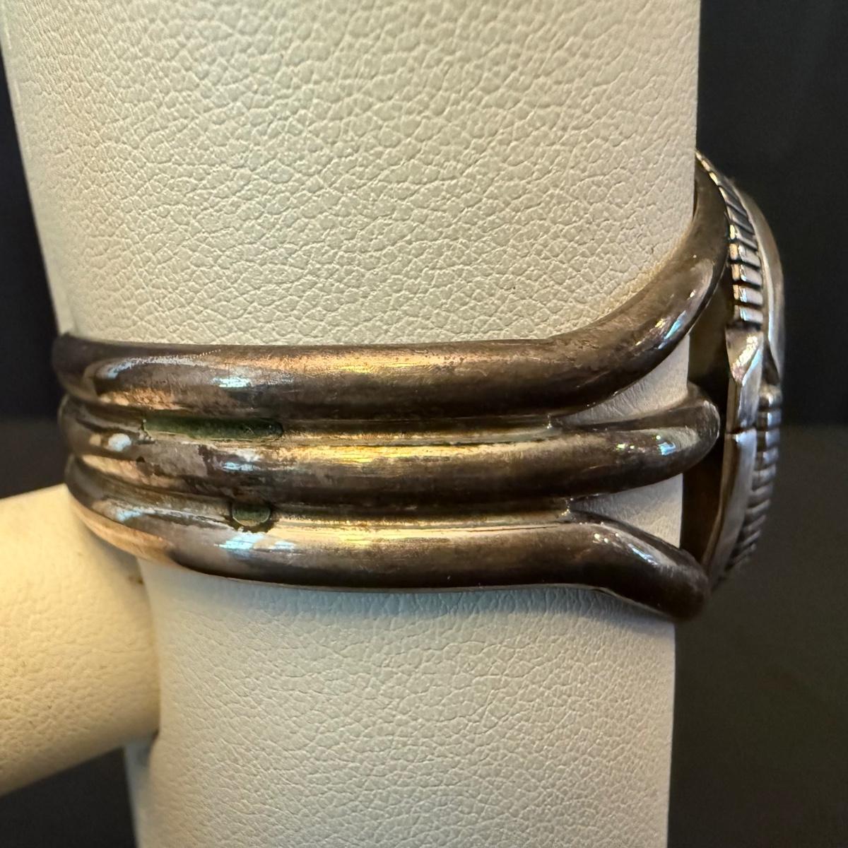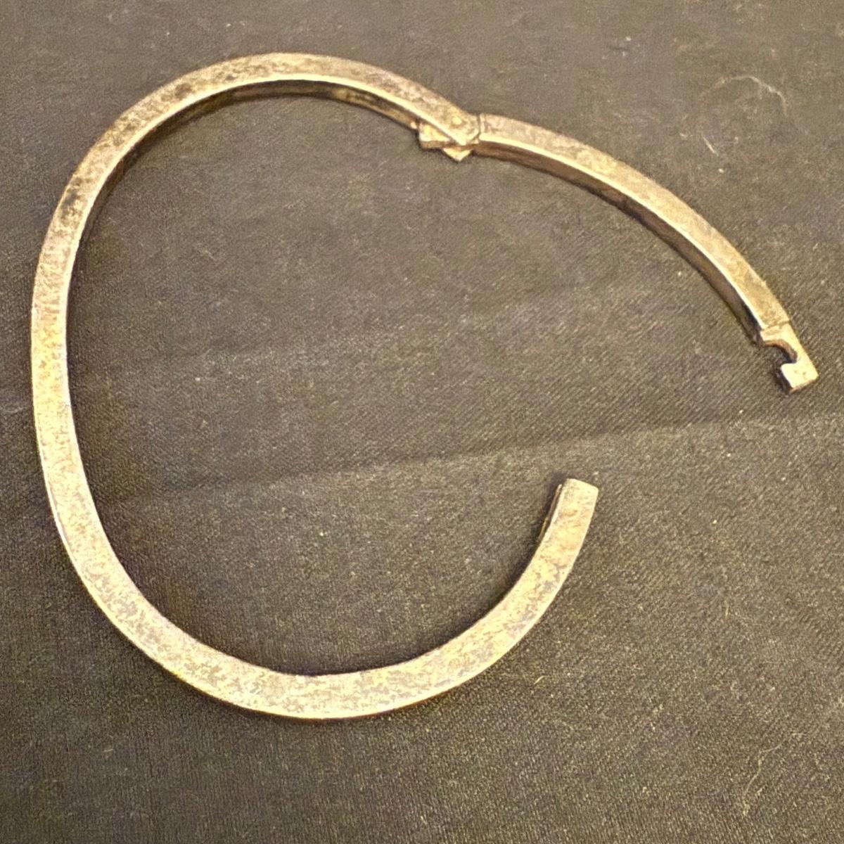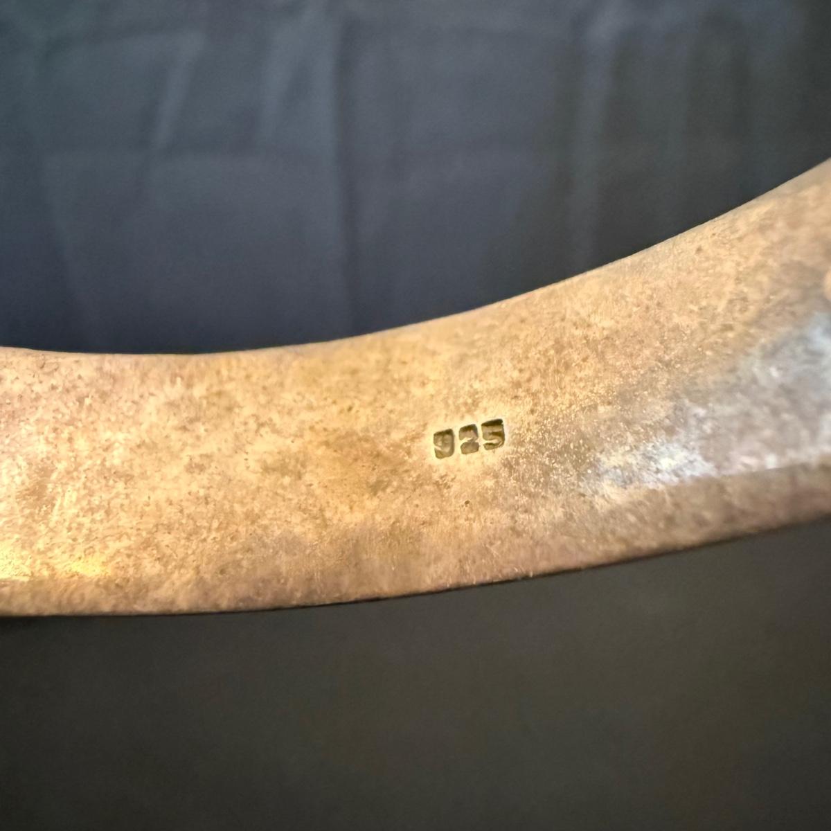 Four bracelets, three are stamped with Sterling hallmarks. One features a gorgeous turquoise stone and is quite a hefty bracket. One has amber; this one doesn’t have any visible hallmarks. Items are tarnished and could use a good polishing.