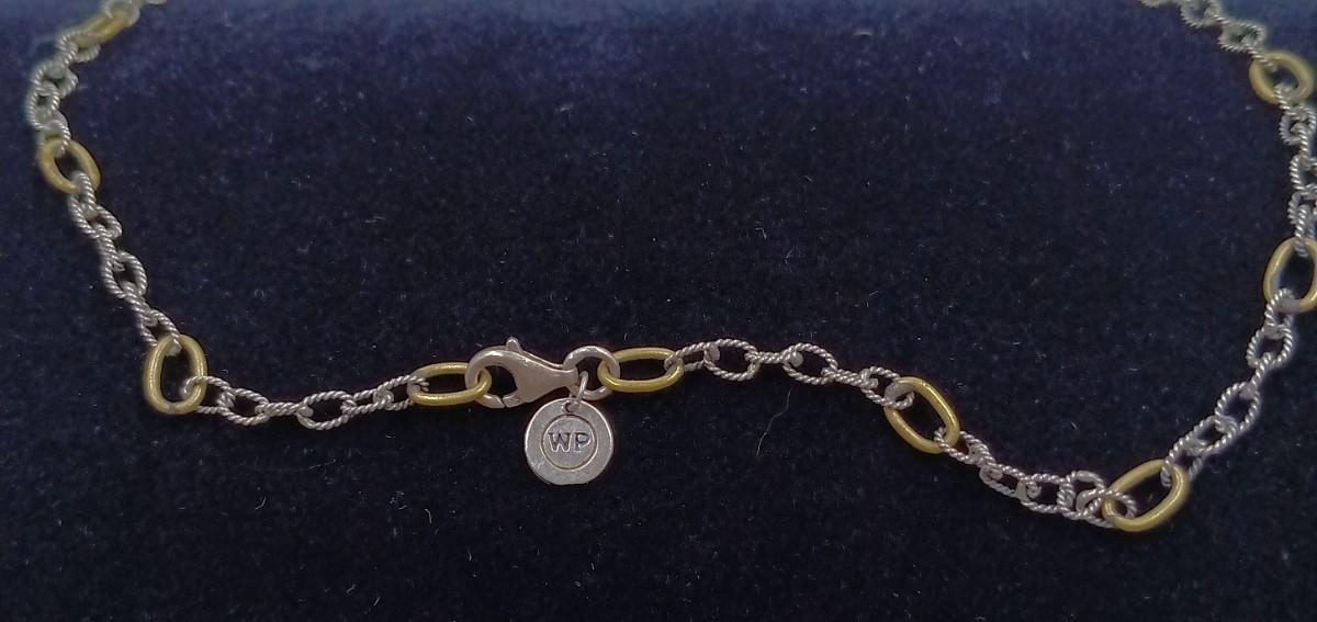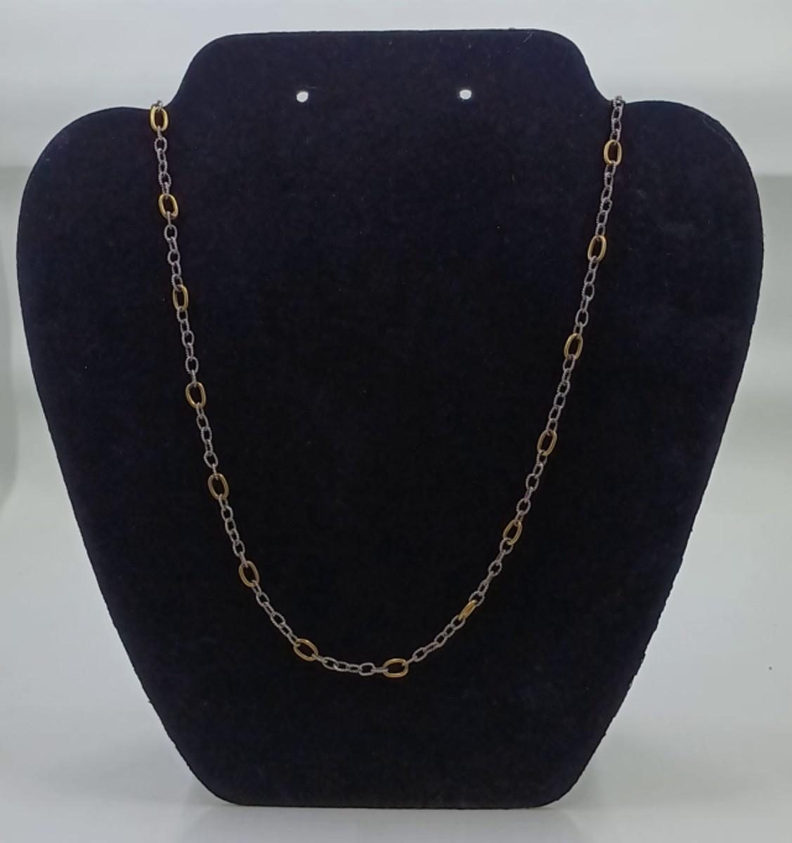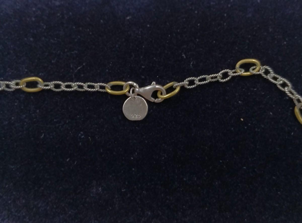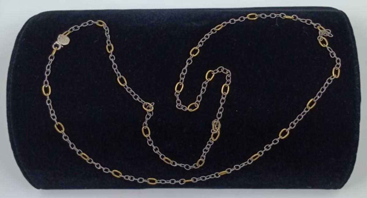 This sterling silver link chain features a brass link every inch on the chain and features a sterling silver lobster clasp. The piece is marked 925 and WP. It is approximately 30" long.
