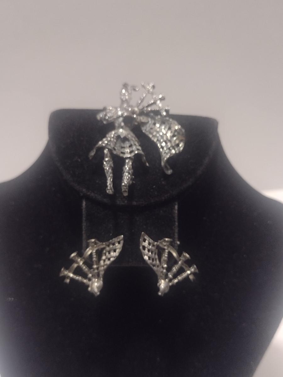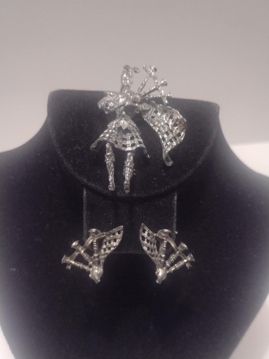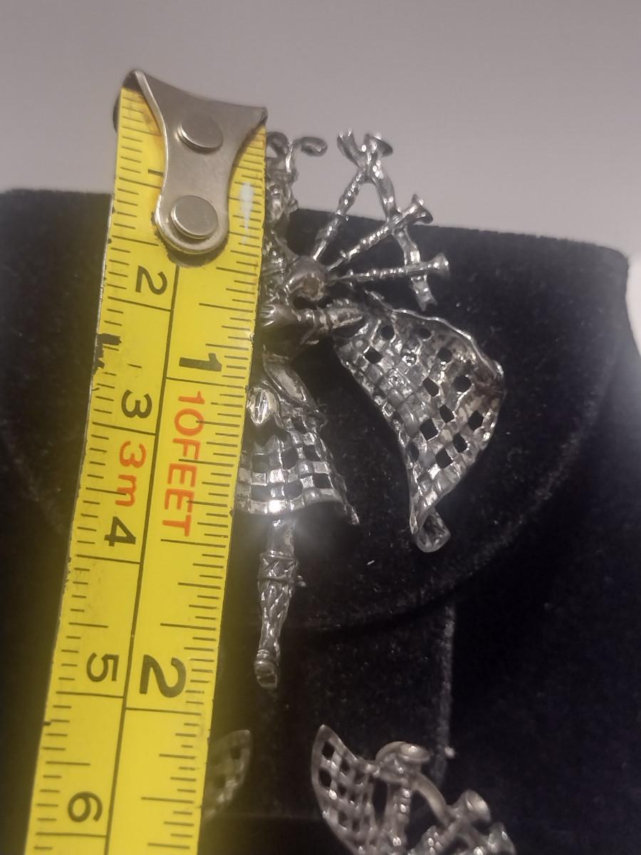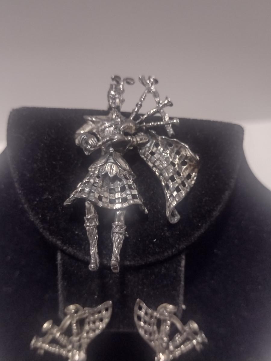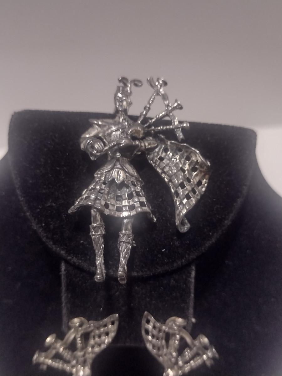 Sterling Silver Brooch and Earrings- Bagpiper Design- Approx Total Weight 15.93 Grams (#8)