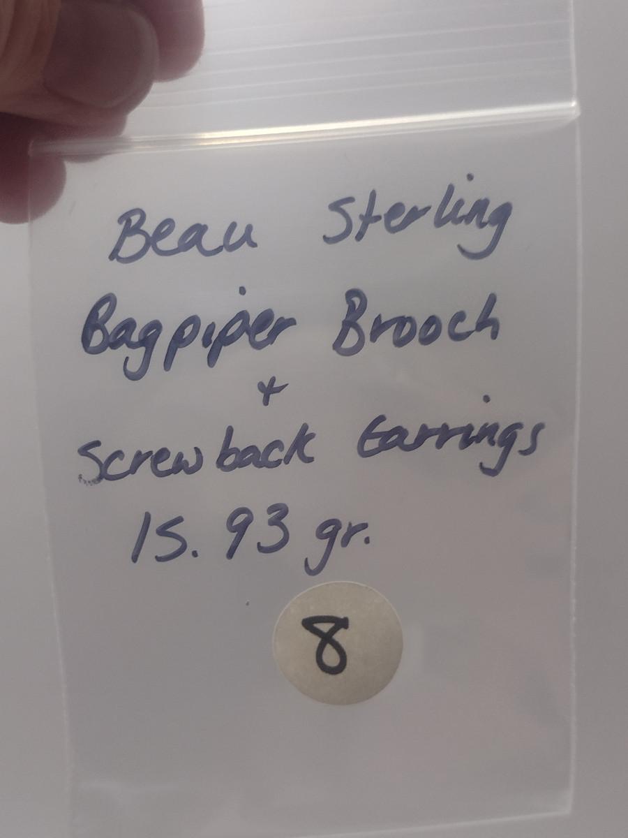 Sterling Silver Brooch and Earrings- Bagpiper Design- Approx Total Weight 15.93 Grams (#8). Earrings are screw back.