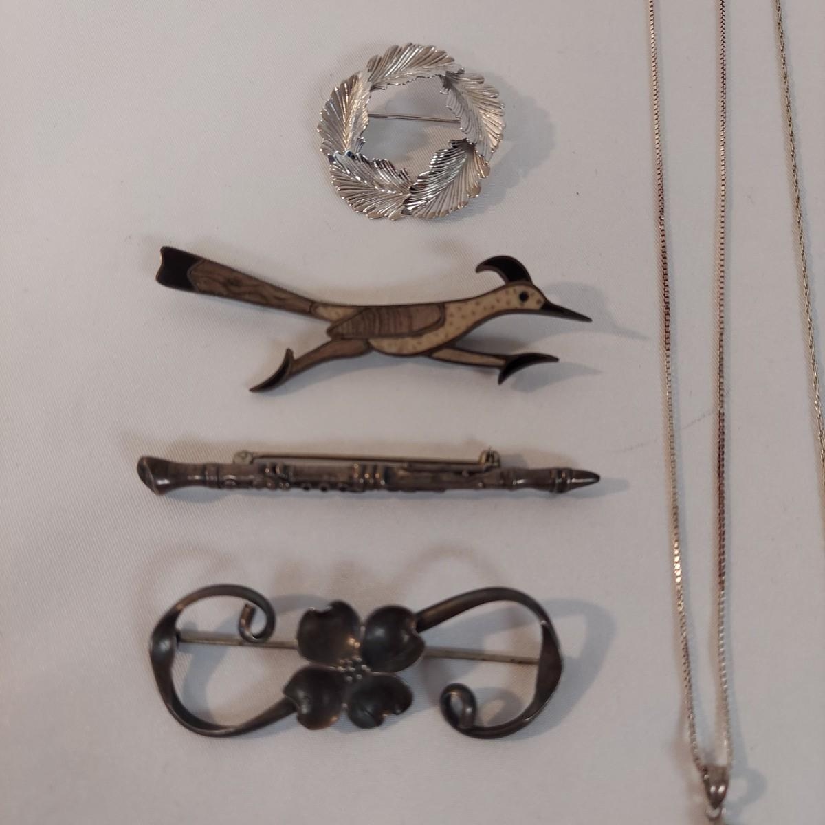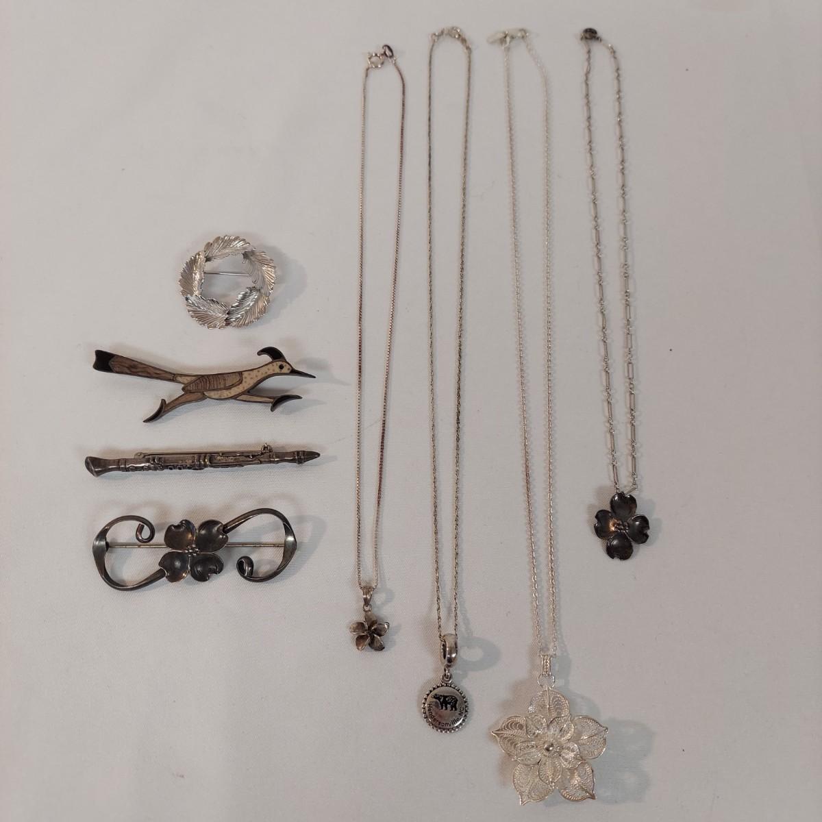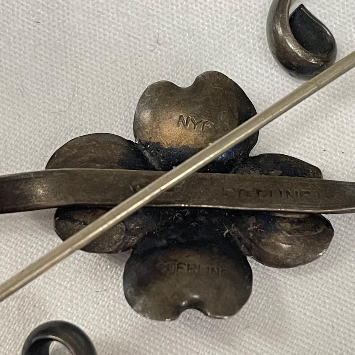 Lot includes four necklaces and four brooches plus a leaf pin with sterling silver stamps. A few items are stamped "NYE", indicating Stuart Nye. The necklaces range from 14-18" long. Please see photos for all markings found. All sales are final. No returns or refunds. Please bid accordingly.