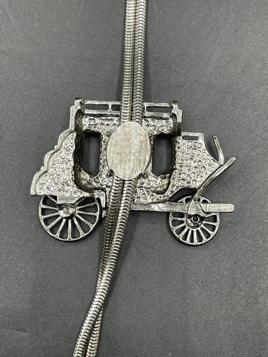 Item is in good condition. The necklace can’t be adjusted but it is long enough to fit around anyones neck. The wheels on the carriage move.
