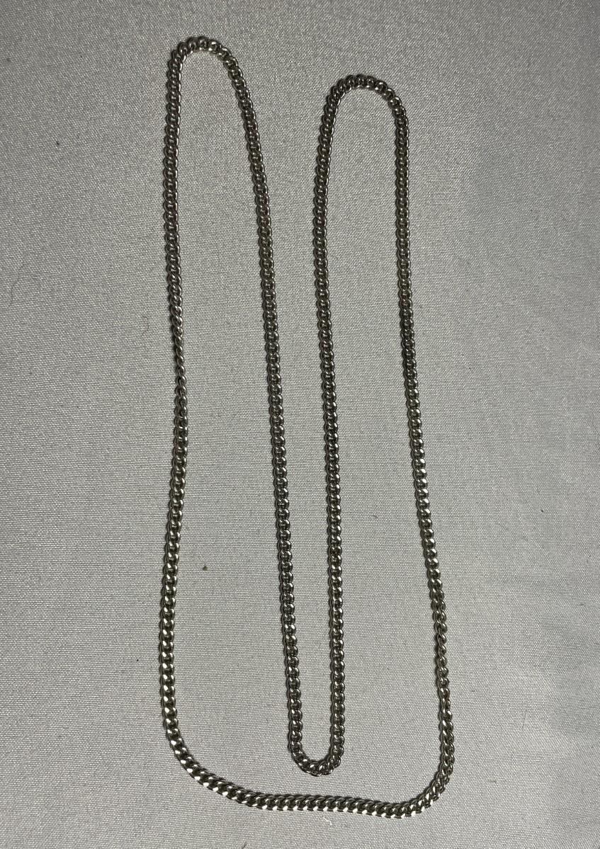 This is designed to go over your head as it doesn't have any type of closure. It is about 26 inches long and weighs about 13.91 grams.