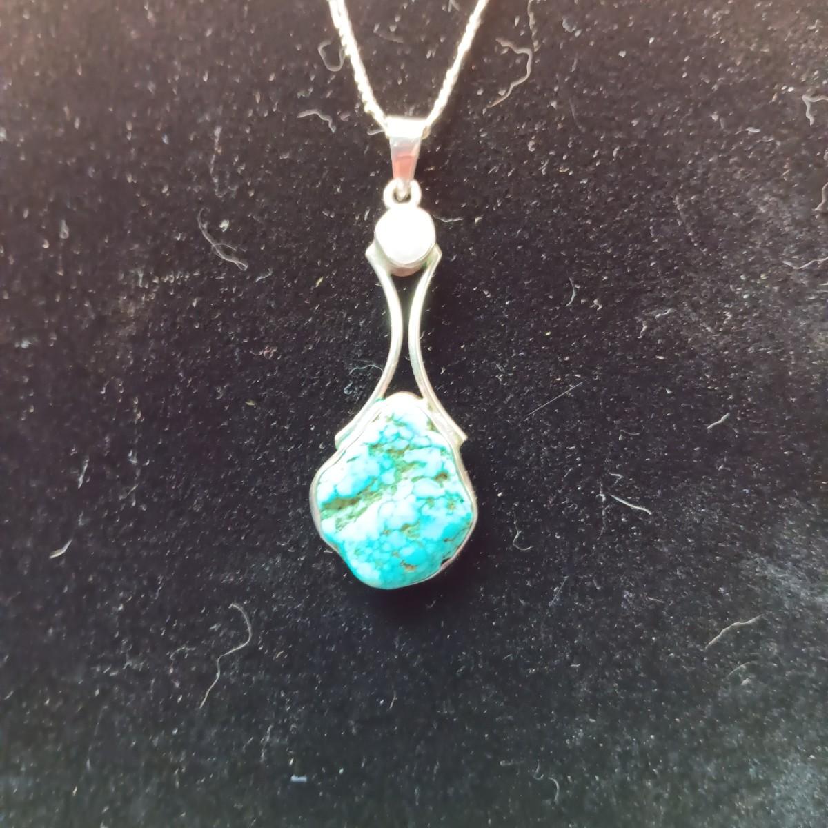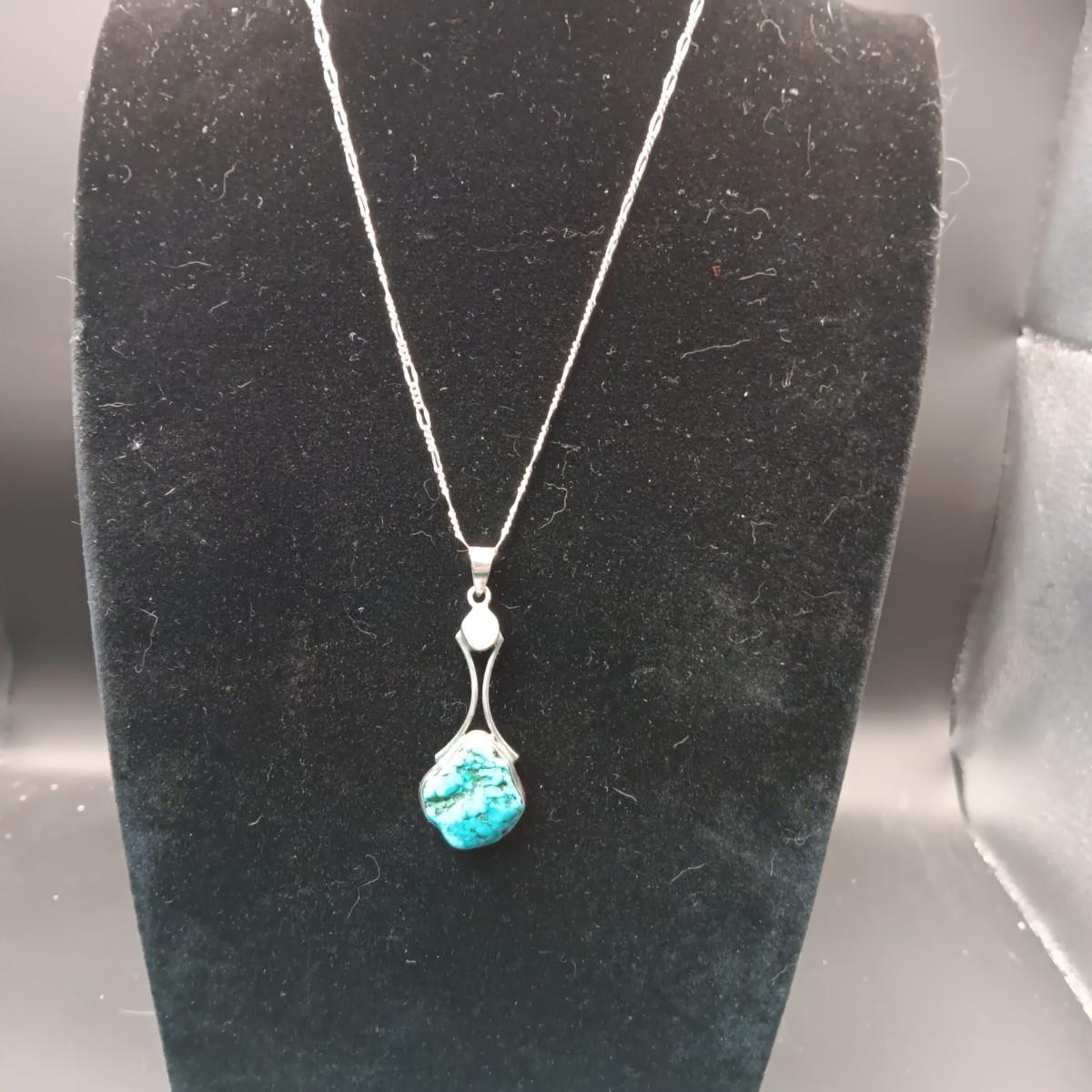 STERLING SILVER CHAIN AND PENDANT WITH GENUINE PEARL AND CHUNK OF TURQUOISE