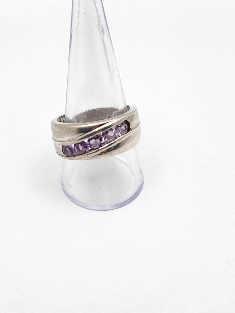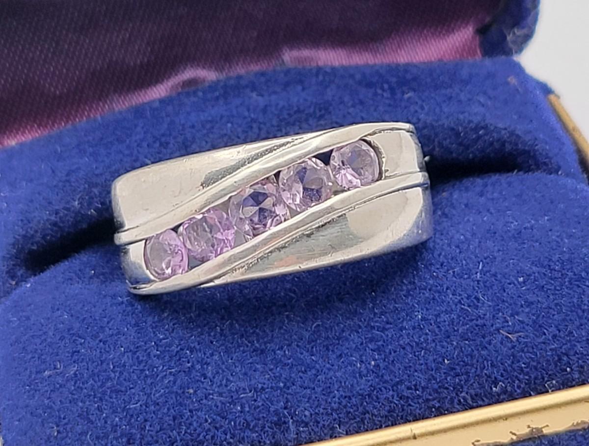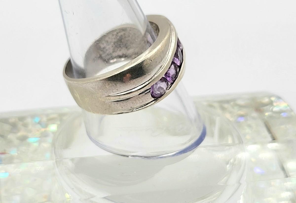 Men's sterling silver ring with channel set created purple amethyst stones. Size 10. Stamped Orchid 925.