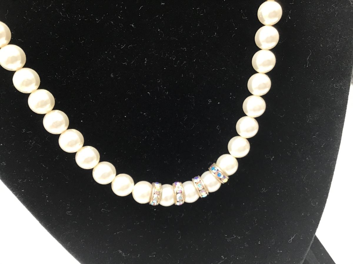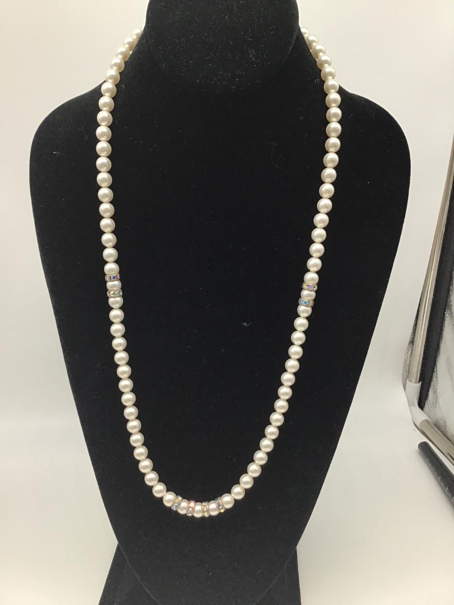 Sterling Silver Clasp Beautiful Faux Pearl necklace with Rhinestone Accent