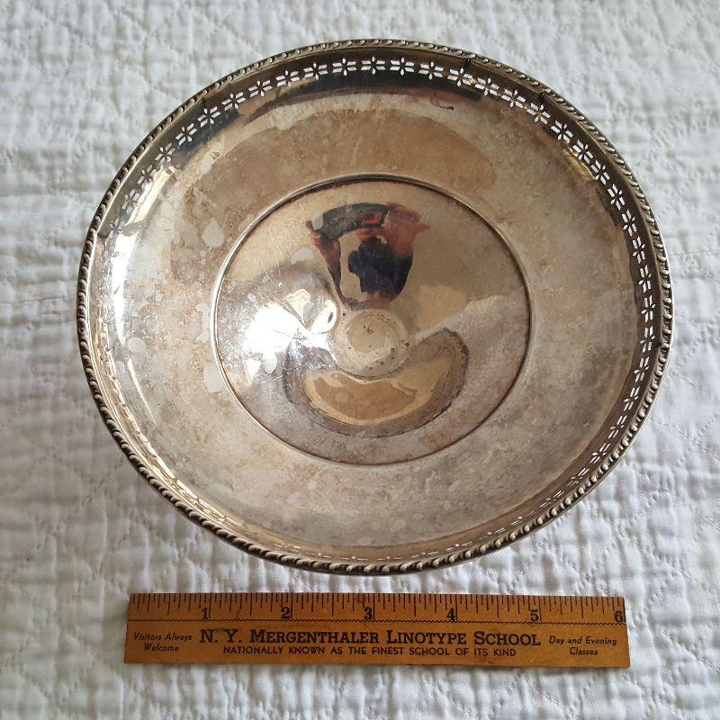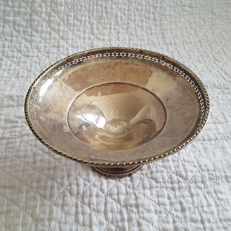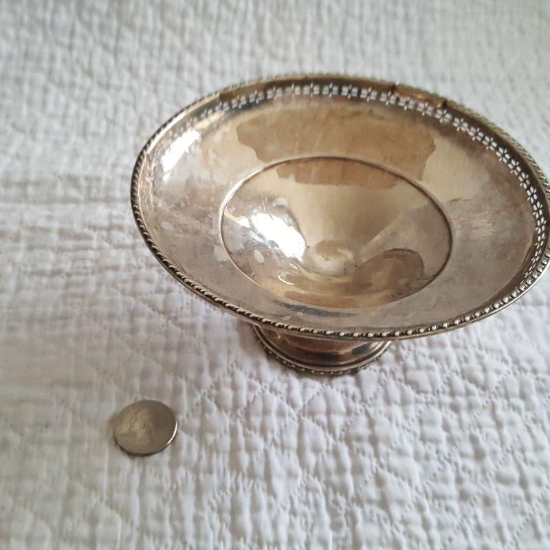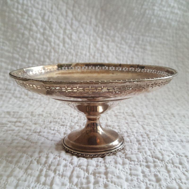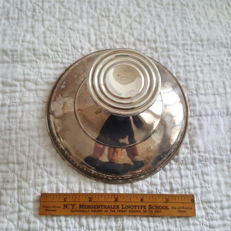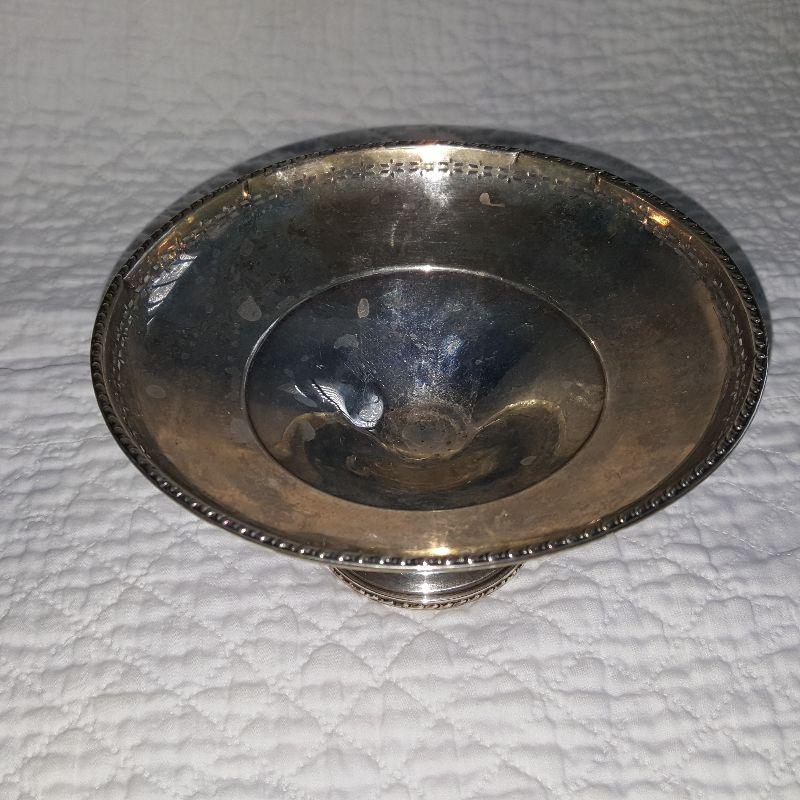 This auction lot is for a vintage M. Fred Hirsch Sterling Silver Compote. This compote that has seen some use with several areas of minor denting but still quite ready to hold a pound of candy or two should you choose. This is a weighted compote that weighs 4.205 ozt as it sits. Marked MFH. Model 401. The Hirsch Silver Company operated until 1945 in Jersey City, NJ.