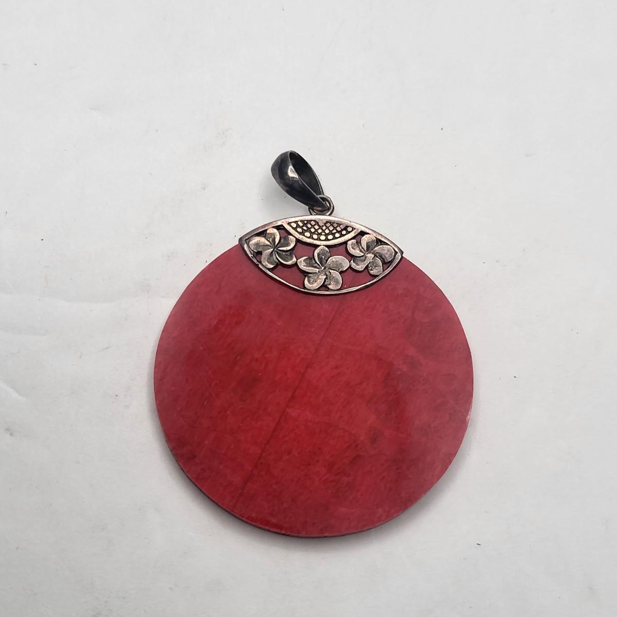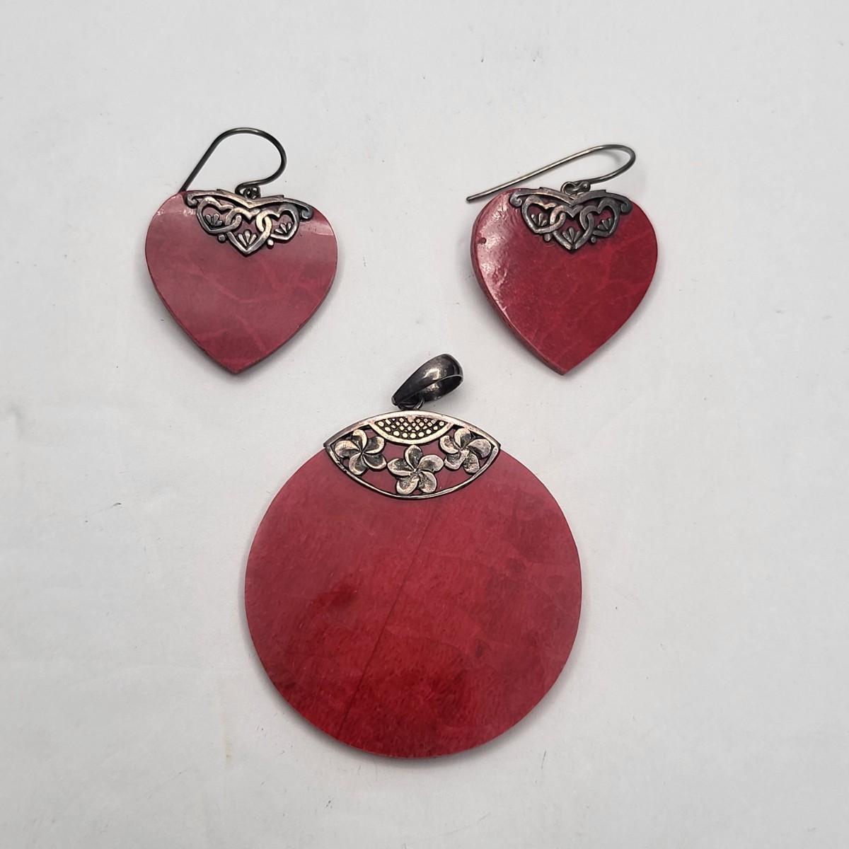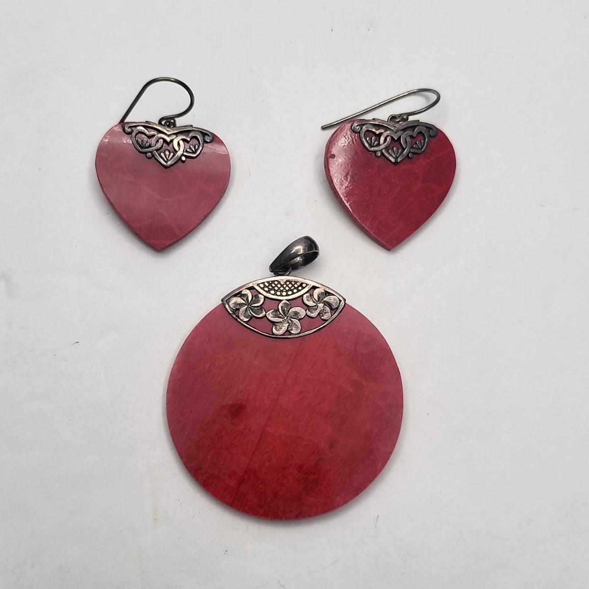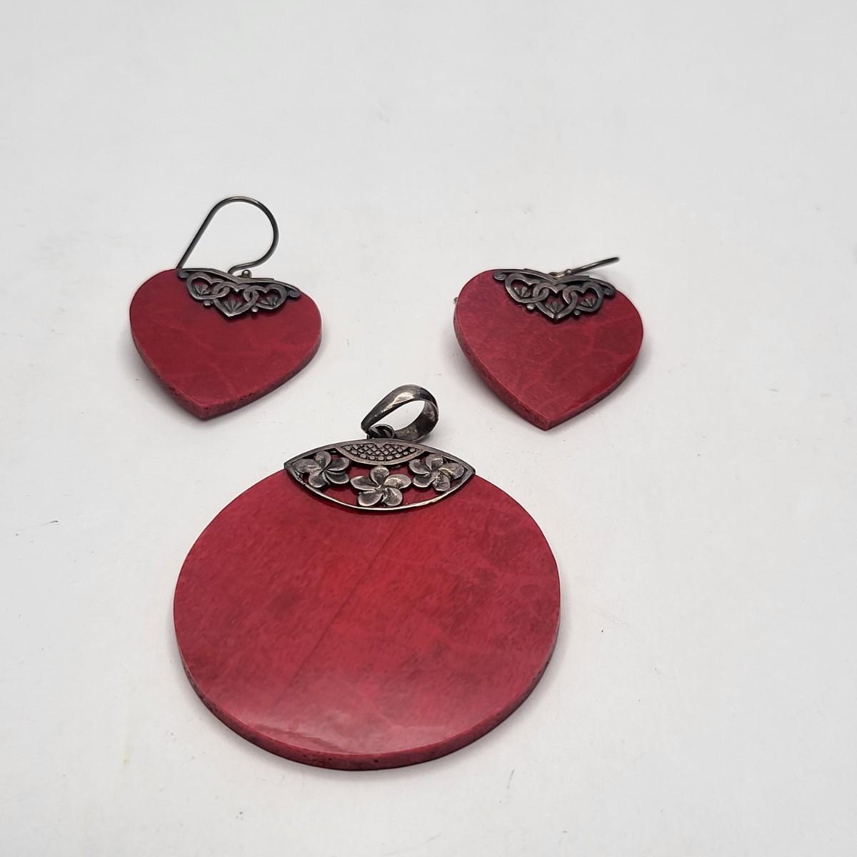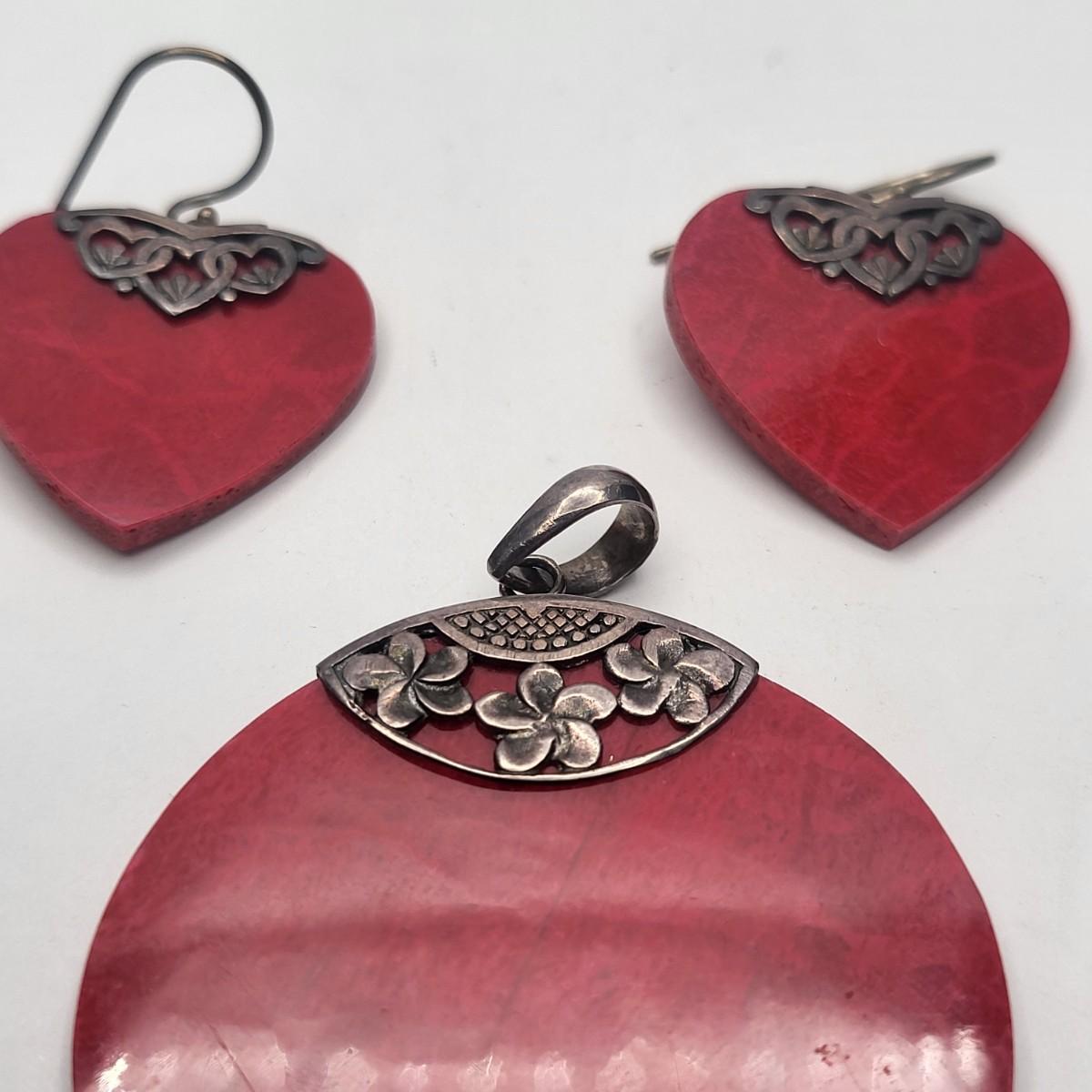 925 Sterling Silver and Coral. Made in Indonesia. Round pendant is 1.75" and heart shape pierced earrings are 1.25". Intricate 925 openwork accent patterns of hearts & flowers.