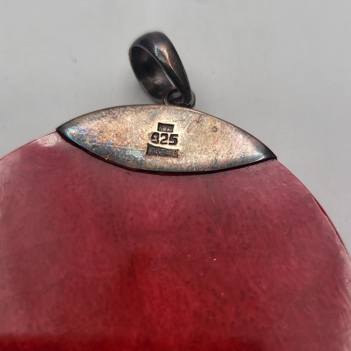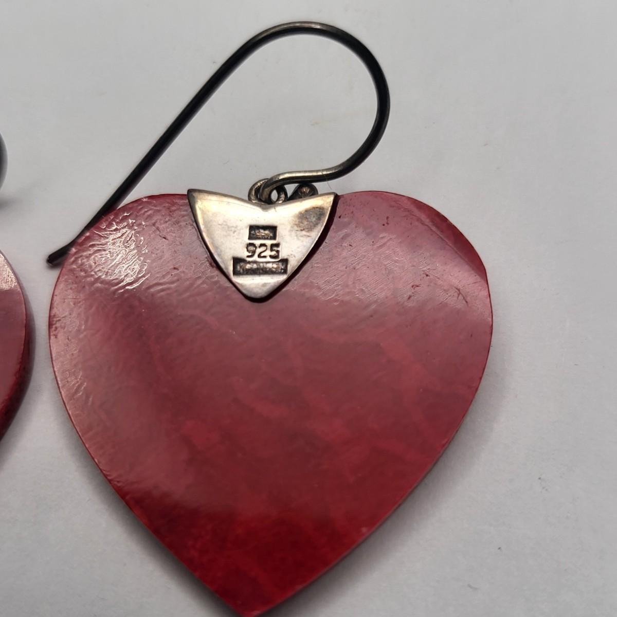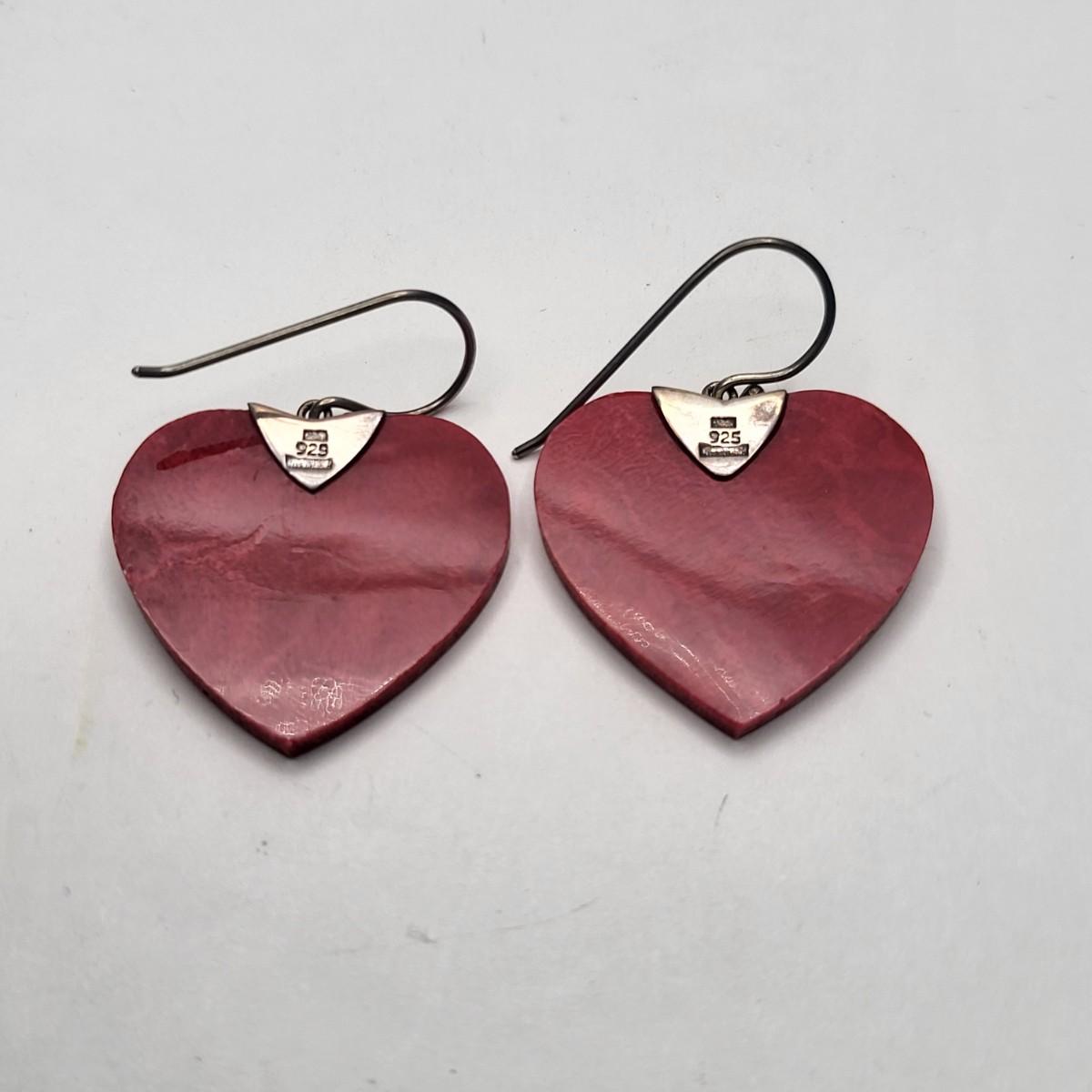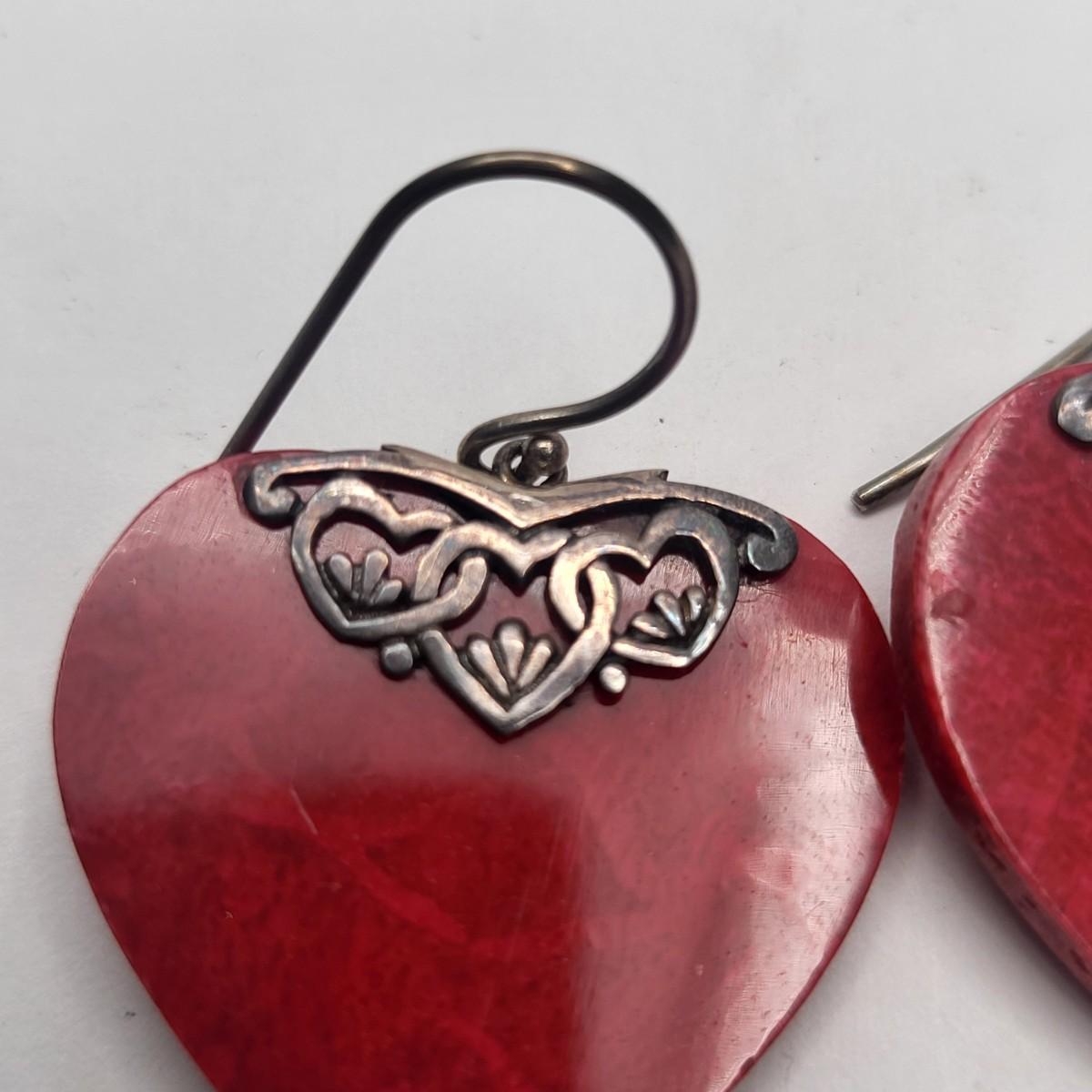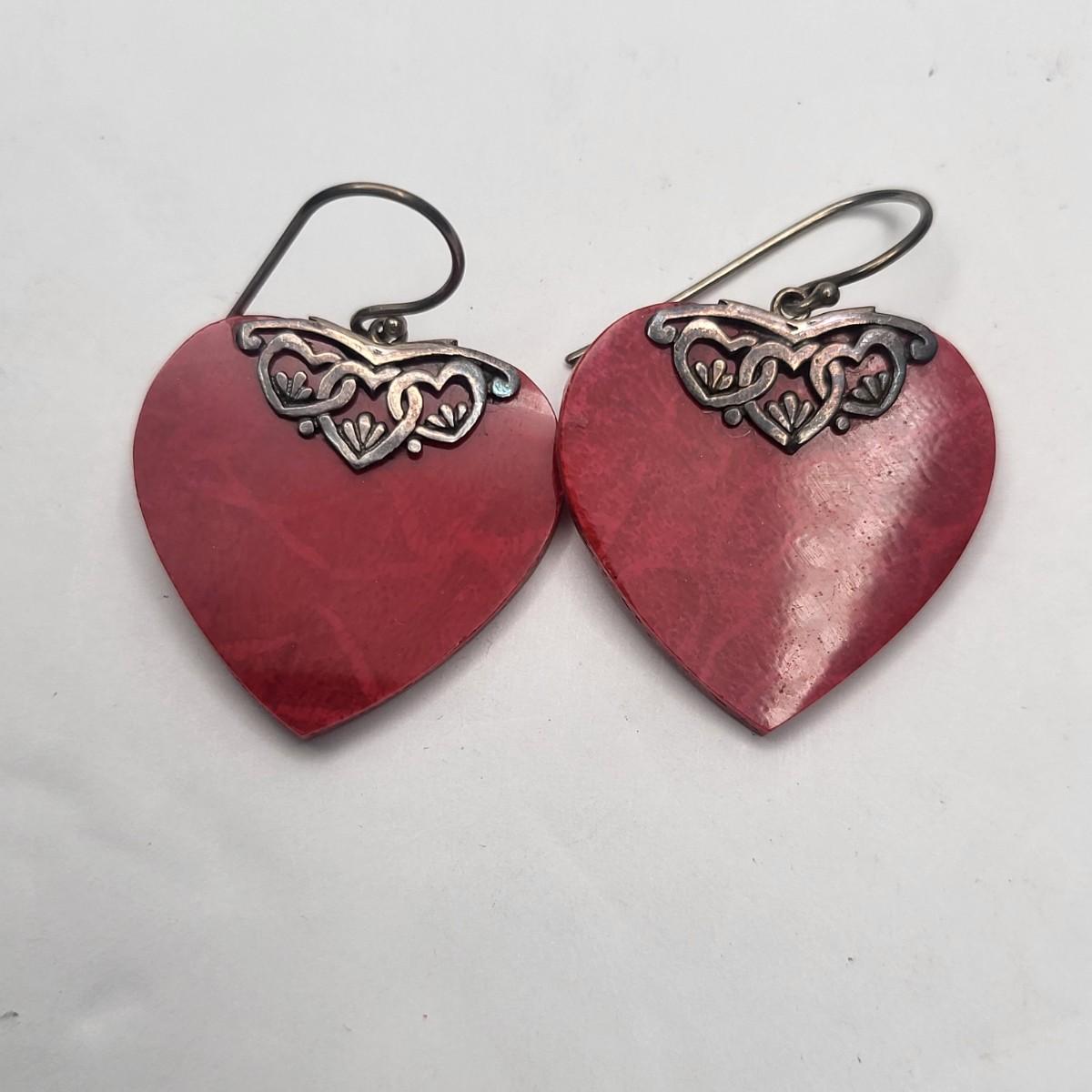 925 Sterling Silver and Coral. Made in Indonesia. Round pendant is 1.75" and heart shape pierced earrings are 1.25". Intricate 925 openwork accent patterns of hearts & flowers.
