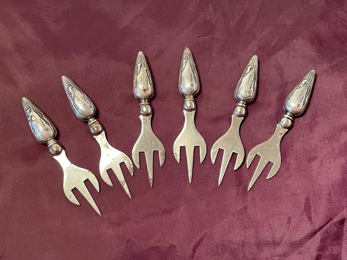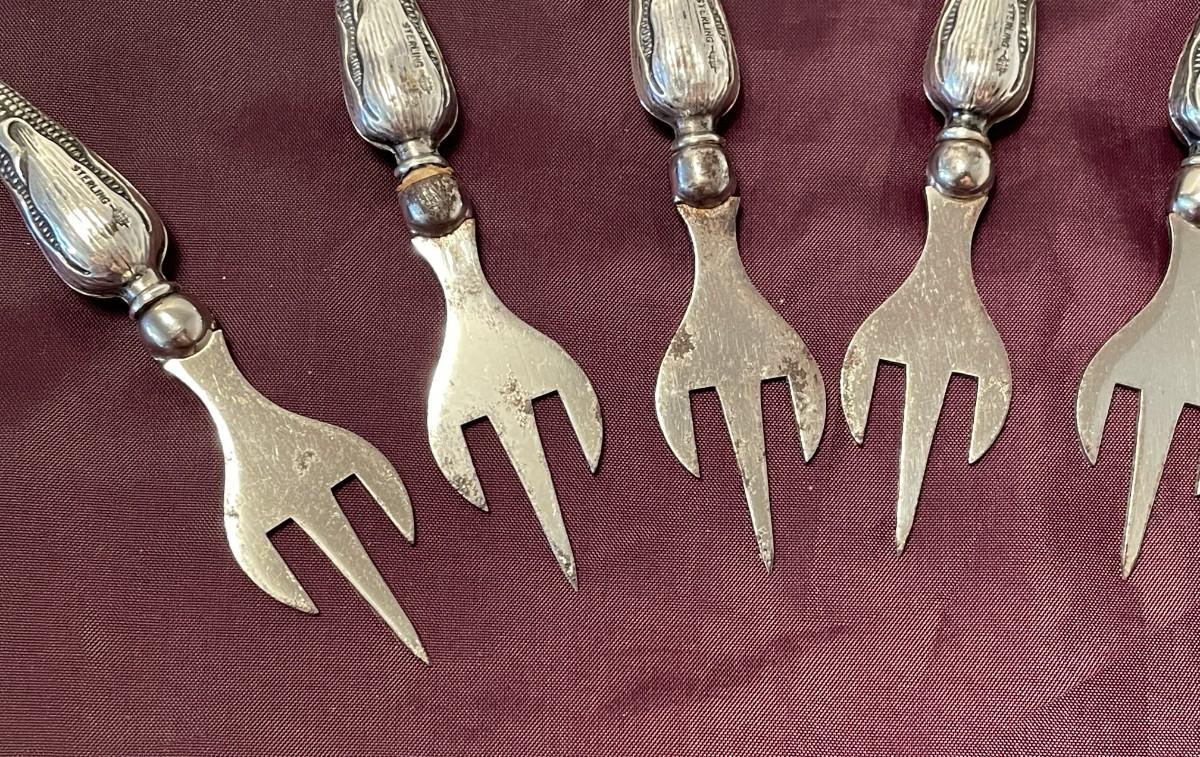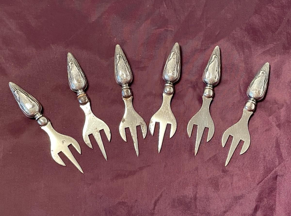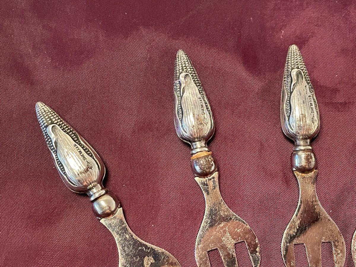 Each of these is just under 3.5 inches long and stamped sterling on the corn shaped handle. There are a few tines that have some wear, but they go into the corn cob and would not be an issue. The hallmark indicates that they were made by Webster.