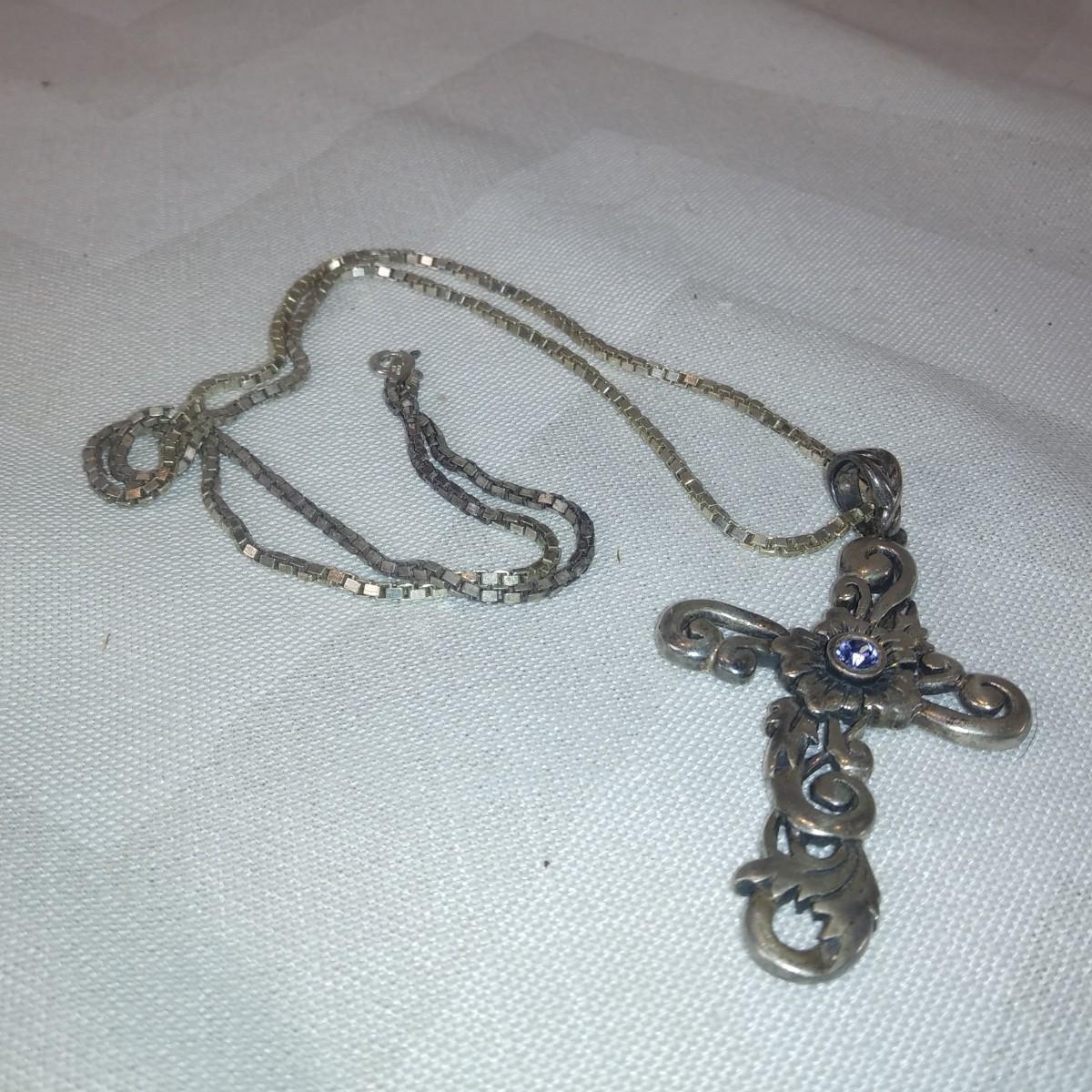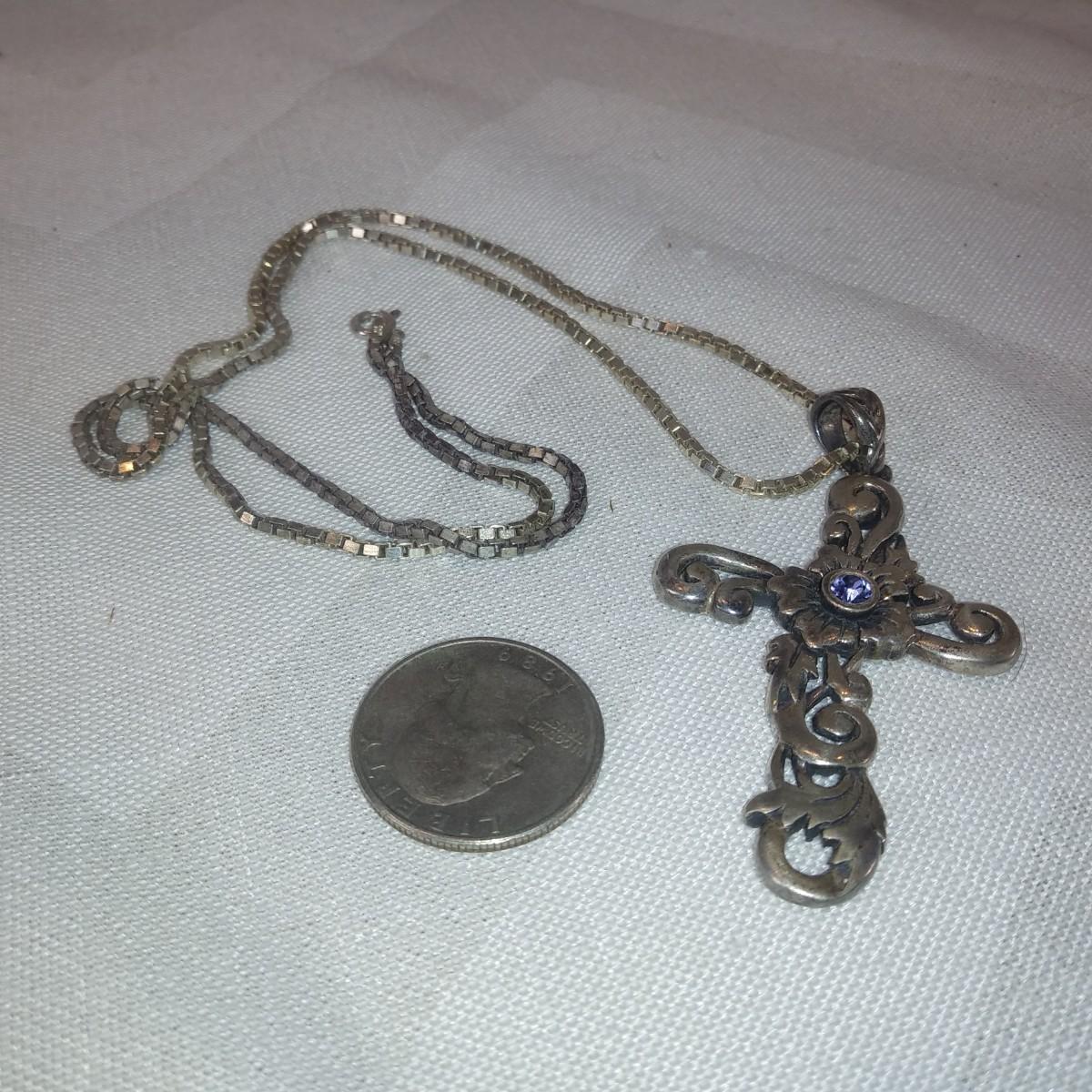 This auction lot is for a Sterling Silver Cross and Necklace. This is a very nice, heavy sterling silver box chain necklace. The Cross is marked 925 - Barse, the chain is marked Italy 925 and is about 24-inches long. Together they weight at .90 toz.