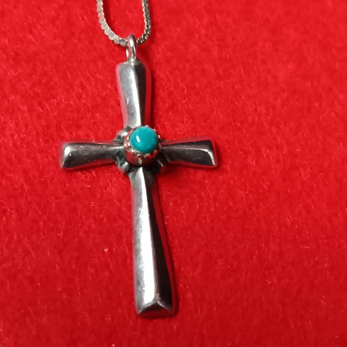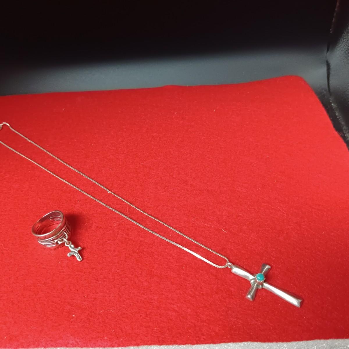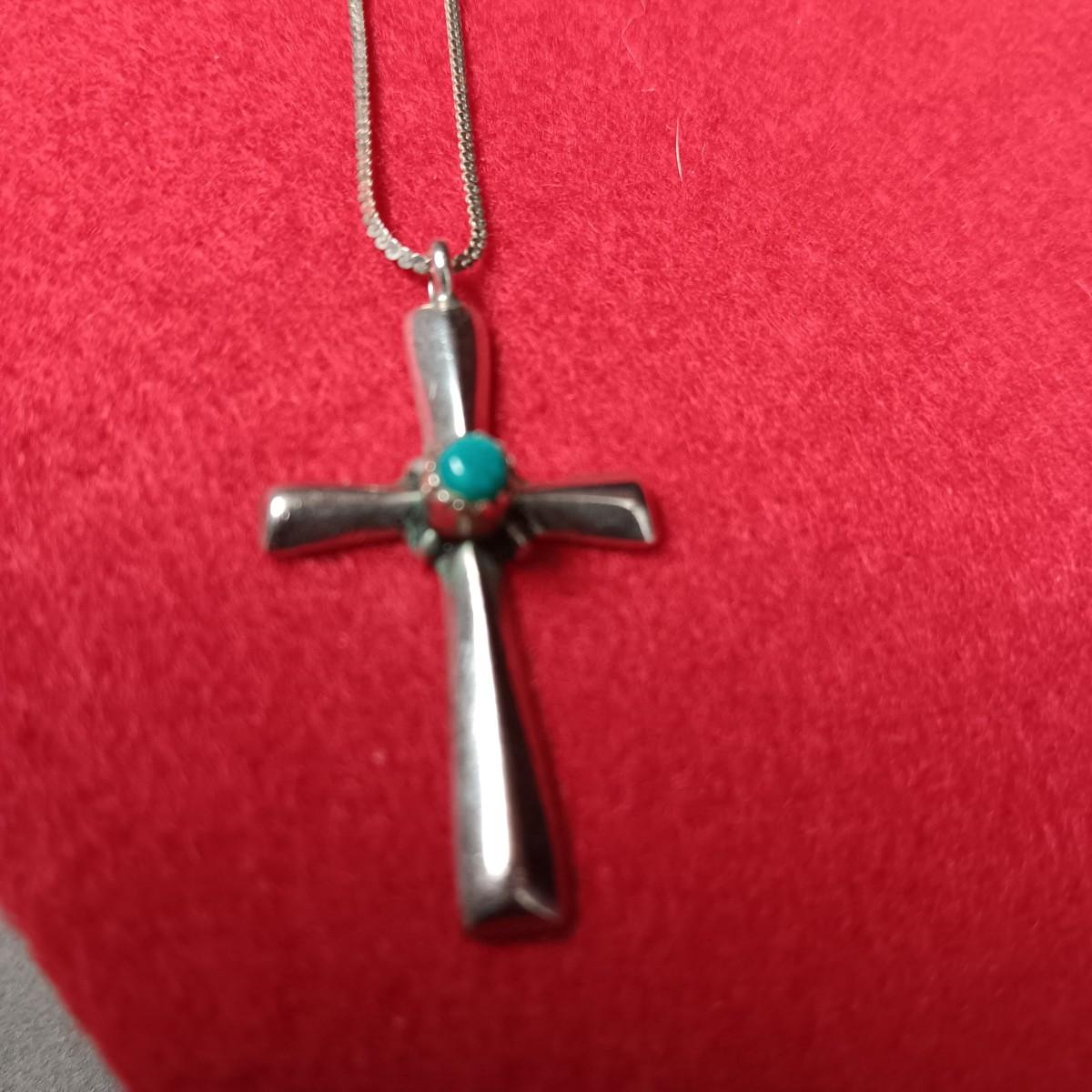 STERLING SILVER CROSS W/ TURQUOISE STONE ON A STERLING CHAIN PLUS A .925 RING WITH DANGLING CROSS MARKED "ISRAEL" SIZE SIX 13.14g