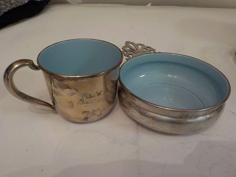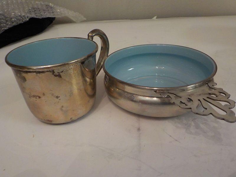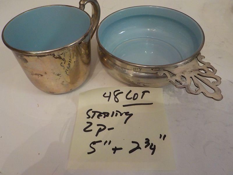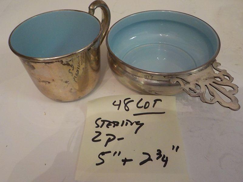 Sterling cup and mini bowl sterling silver with a blue ceramic inside finish.. size 5 " and a 2.5 inch.