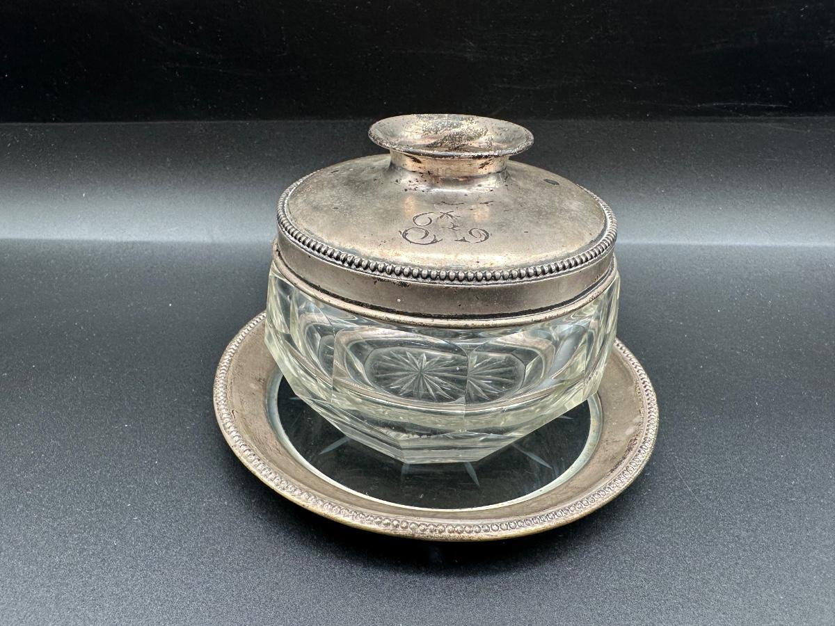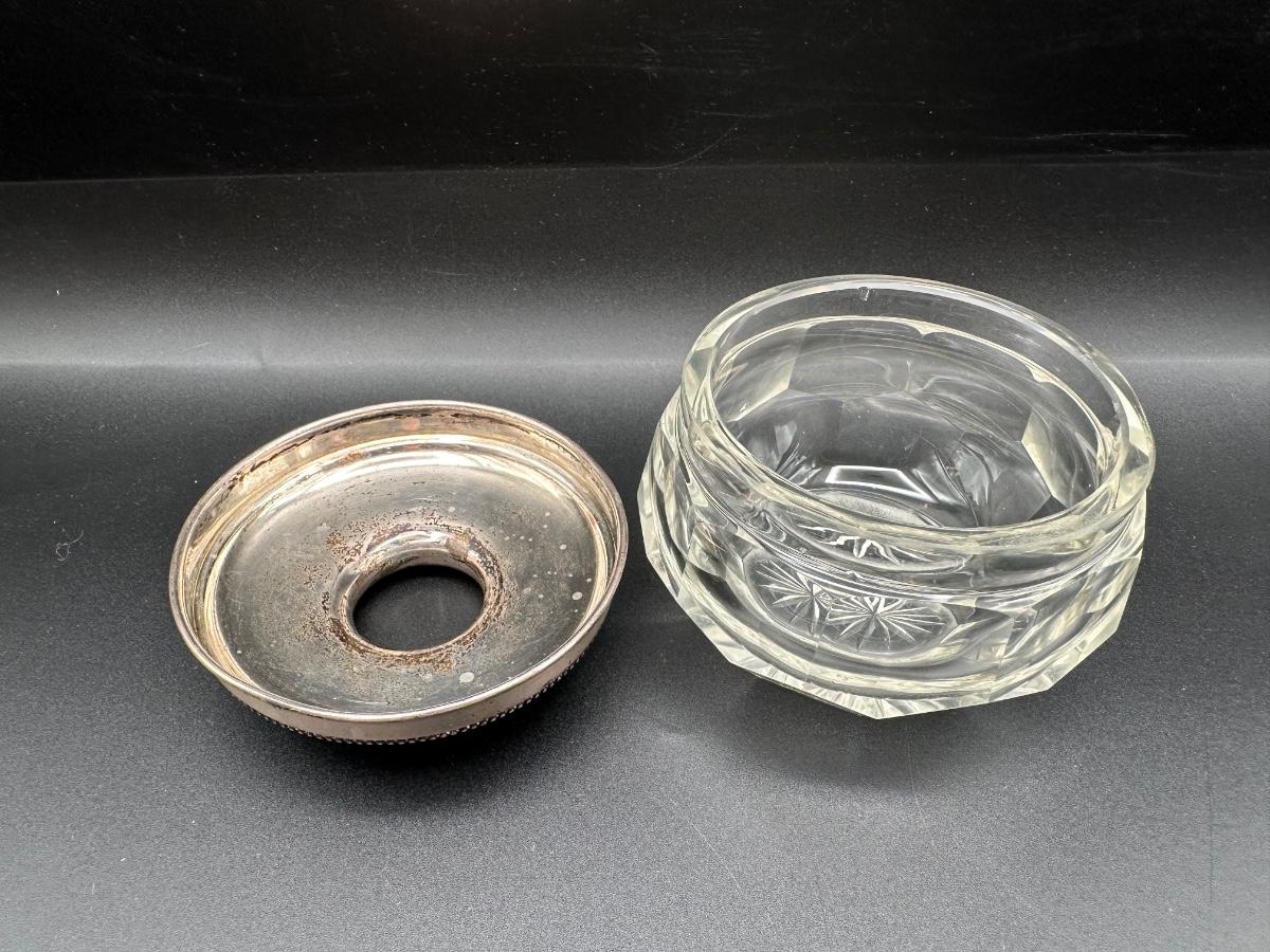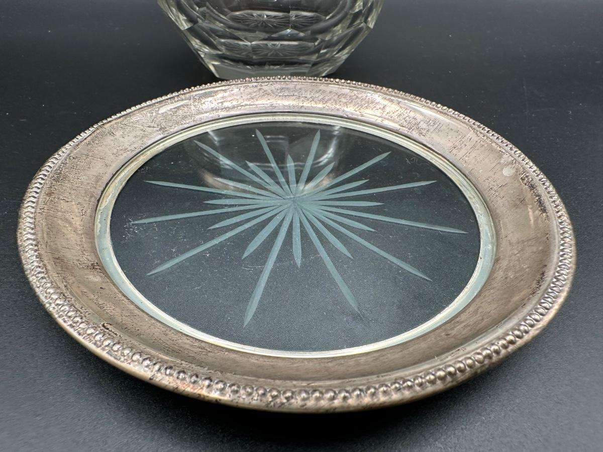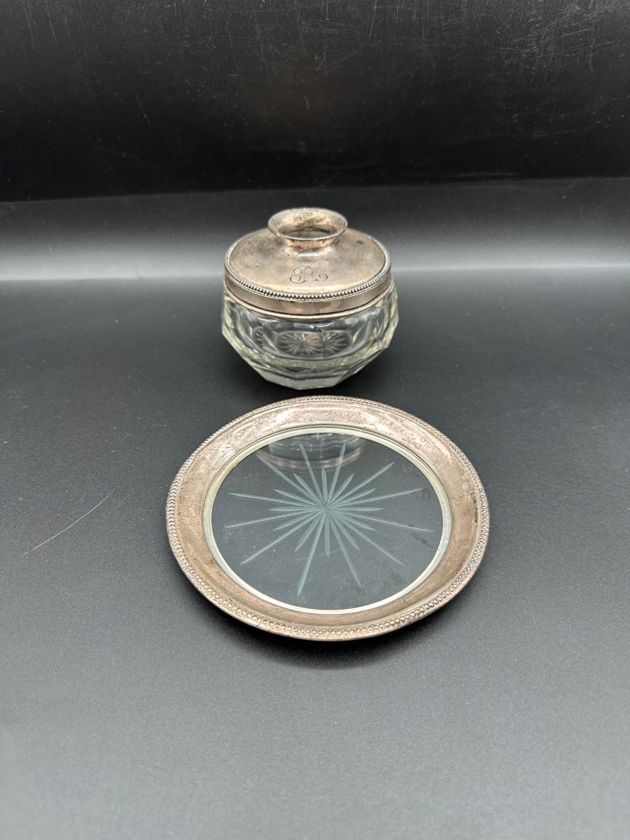 Sterling Silver & Cut Glass Vanity Jar with Sterling Rim Glass Coaster