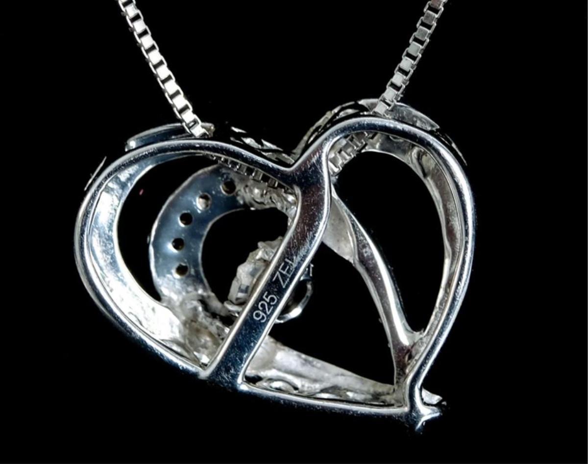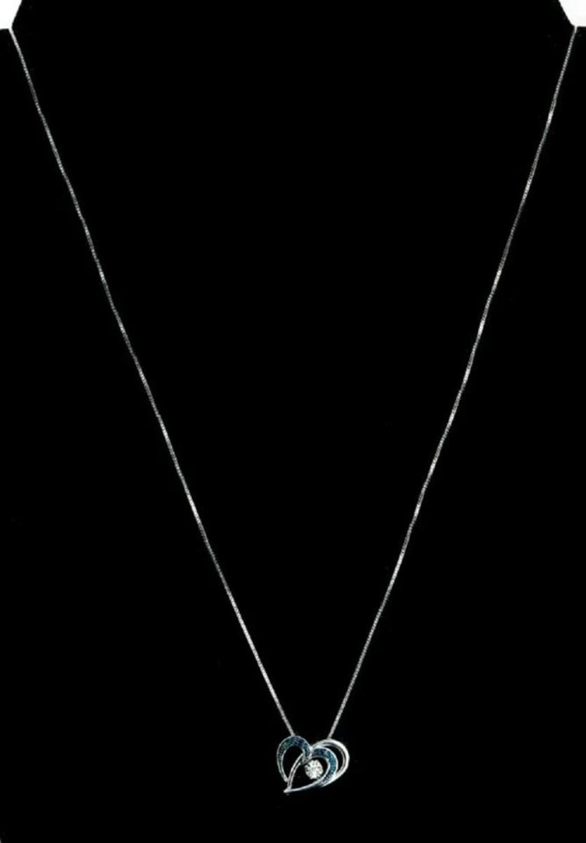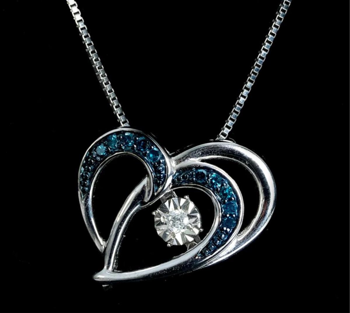 Sterling silver heart shaped slide pendant having brilliant cut diamond (0.02ct, Color: J, Clarity: SI) and Irradiated blue diamonds. Chain and pendant stamped 925. Chain length approx. 20", pendant .75" x .62", weight 3.5 grams.