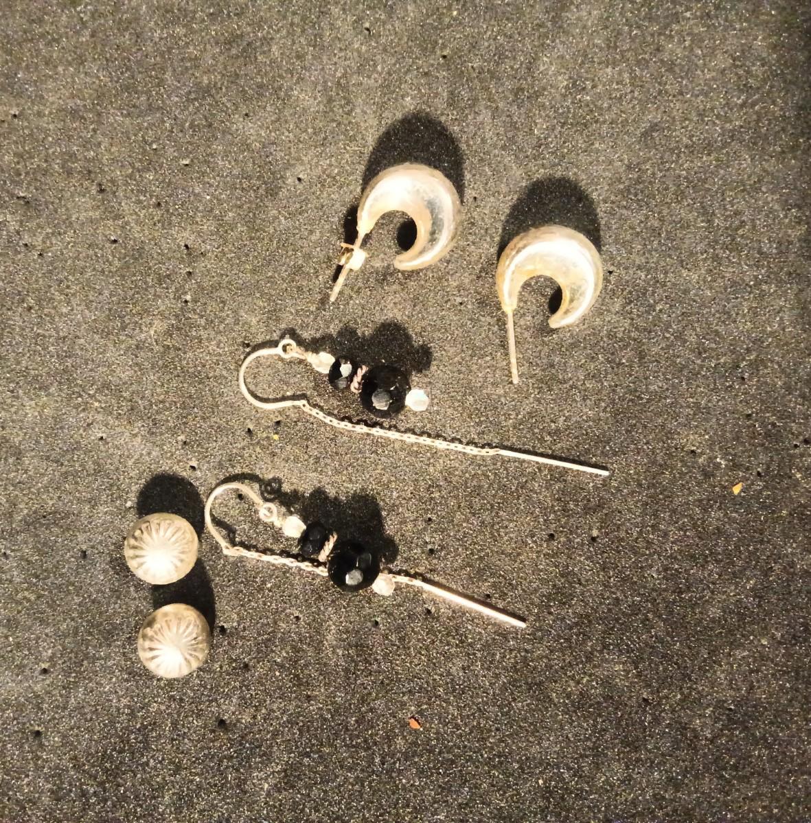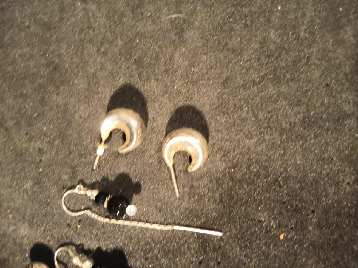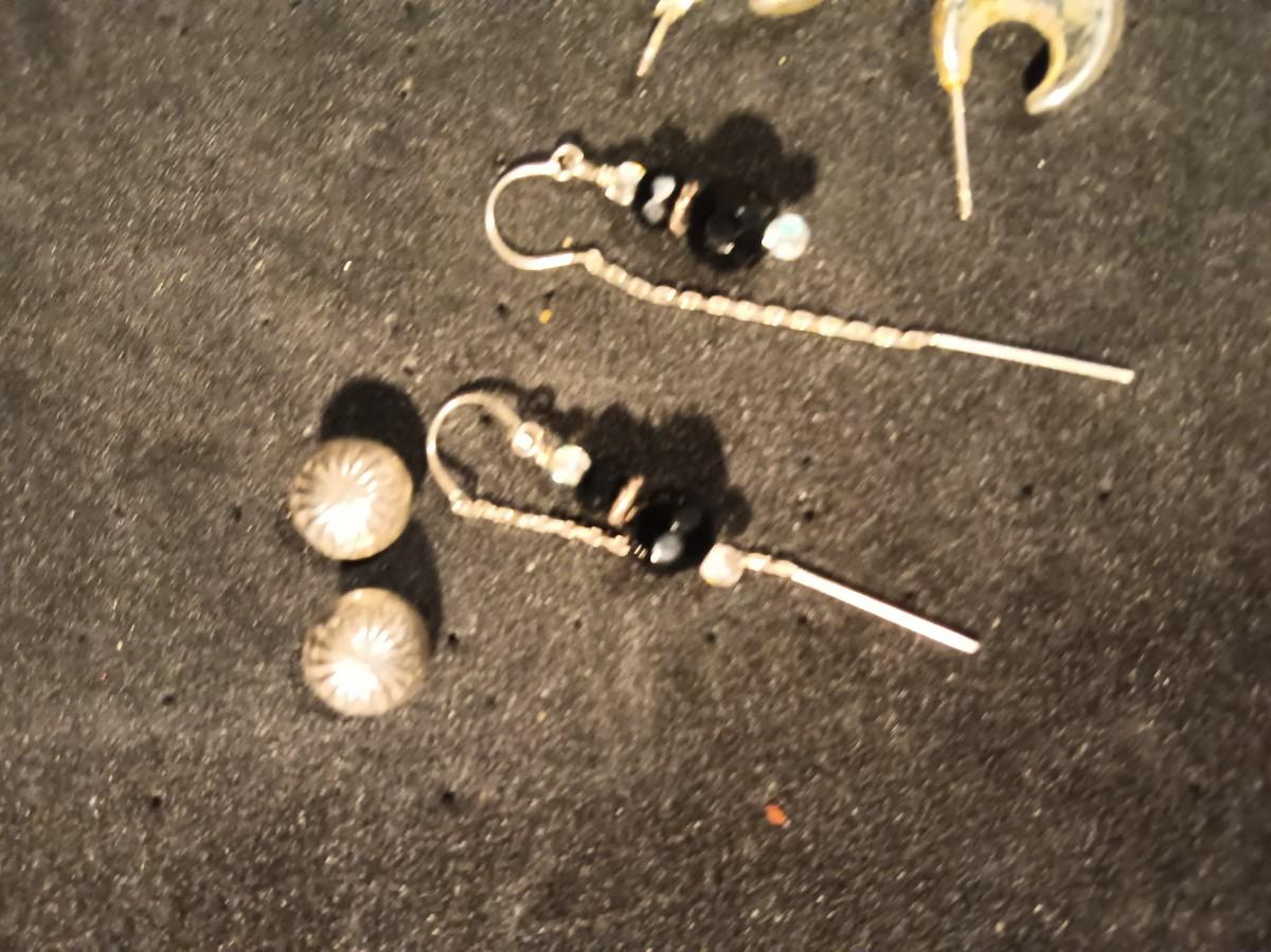 A PAIR OF SMALL HALF MOON SHAPED EARRINGS, ROUND STUDS, AND A PAIR OF DANGLE EARRINGS WITH BLACK BEADS