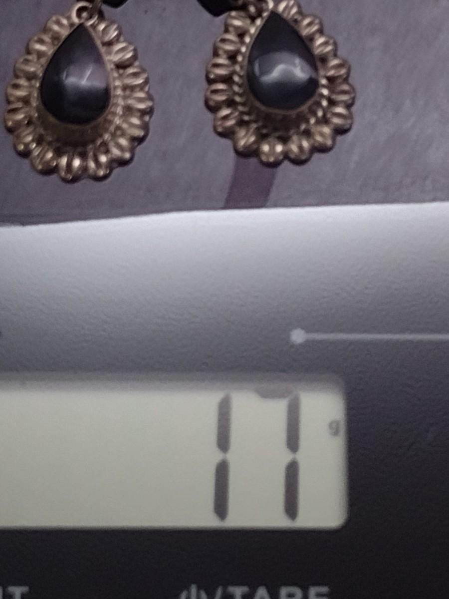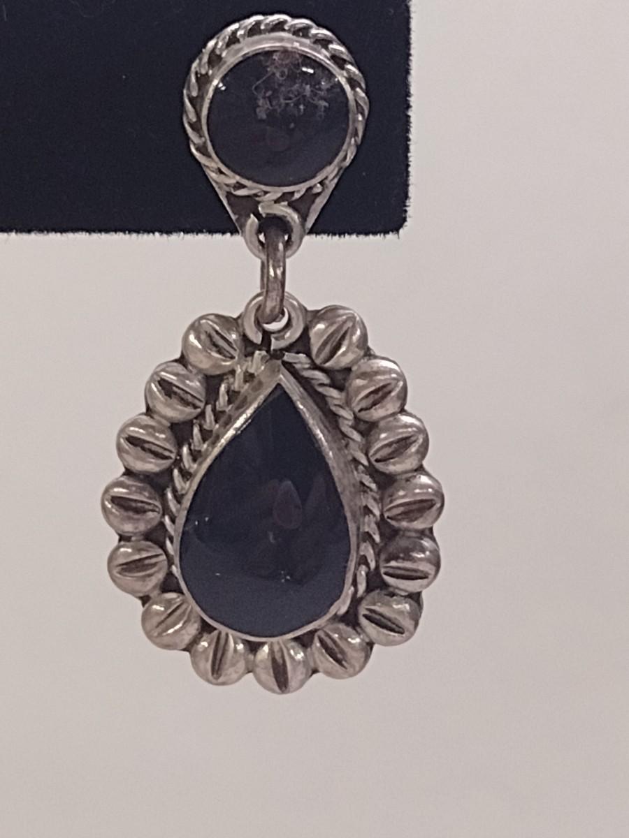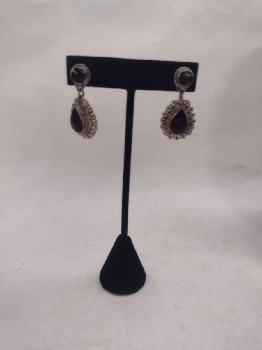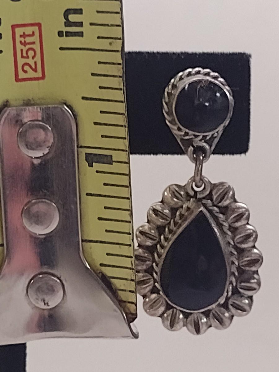 Sterling Silver Earrings (#34). Approx weight is 17 grams. Measure nearly 1 ½" tall. Possible onyx