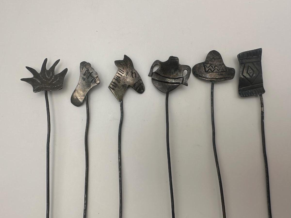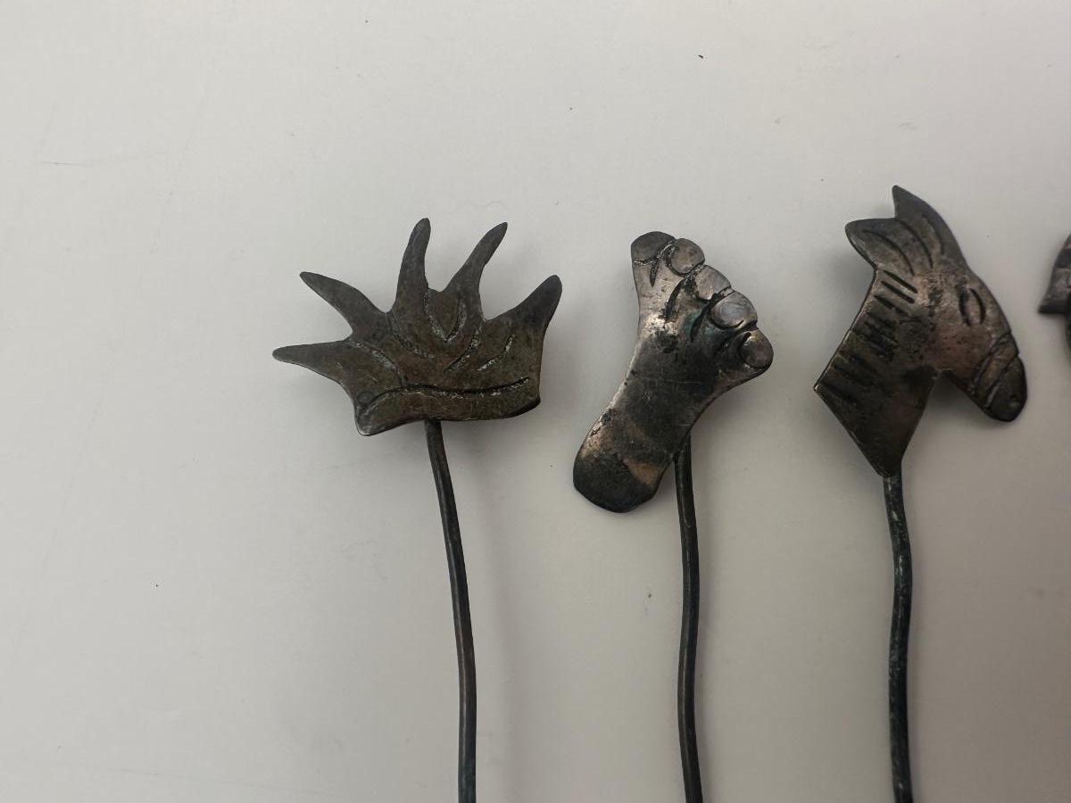 Set of six vintage sterling silver cocktail picks / hors d’oeuvre forks with long wire stems and decorative figural tops.